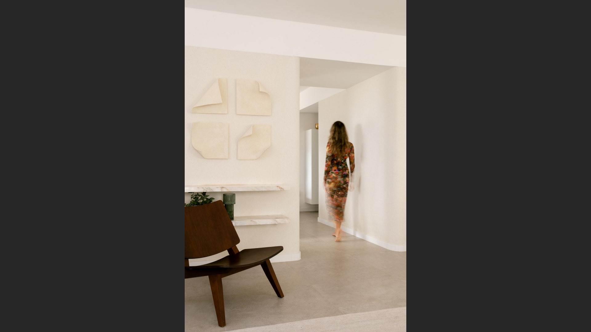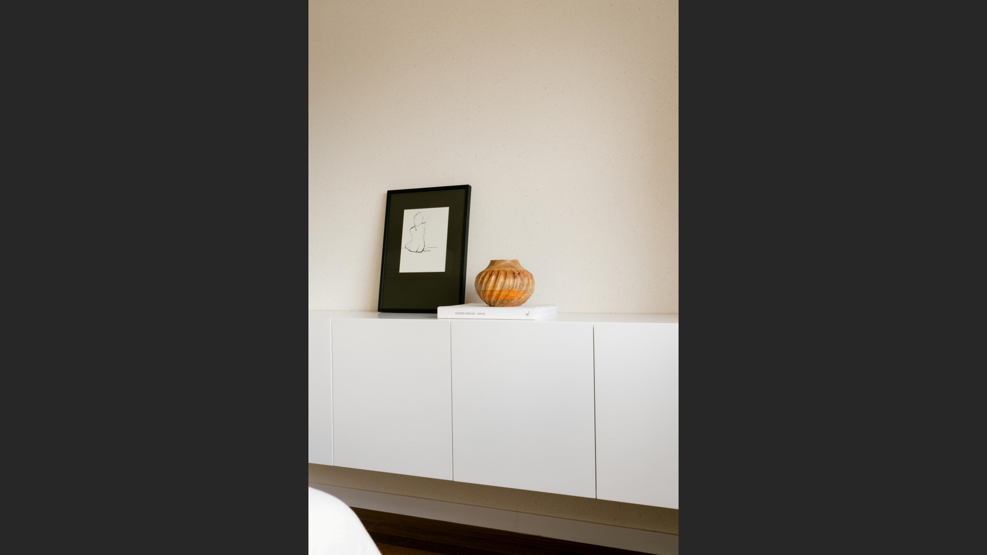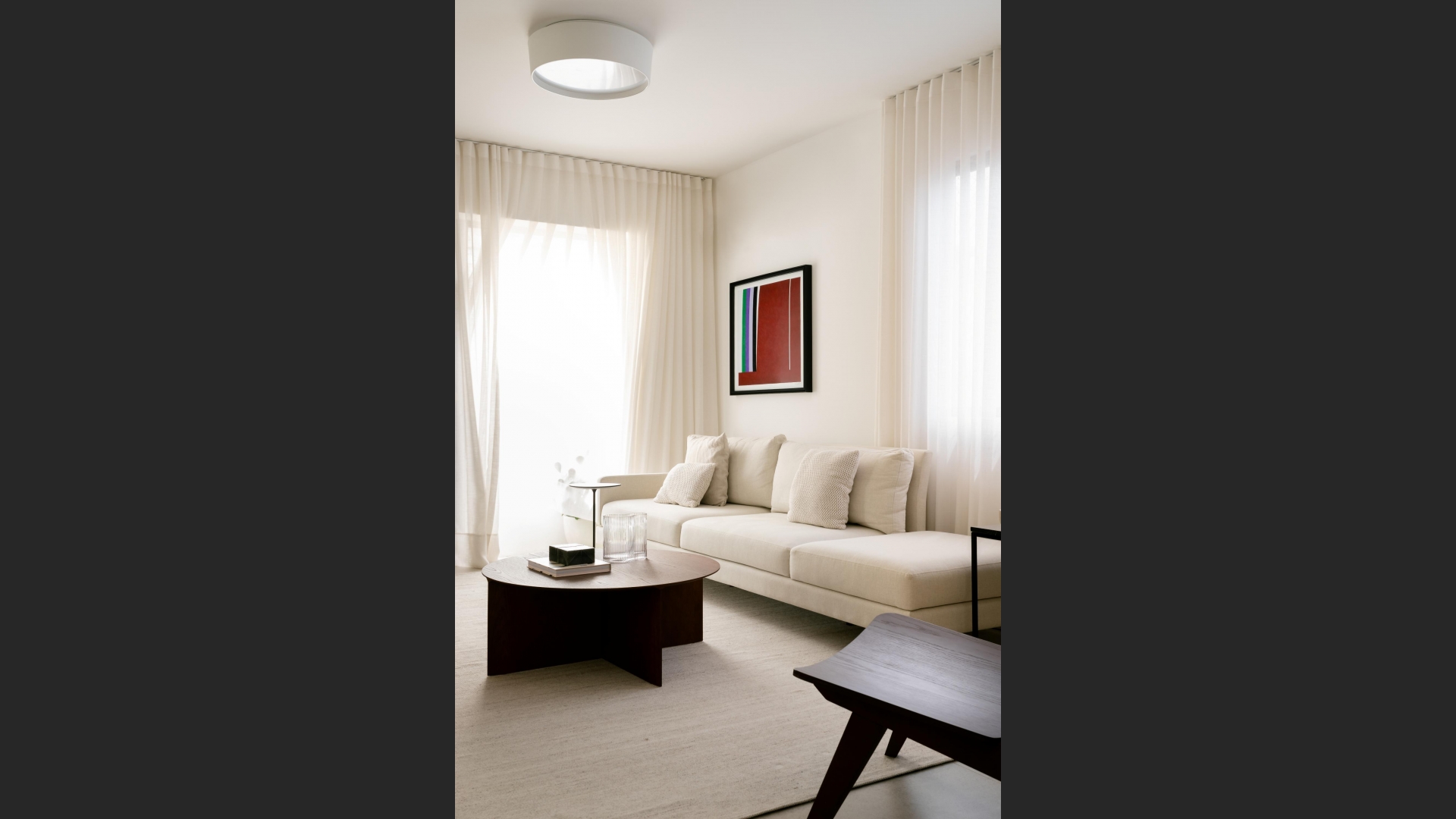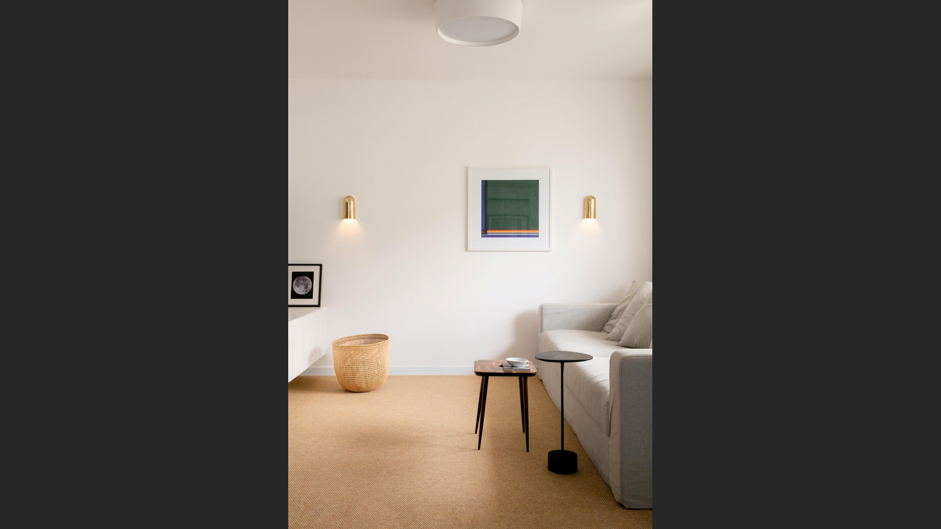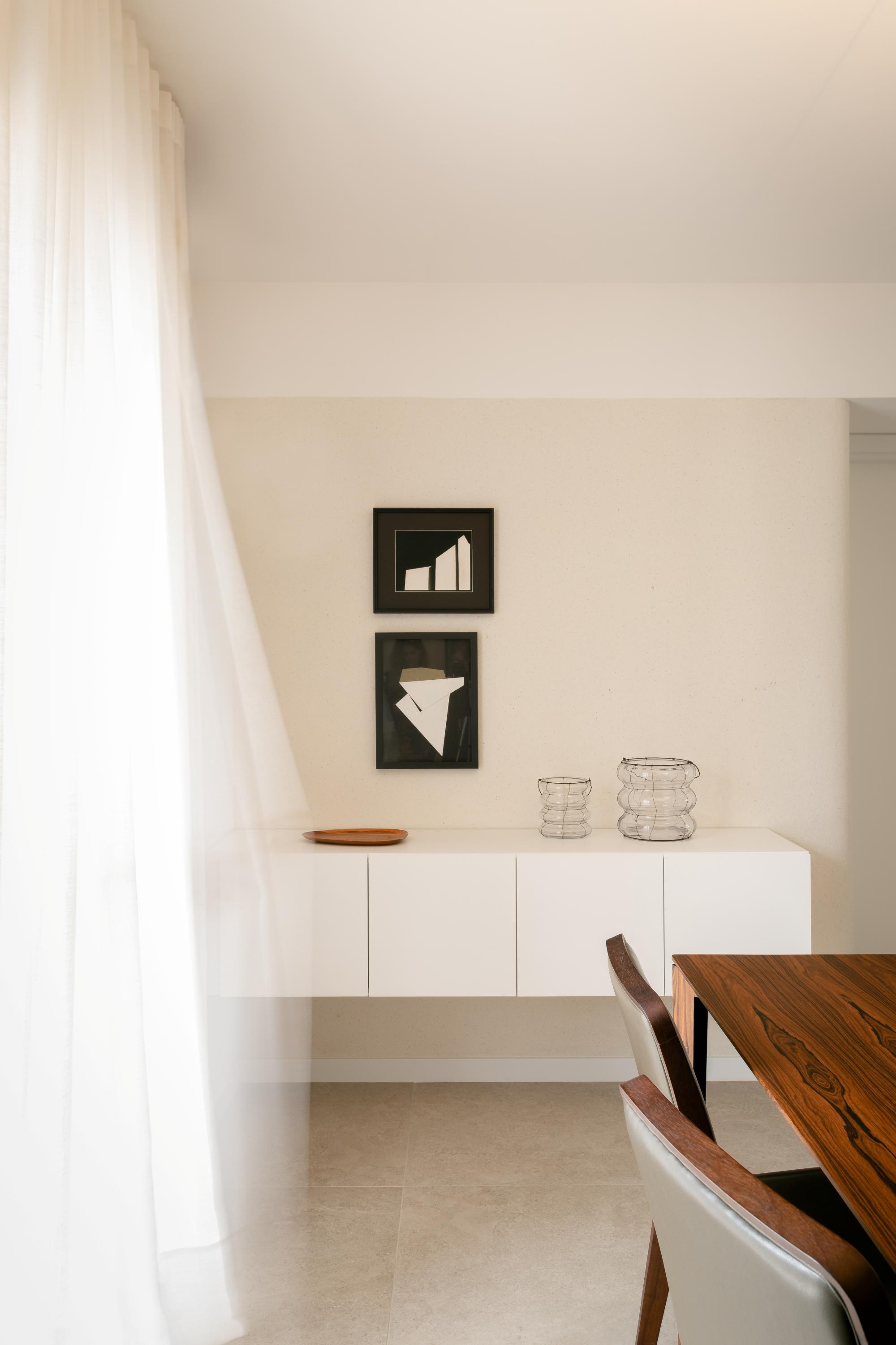 Em tom sobre tom, tudo muito discreto para as obras de arte destacarem.