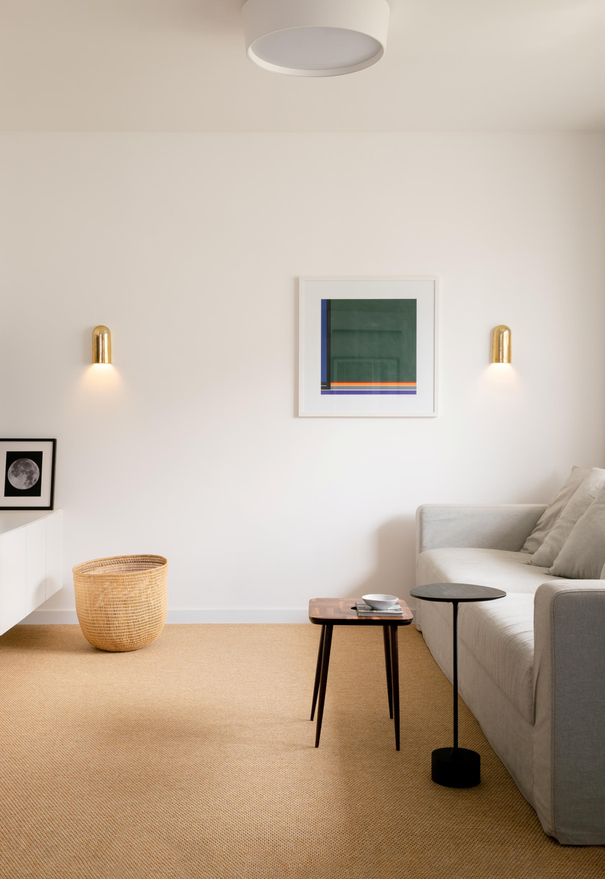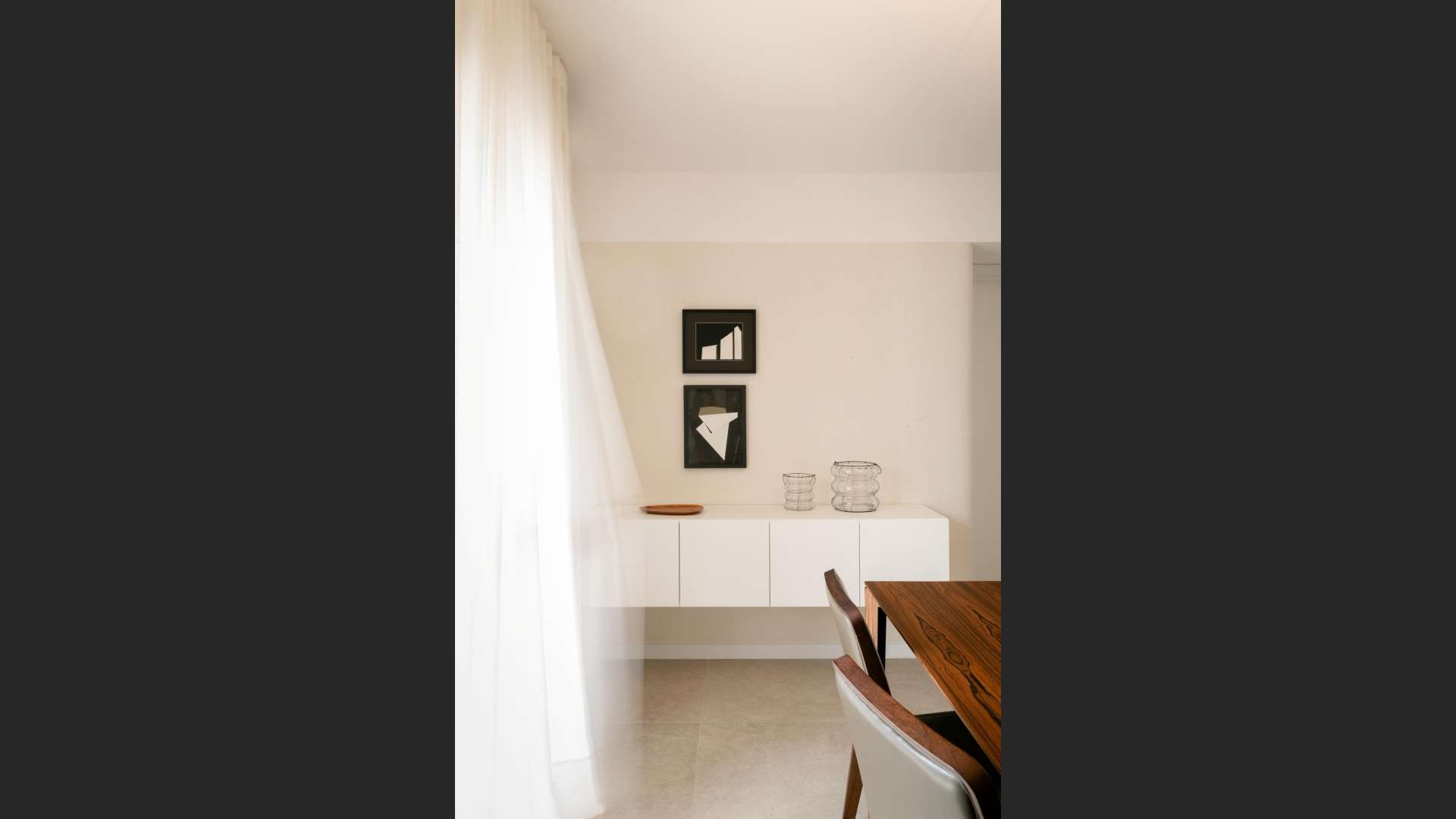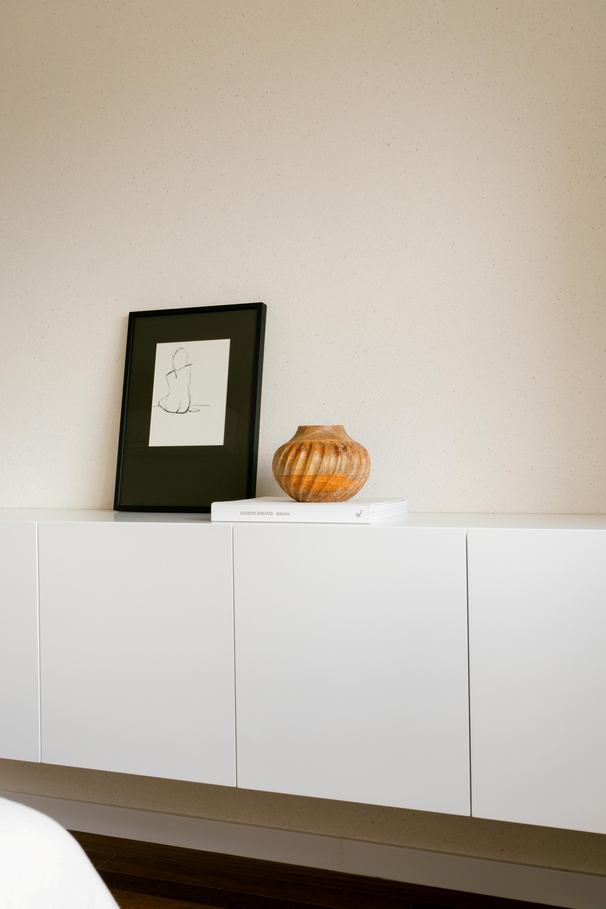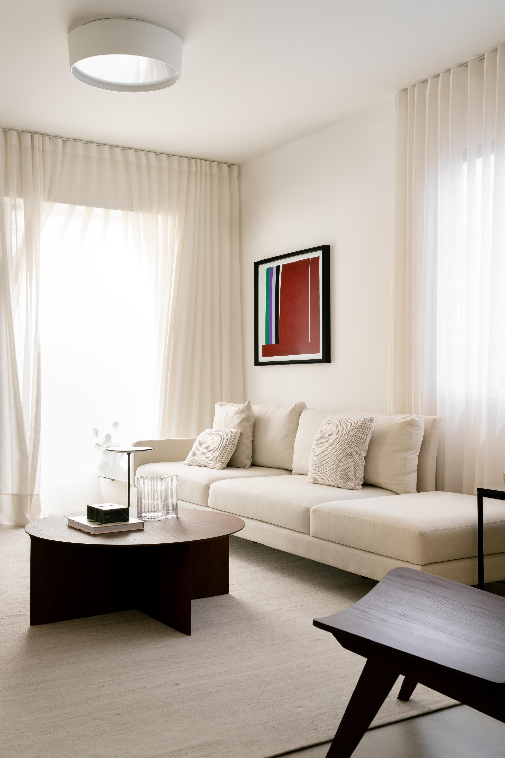 Em tom sobre tom, tudo muito discreto para as obras de arte destacarem.