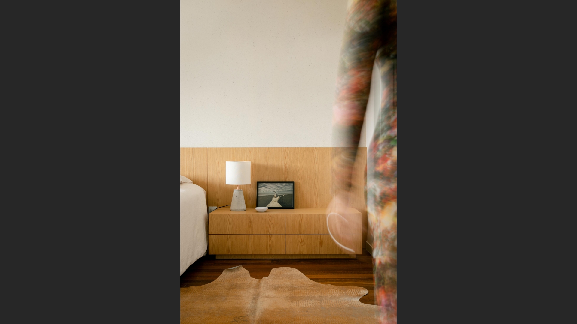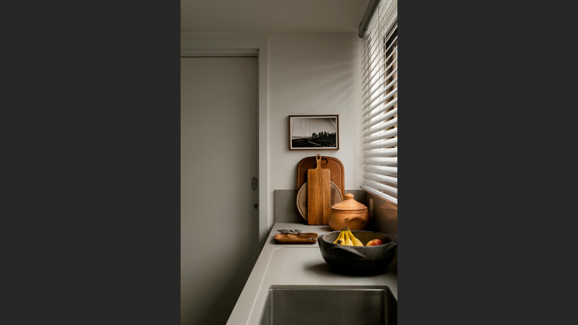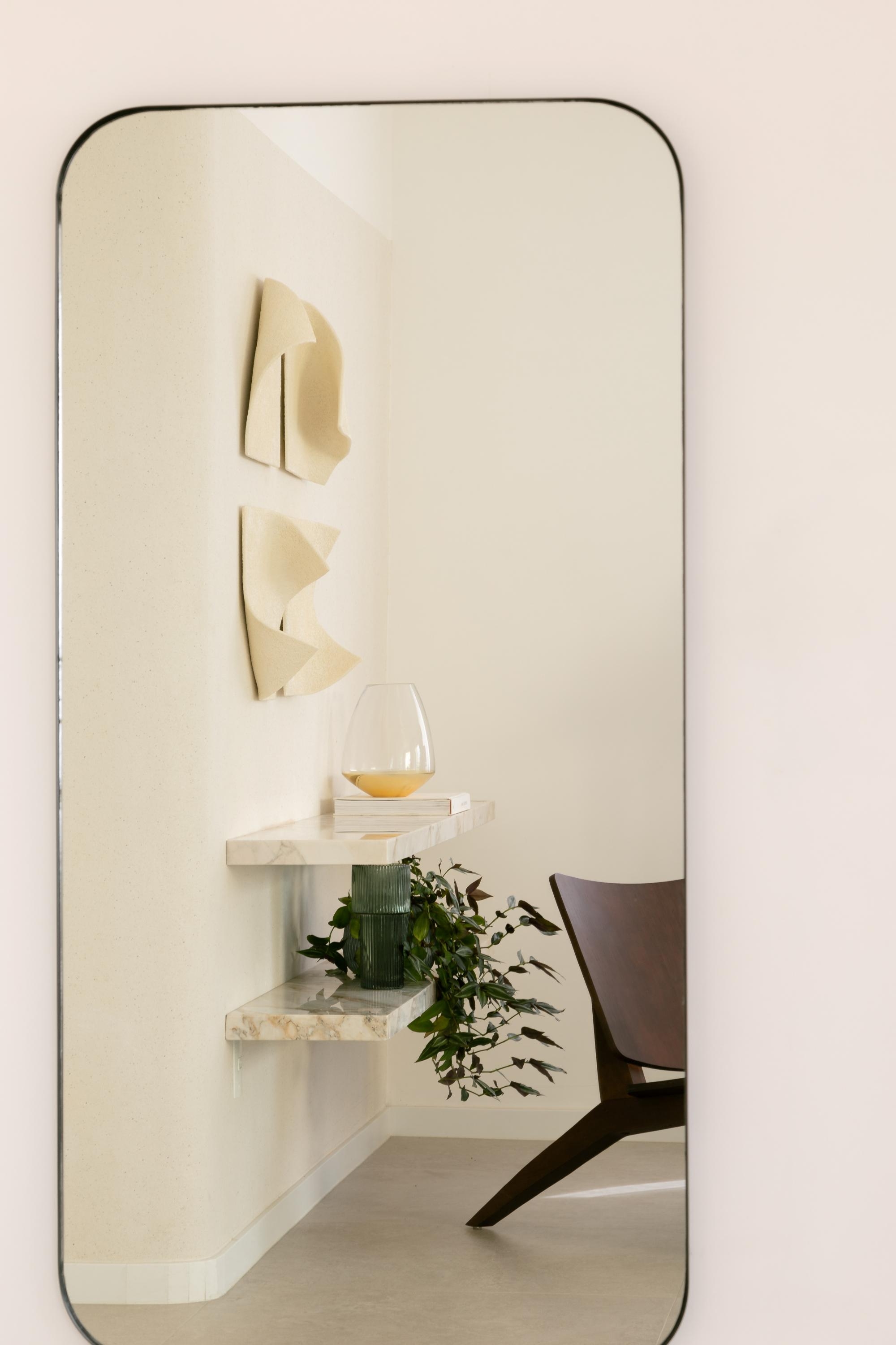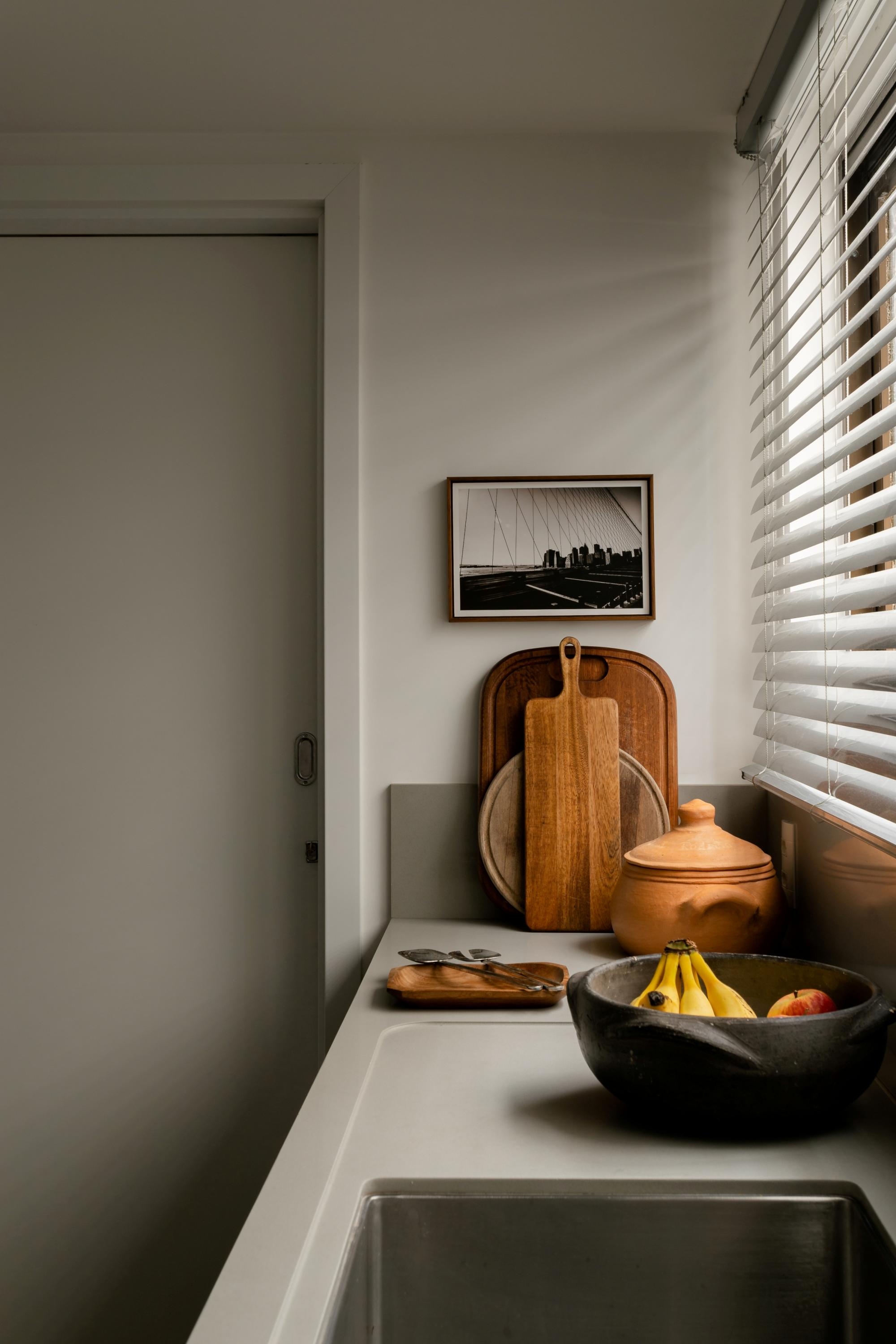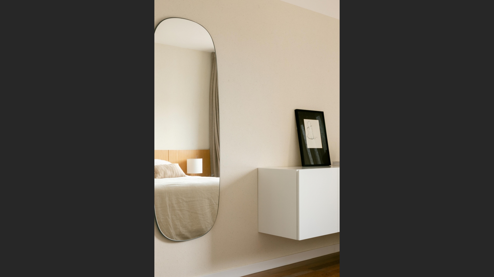 Em tom sobre tom, tudo muito discreto para as obras de arte destacarem.