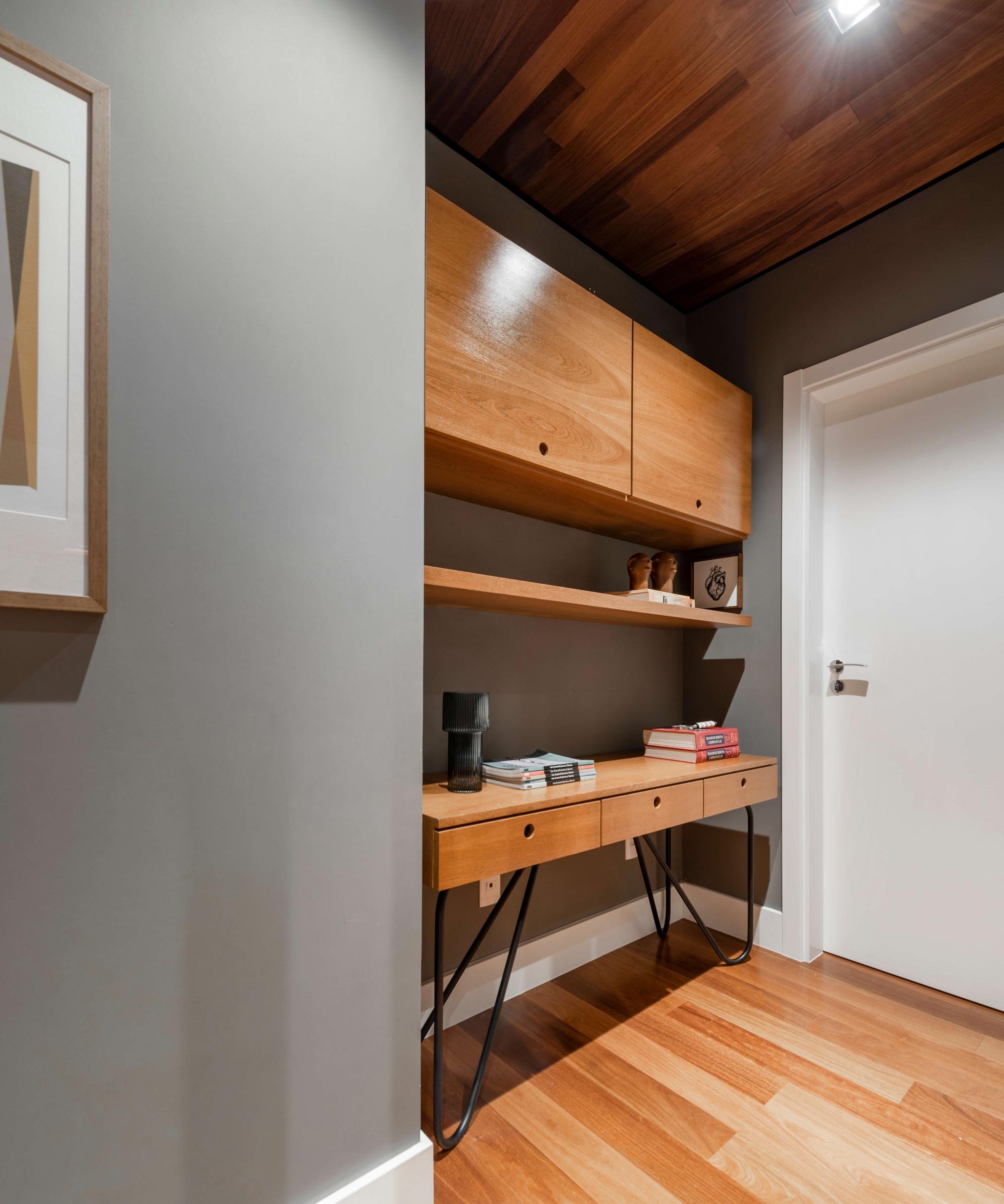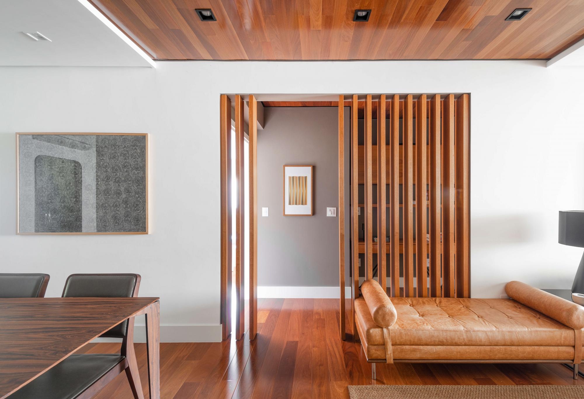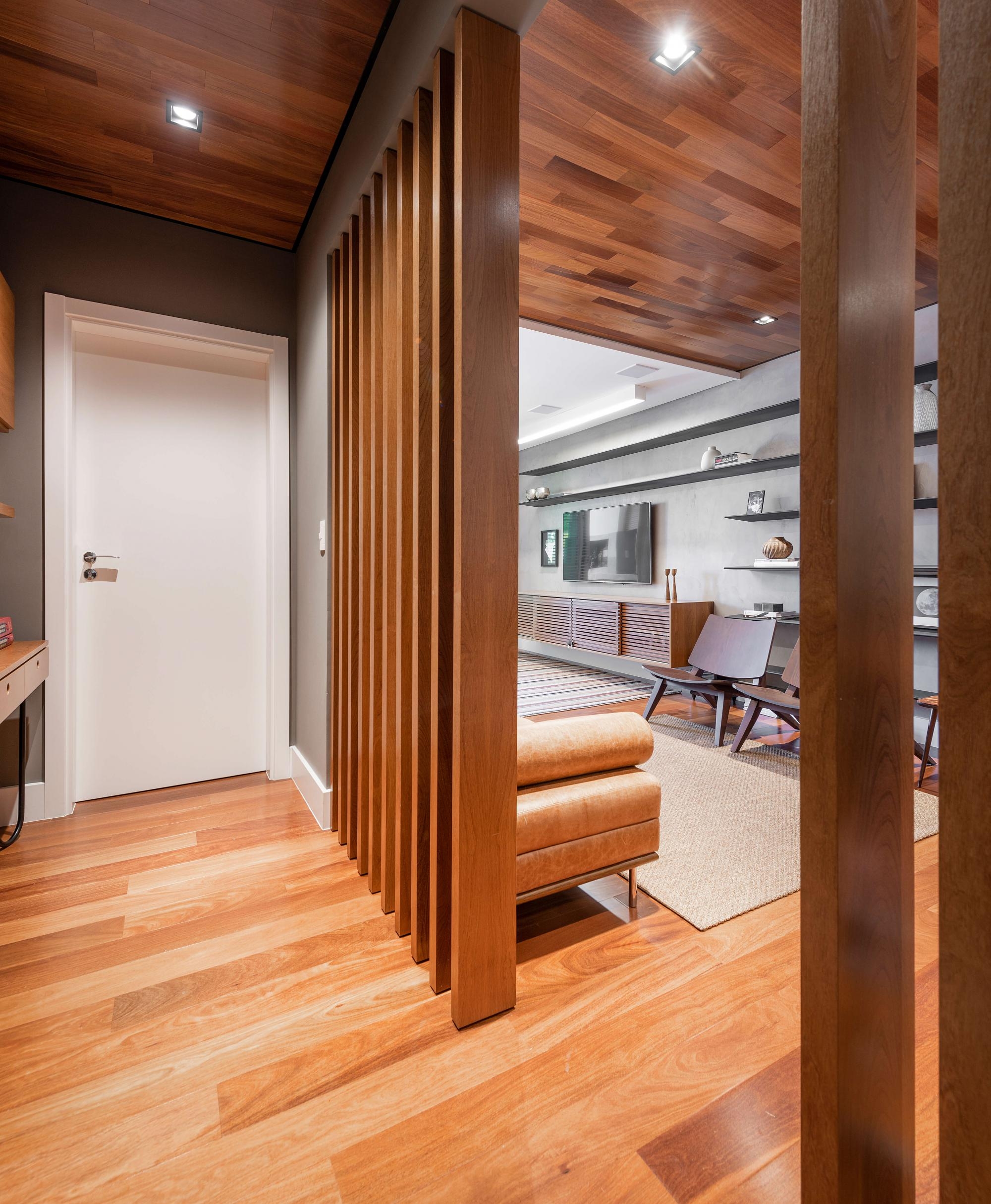 O hall dos quartos é protegido por uma divisória em réguas de Ipê. Ela dá privacidade ao escritório que fica no corredor.