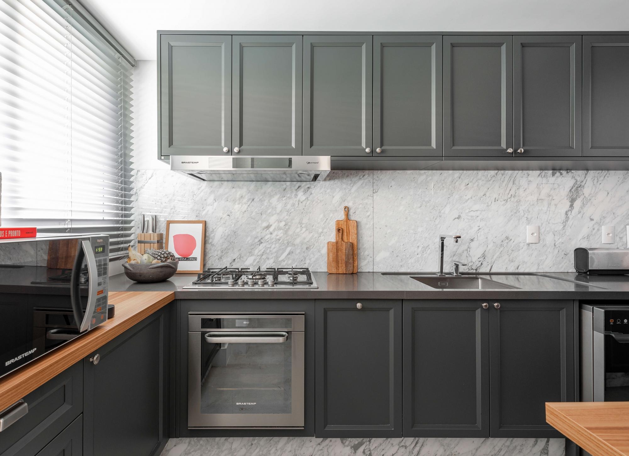 Na cozinha o “estilo” é explorado às últimas consequências, desde a porta com almofadas até os revestimentos de Carrara e tampos de quartzo e madeira.