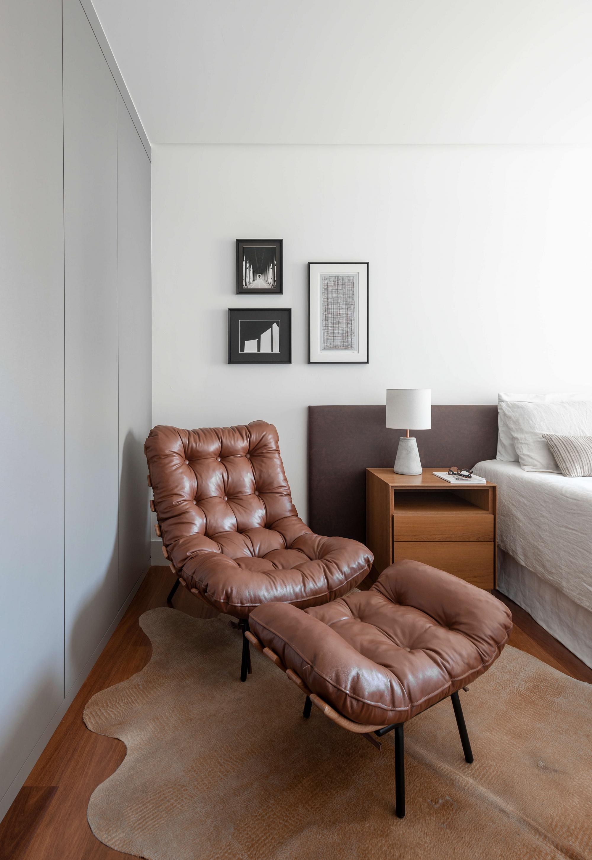 O layout do quarto do casal, abriu espaço para uma poltrona Costela.