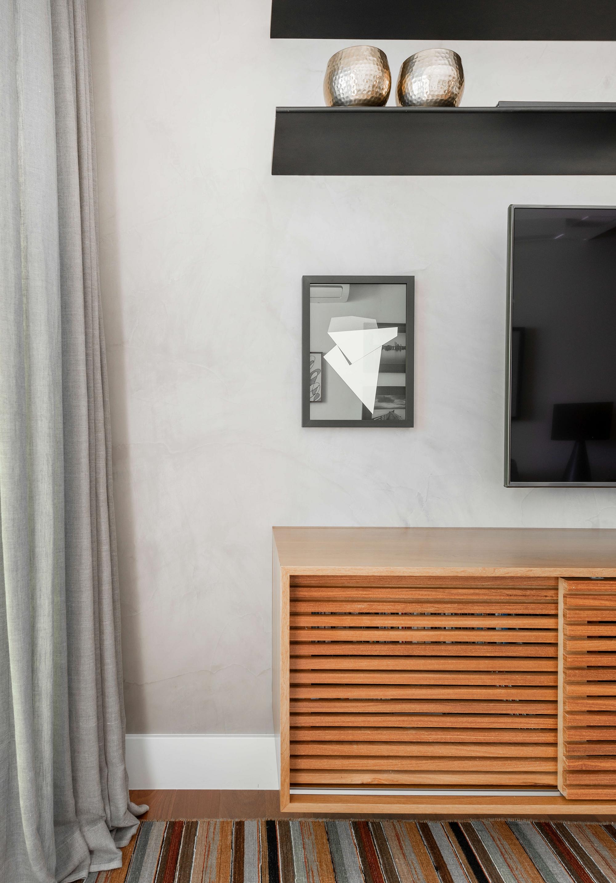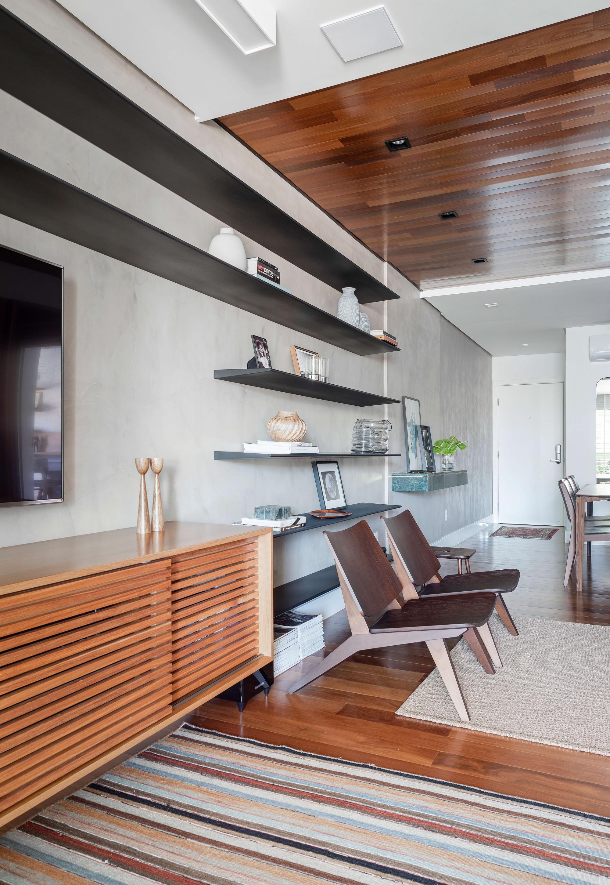 Tecnologia e artesanato colaboram na composição do ambiente. Da fina prateleira metálica sobre a pintura cimentícia até o tapete tramado em lã natural.