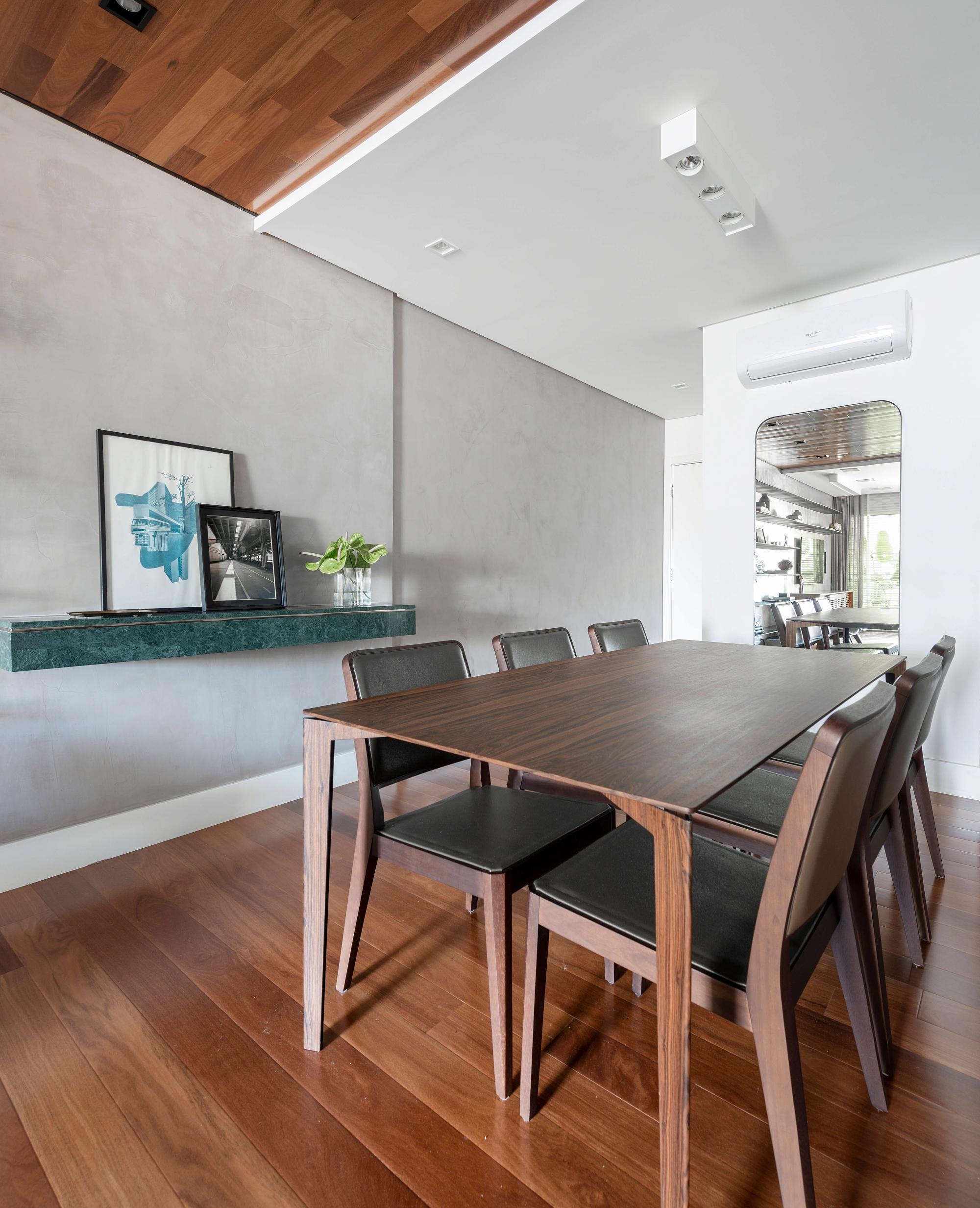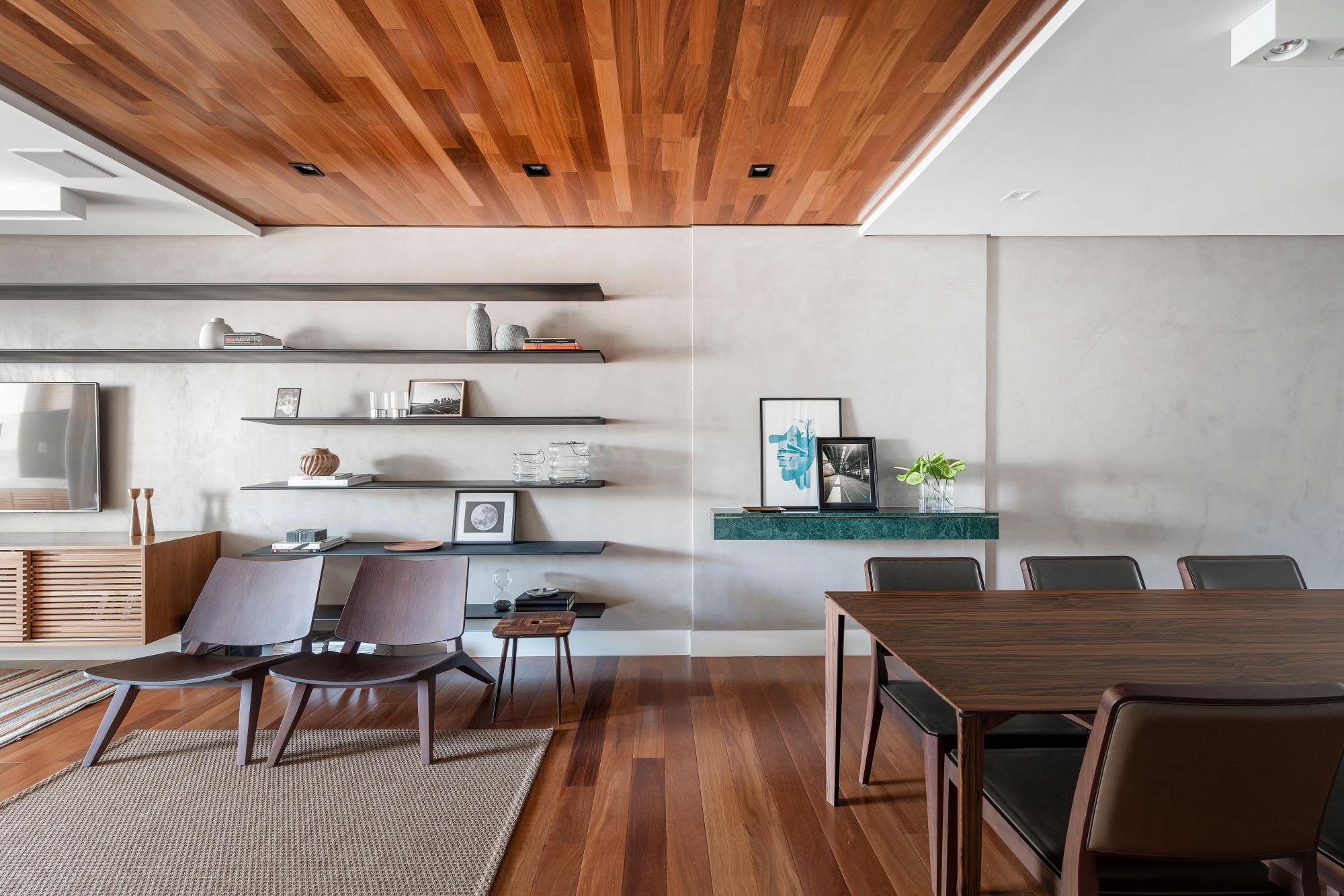 Nesse apartamento a madeira se impõe entre os demais elementos, monocromáticos.