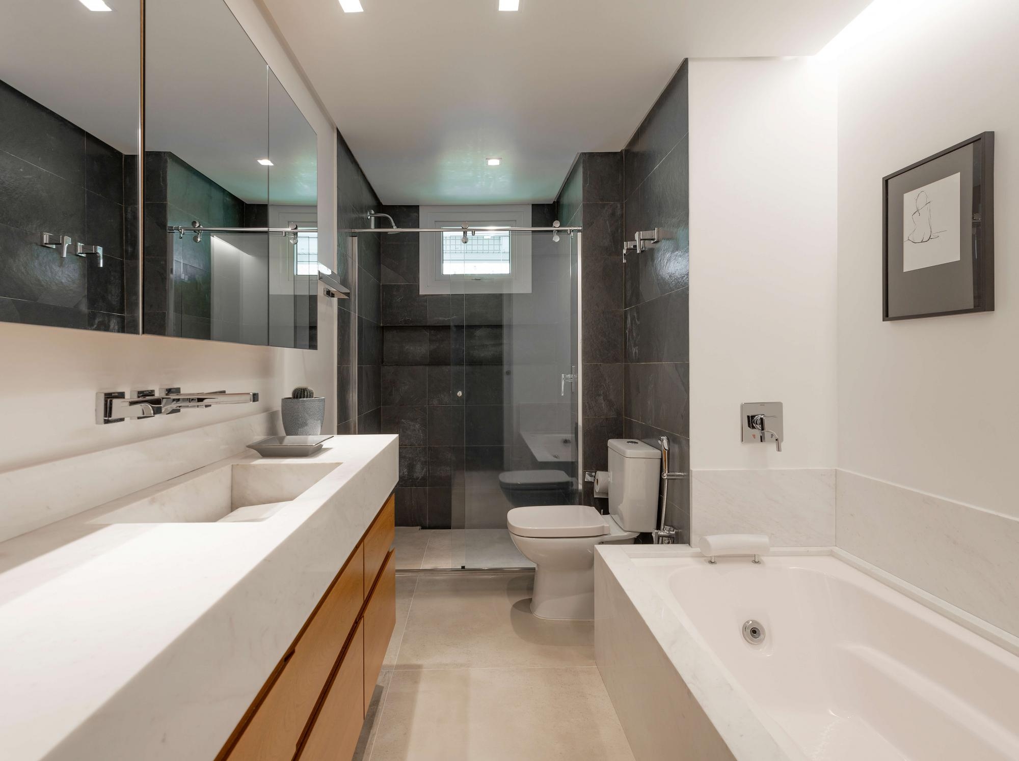 No banheiro do casal, a alteração de layout permitiu a inclusão da banheira. O revestimento de ardósia natural, colabora a configuração de diferentes ambientes.