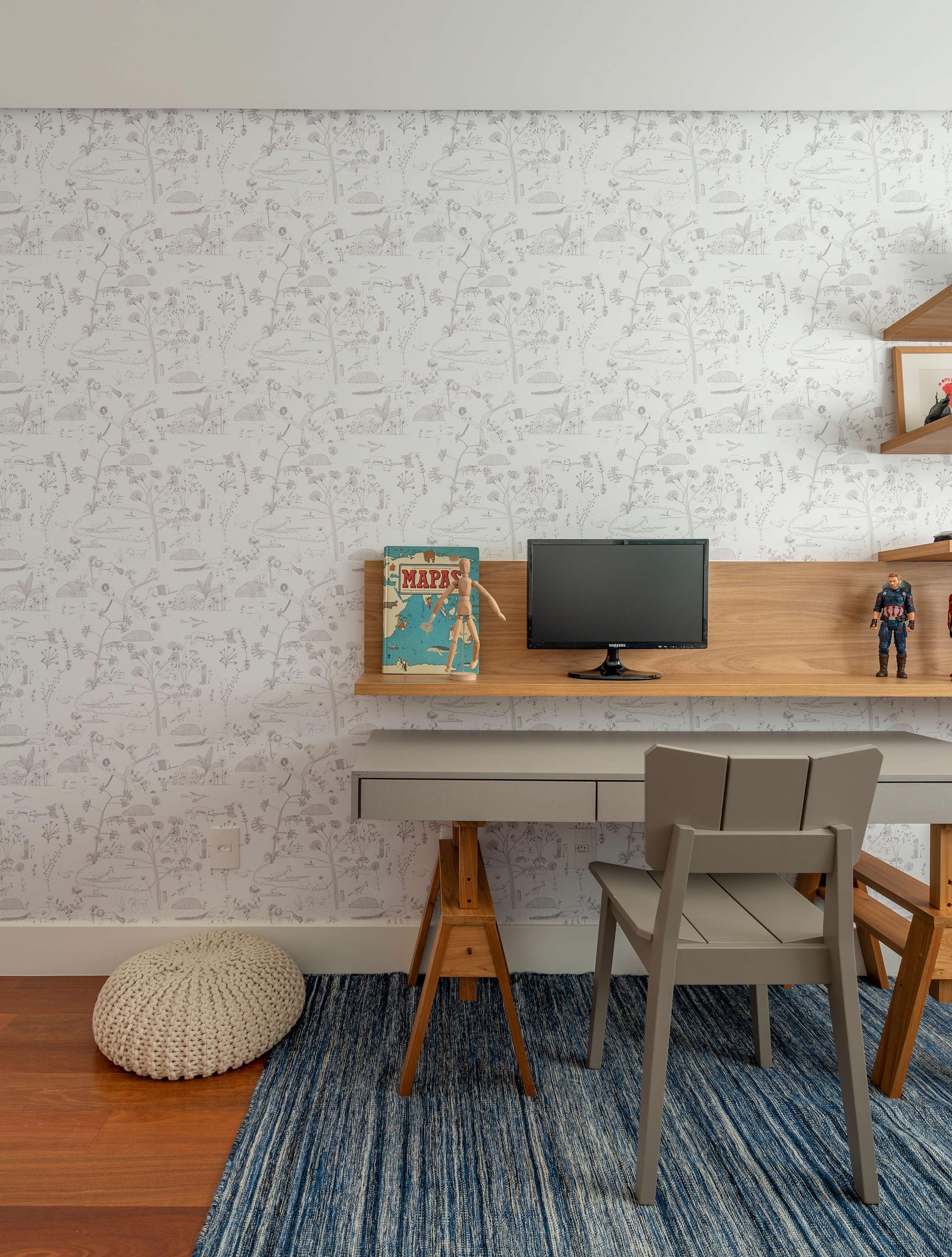 Para o filho, acabamentos naturais e uma bancada sobre cavaletes reguláveis garante um quarto que o acompanhará ao longo do tempo. Fotos Lio Simas