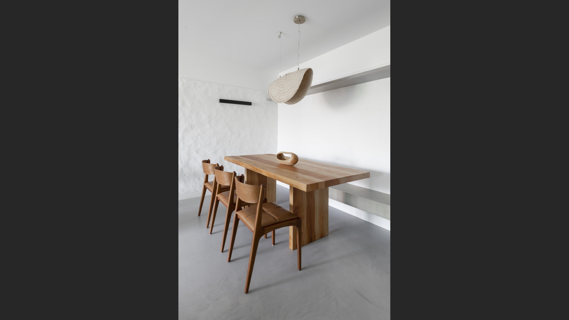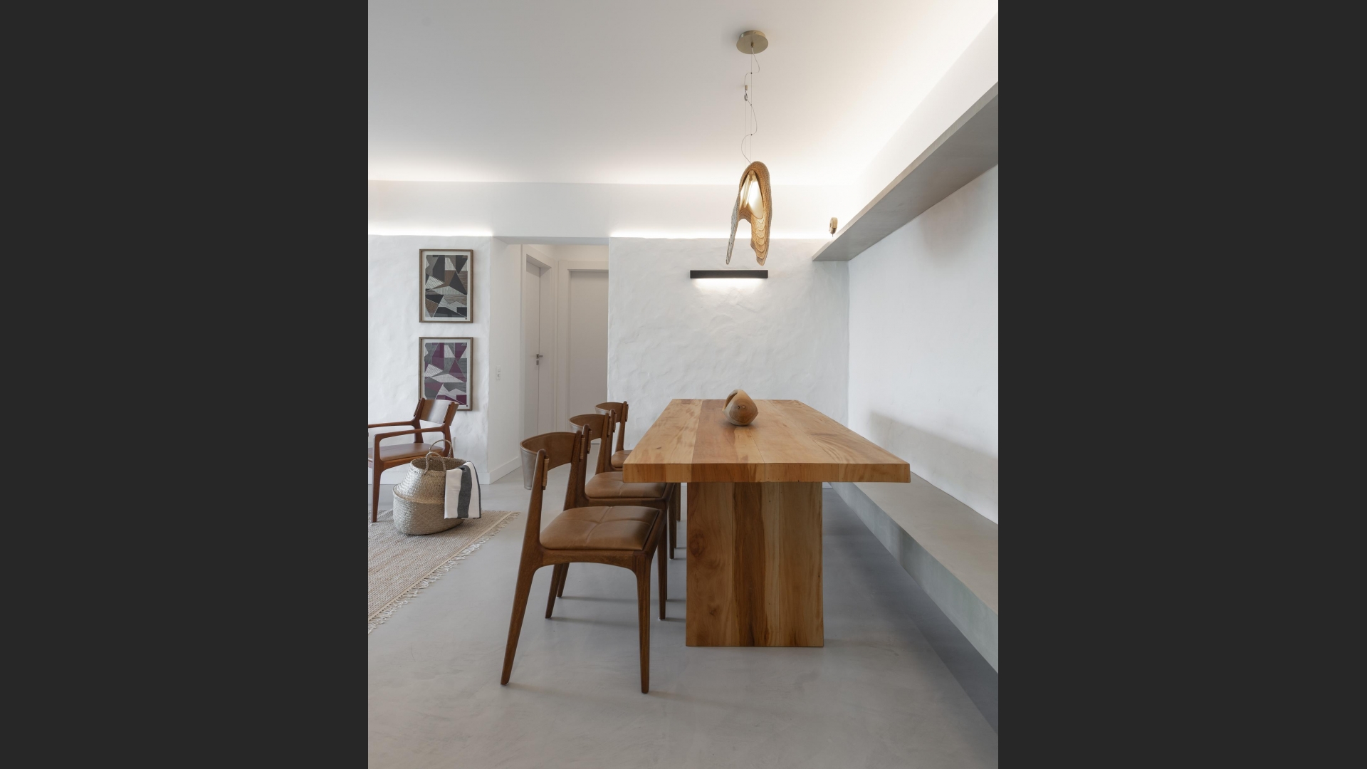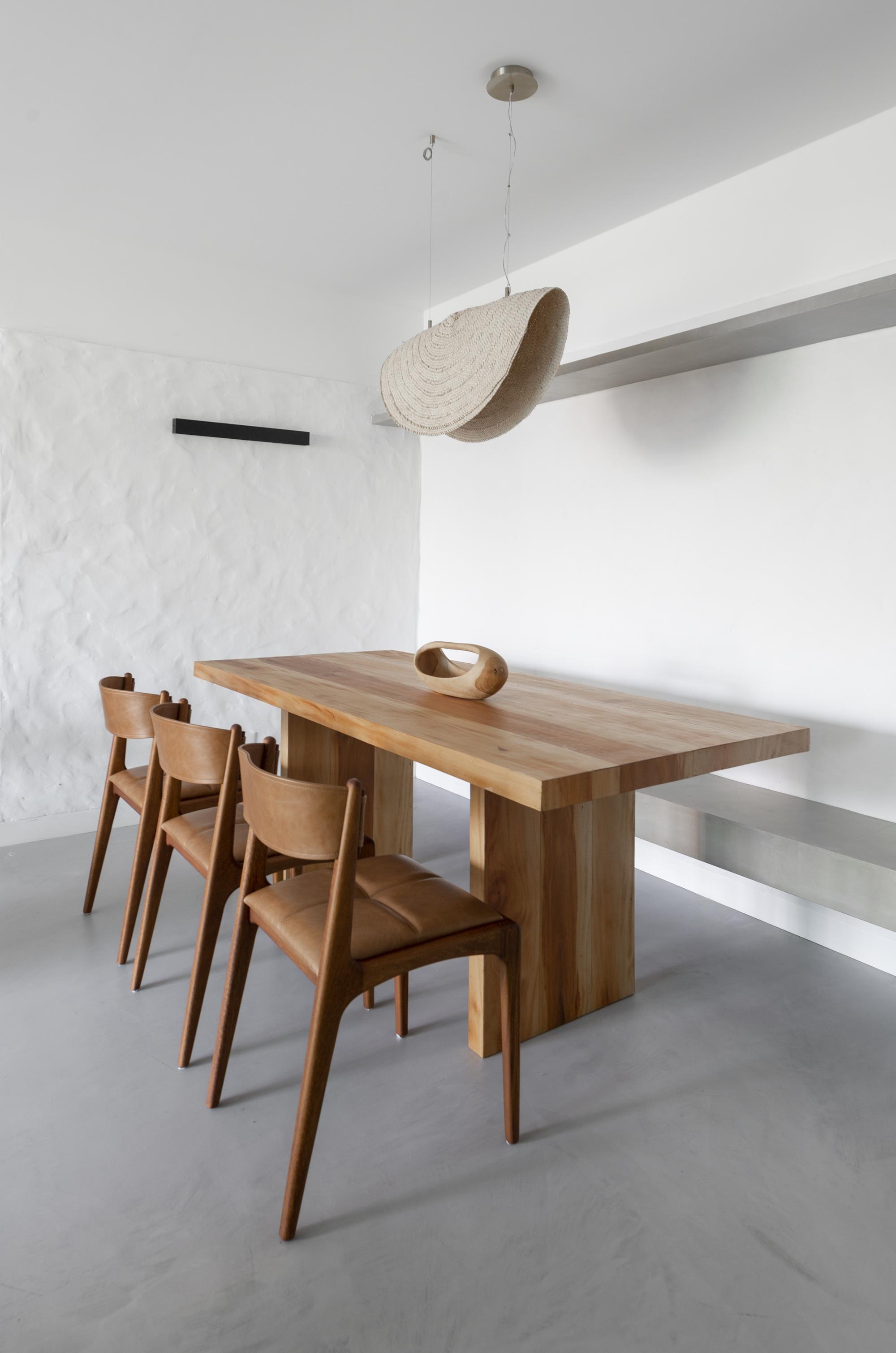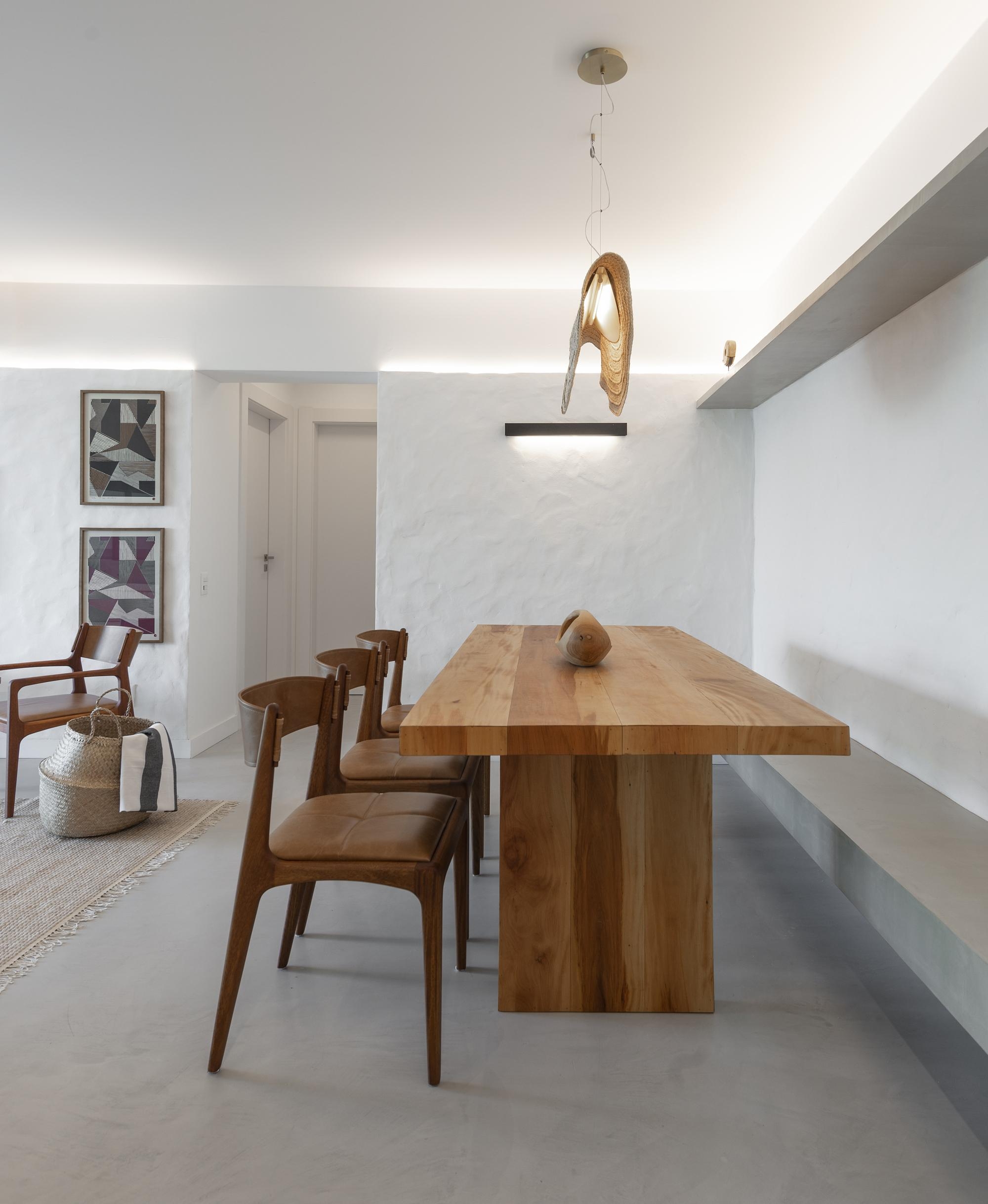 A mesa de jantar, em madeira de demolição, se encaixou entre as superfícies de reboco rústico, contra um banco fixado na parede, em balanço.