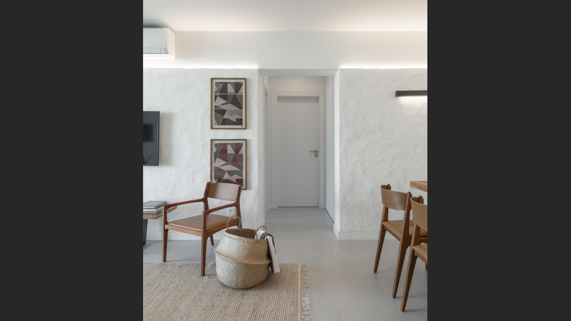 Nas paredes da sala, o ambiente mais lúdico, um reboco rústico destaca a volumetria e reforça as relações de claridade e sombra tanto da luz natural quanto da iluminação artificial.