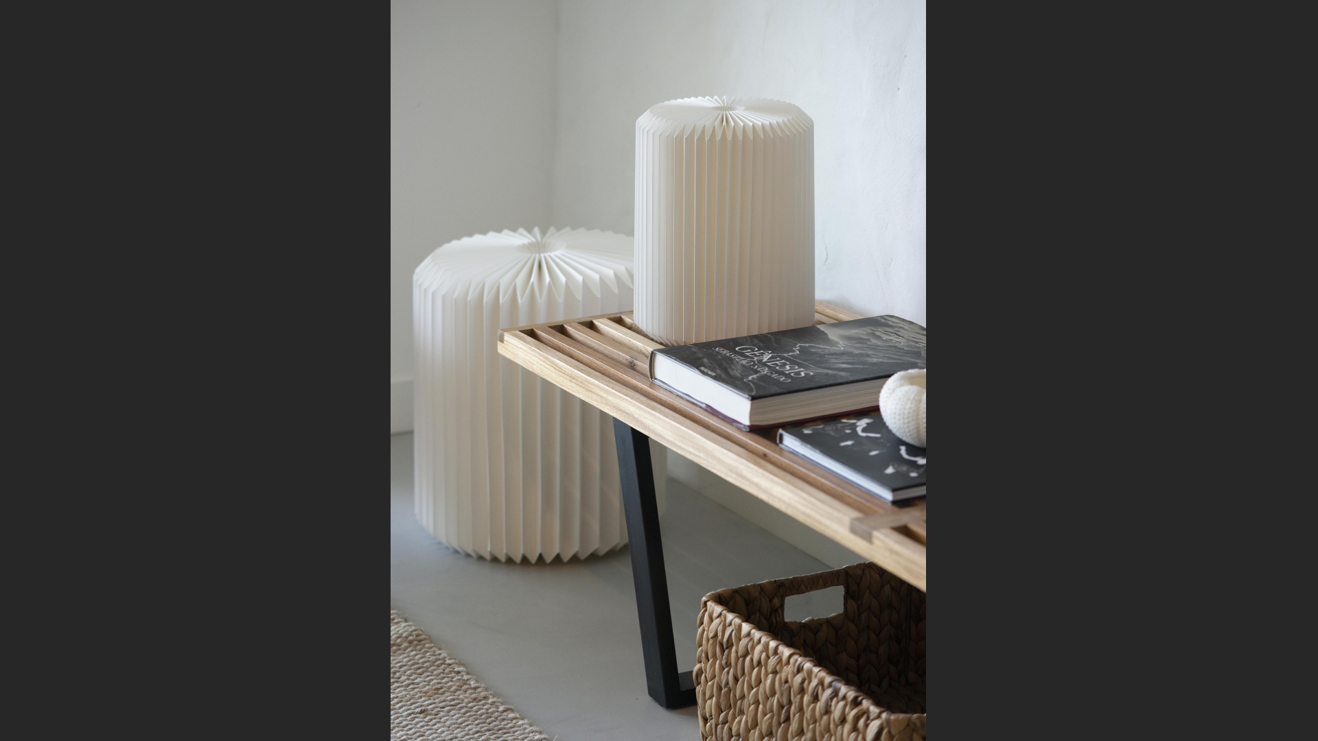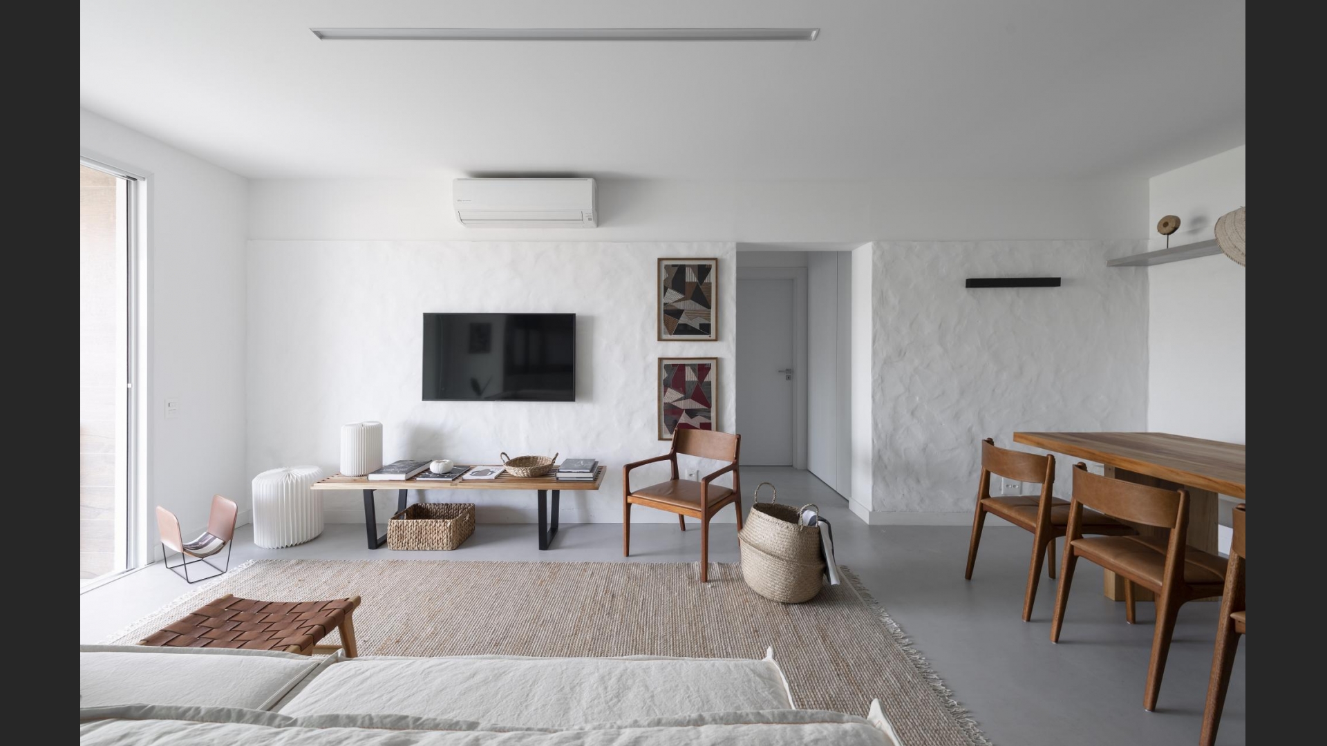 Respondendo à simplicidade das instalações sem fio, o espaço da TV é mobiliado por um banco, que também serve como apoio para o estar.