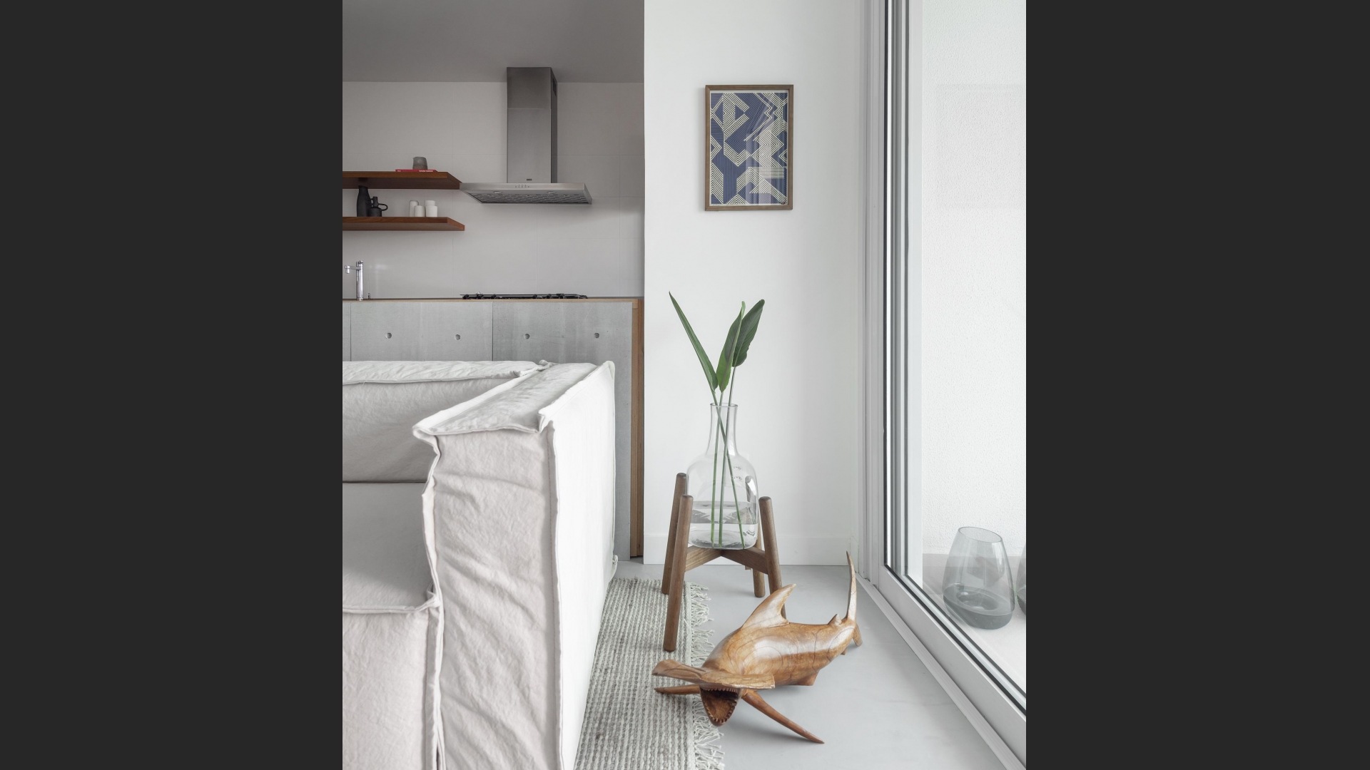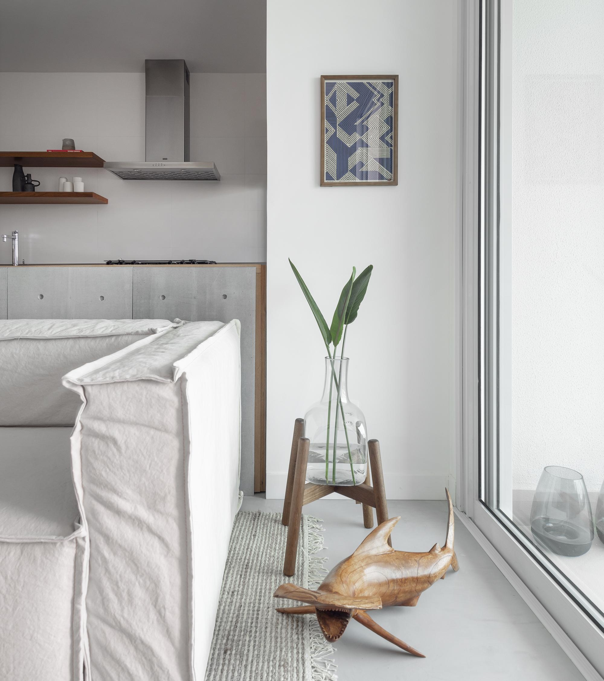Em todo o apartamento um piso monolítico auto-nivelante, de acabamento acetinado, cobriu o porcelanato brilhante entregue pela construtora. Uma solução rápida e limpa que evitou a produção de entulhos e alterou radicalmente a percepção do espaço.