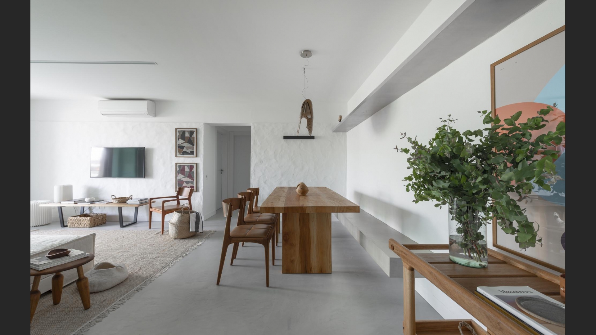 Entre a sala e a cozinha, ancorando o layout da área social um balcão de Tauari maciço, recebeu, na face externa, placas rústicas de concreto aparente.