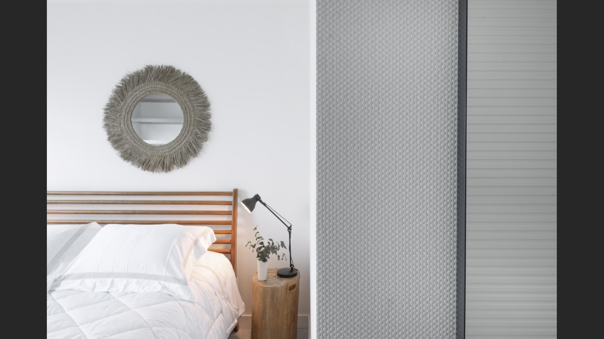 Paredes do quarto revestidas com fibra de vidro para conforto acústico e visual.