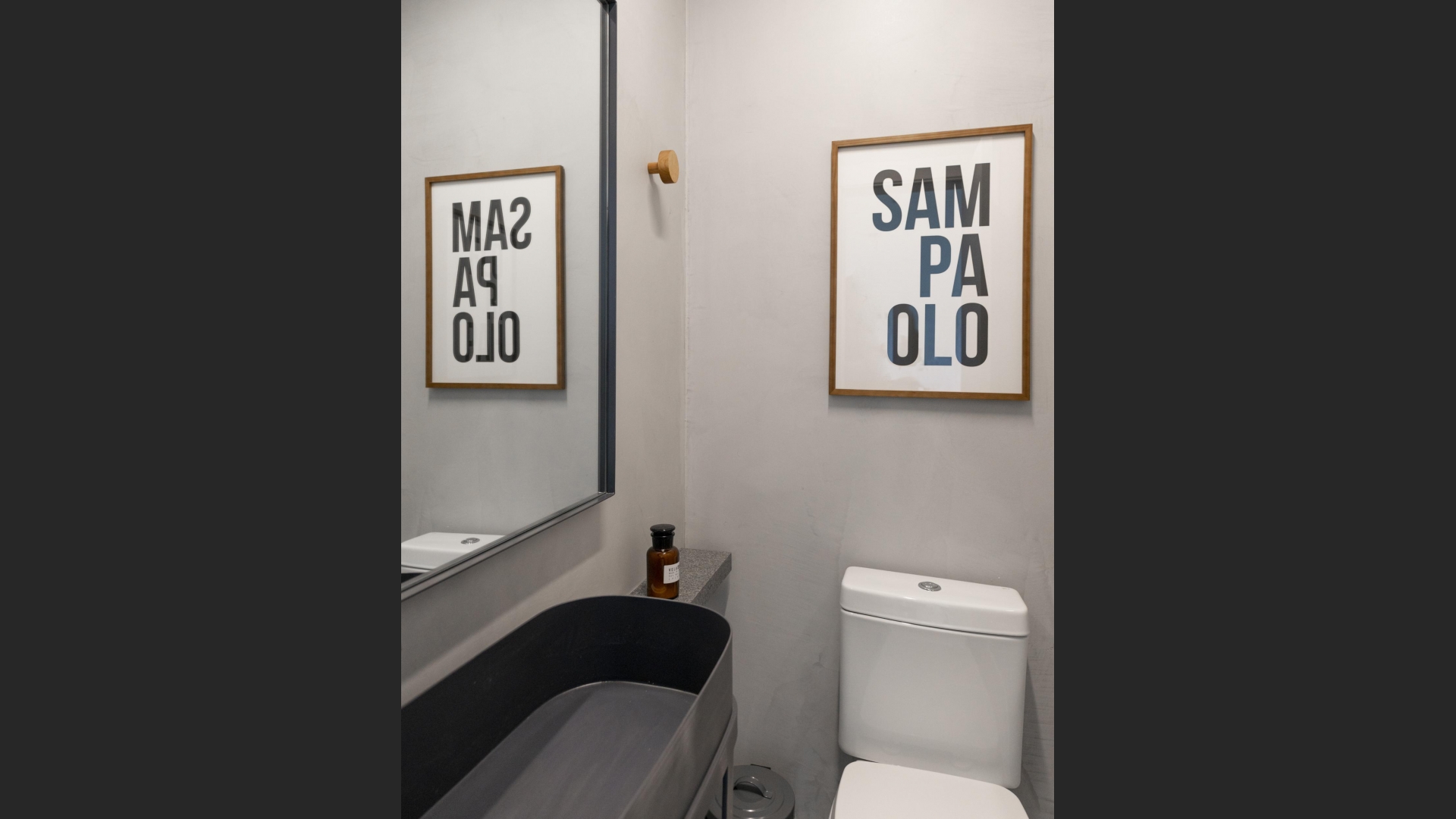 Lavabo com tecnocimento nas paredes e cuba desenhada pelo escritório.