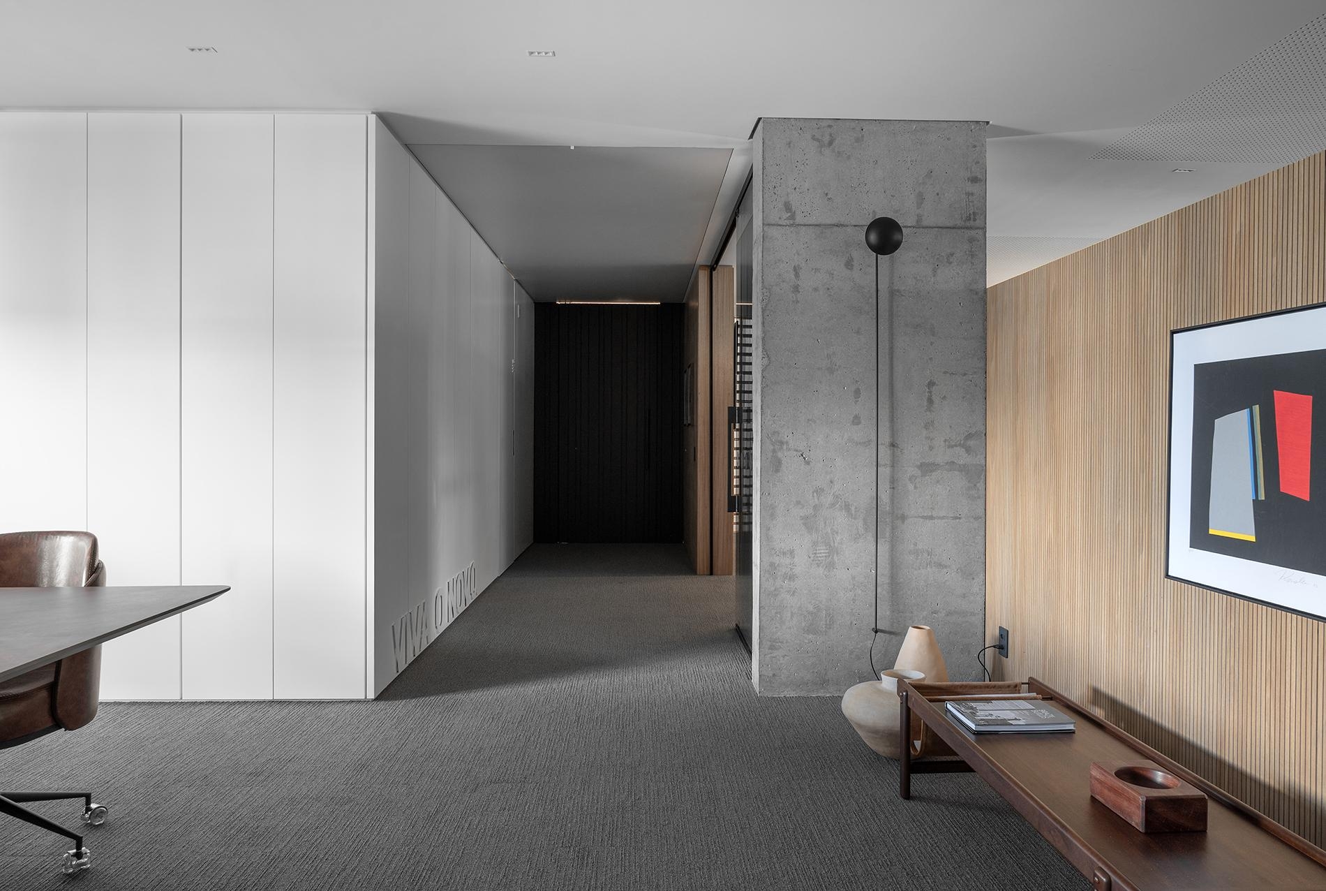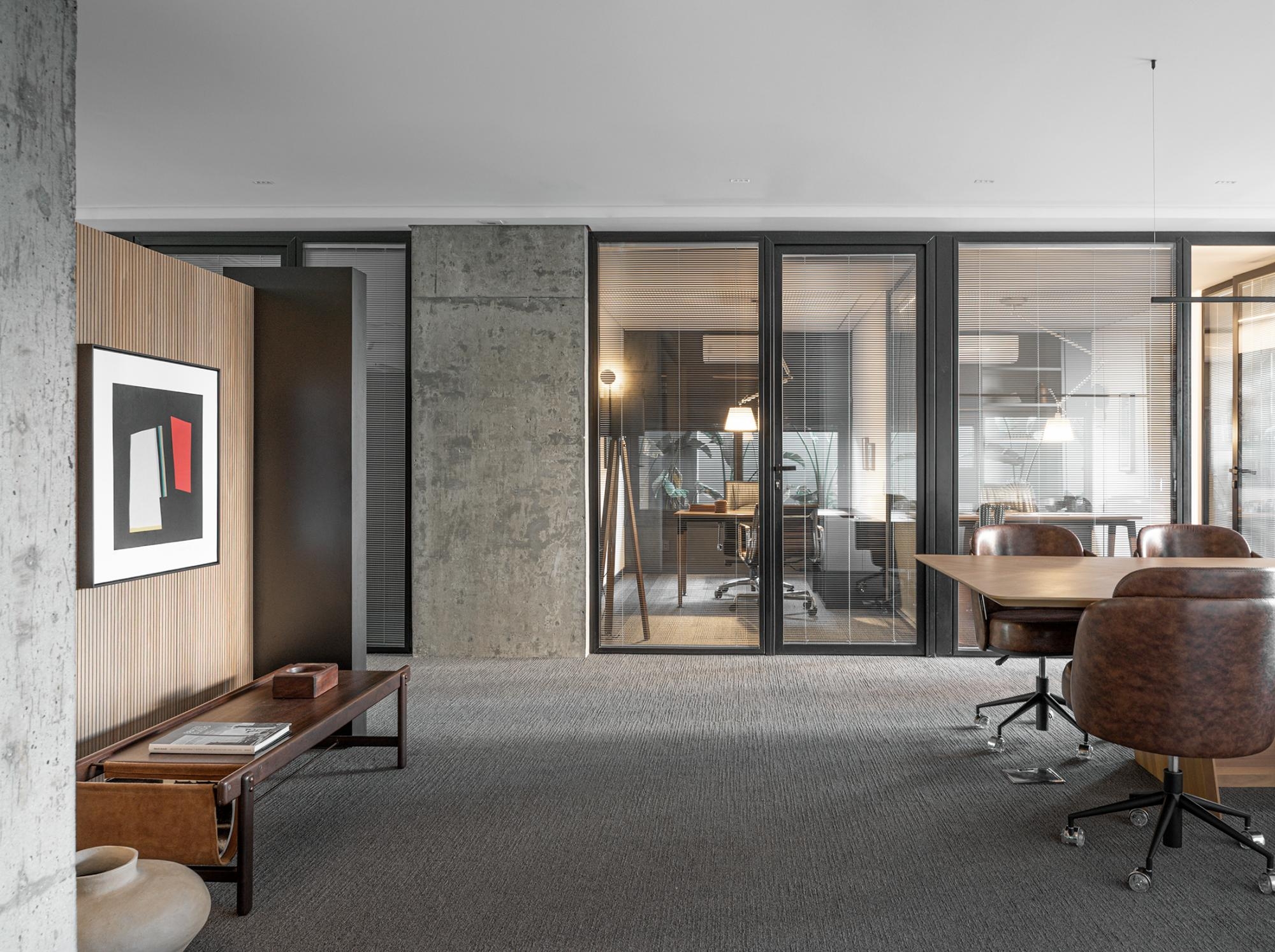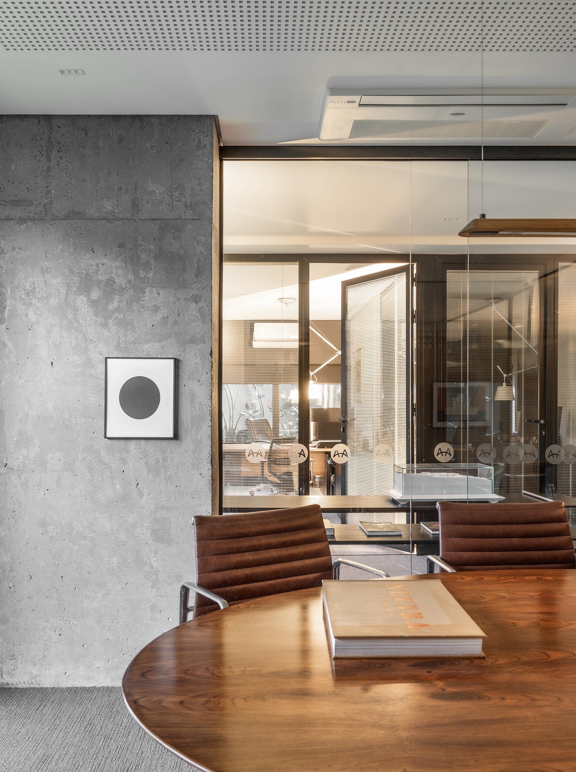 Um eixo central serve de acesso aos sócios e conduz à sala de reuniões coletiva.