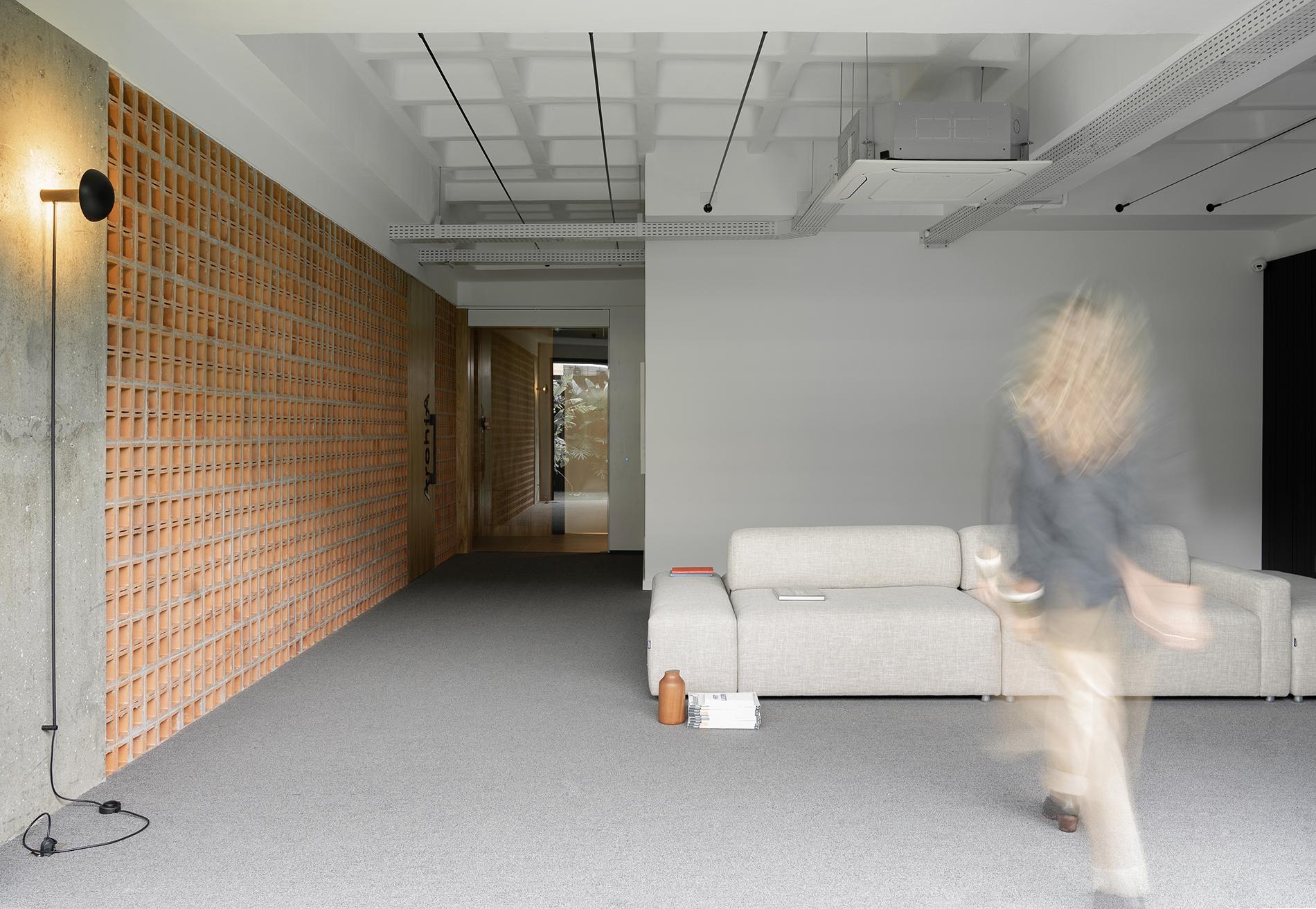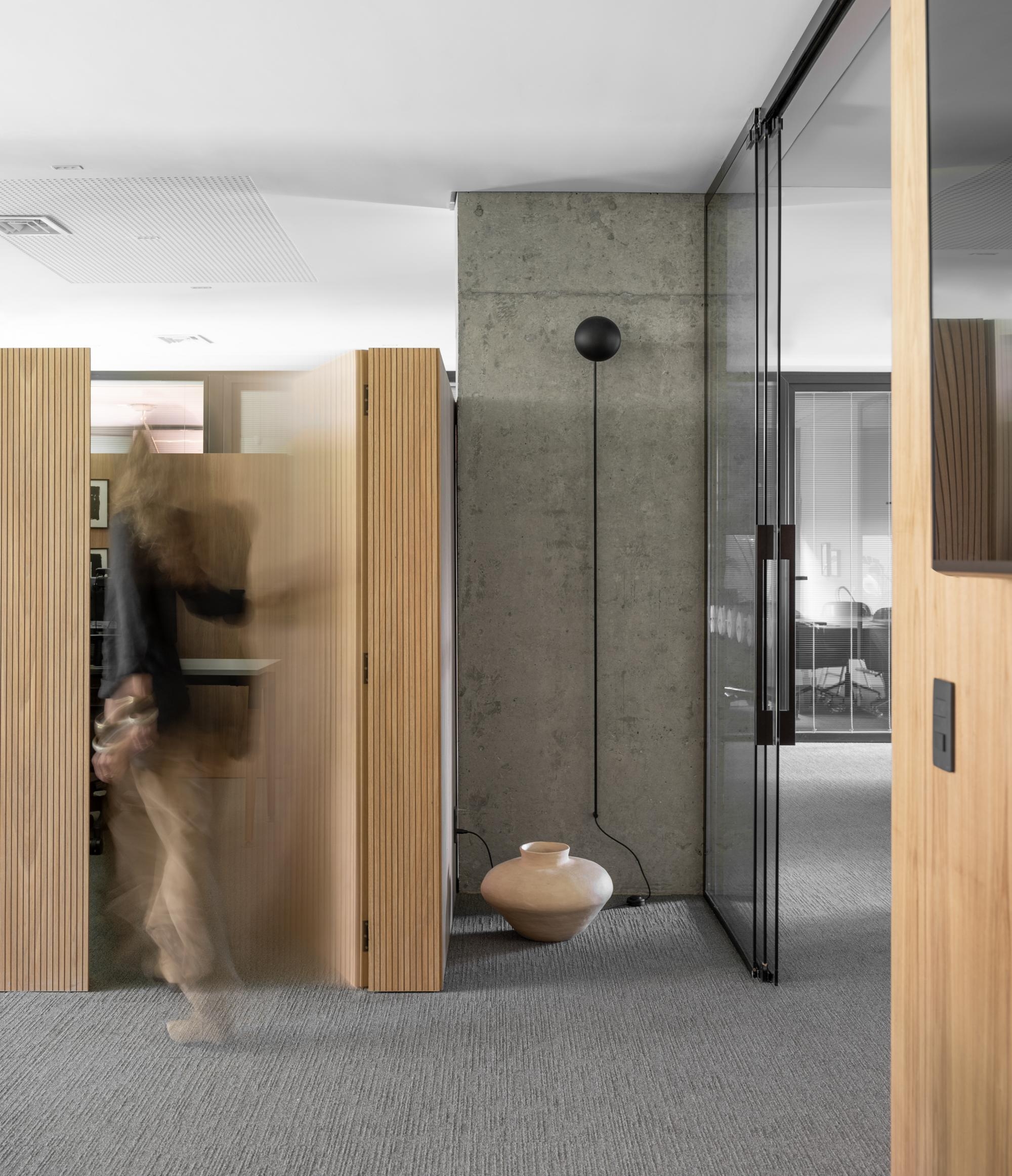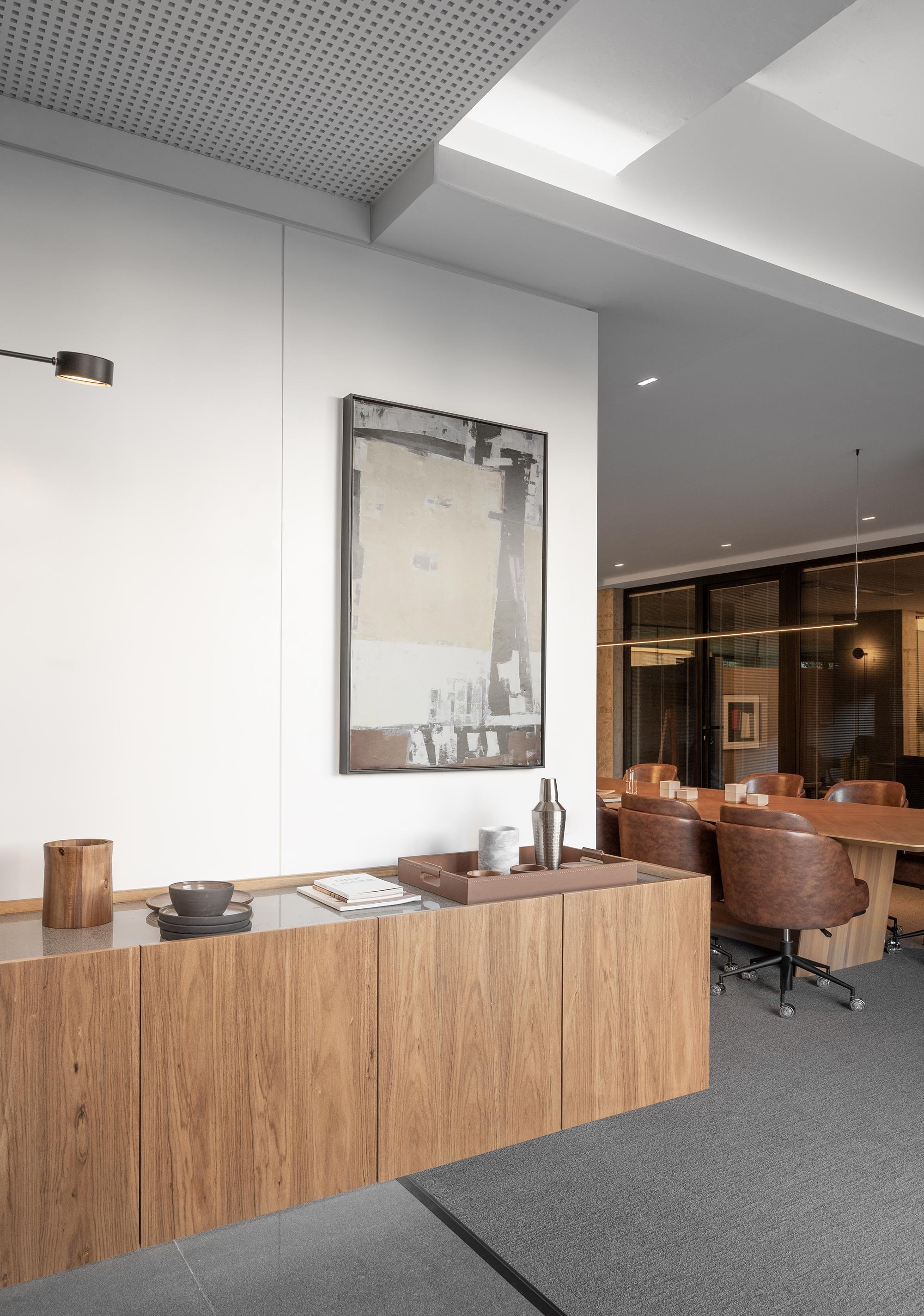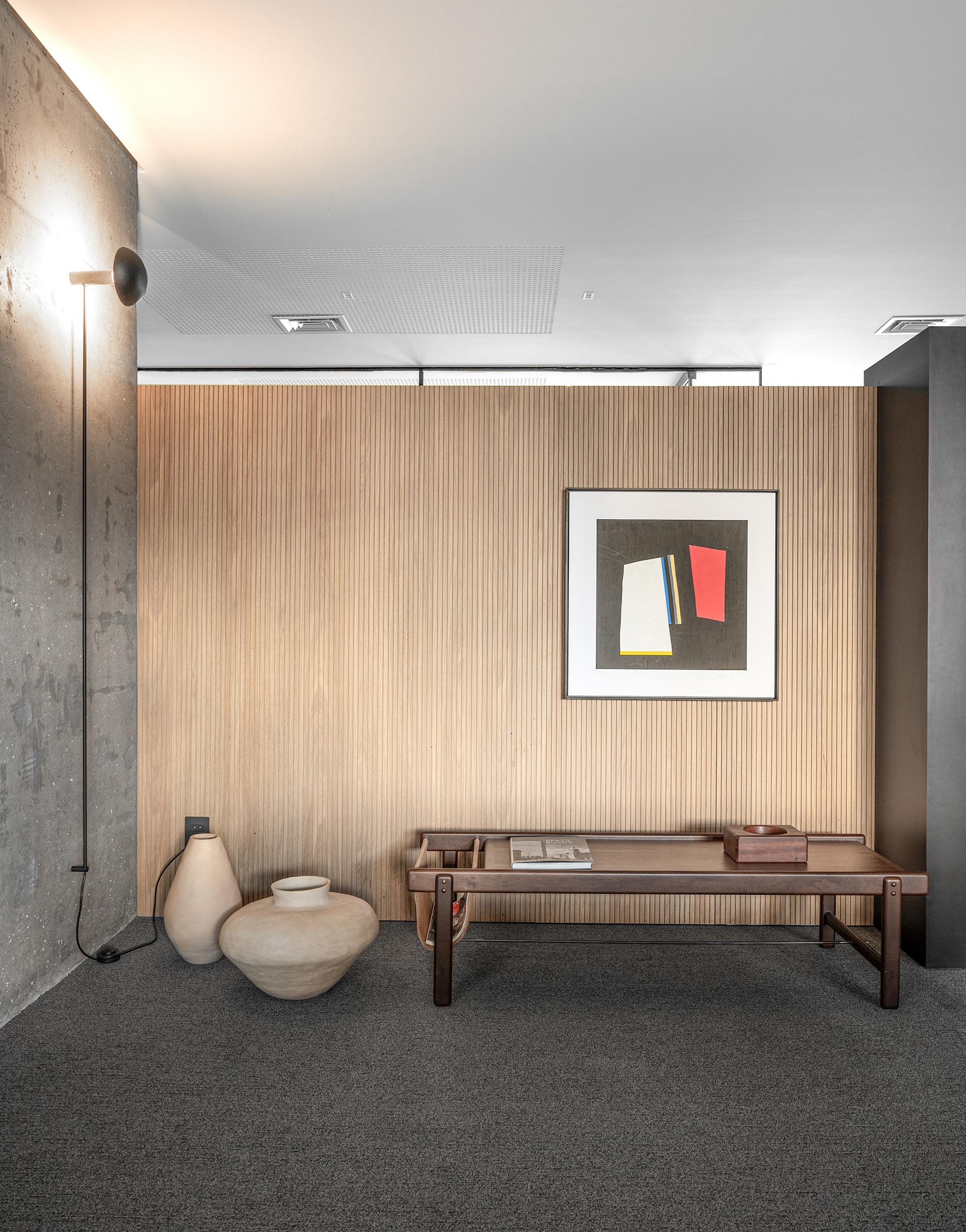 Um eixo central serve de acesso aos sócios e conduz à sala de reuniões coletiva.