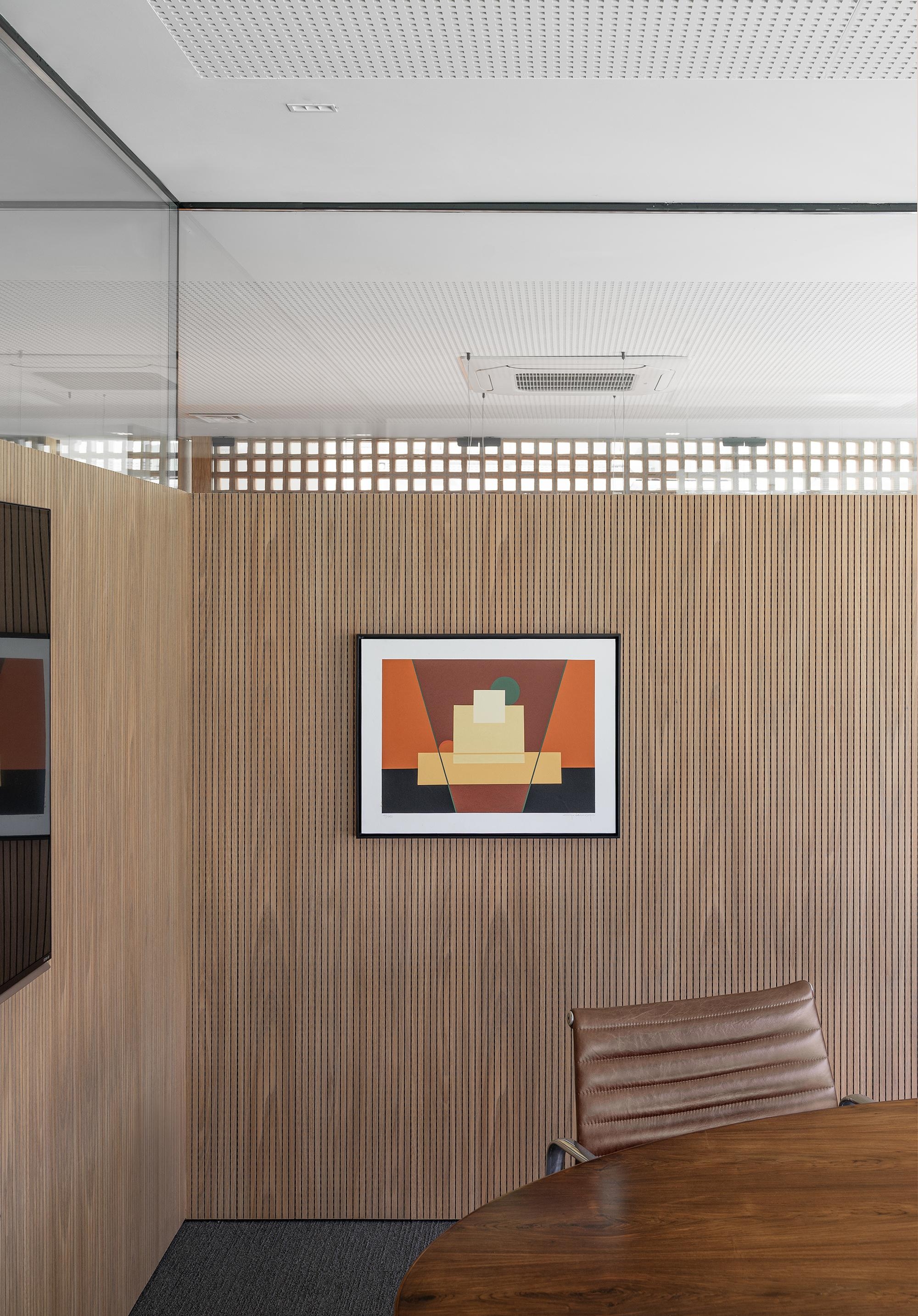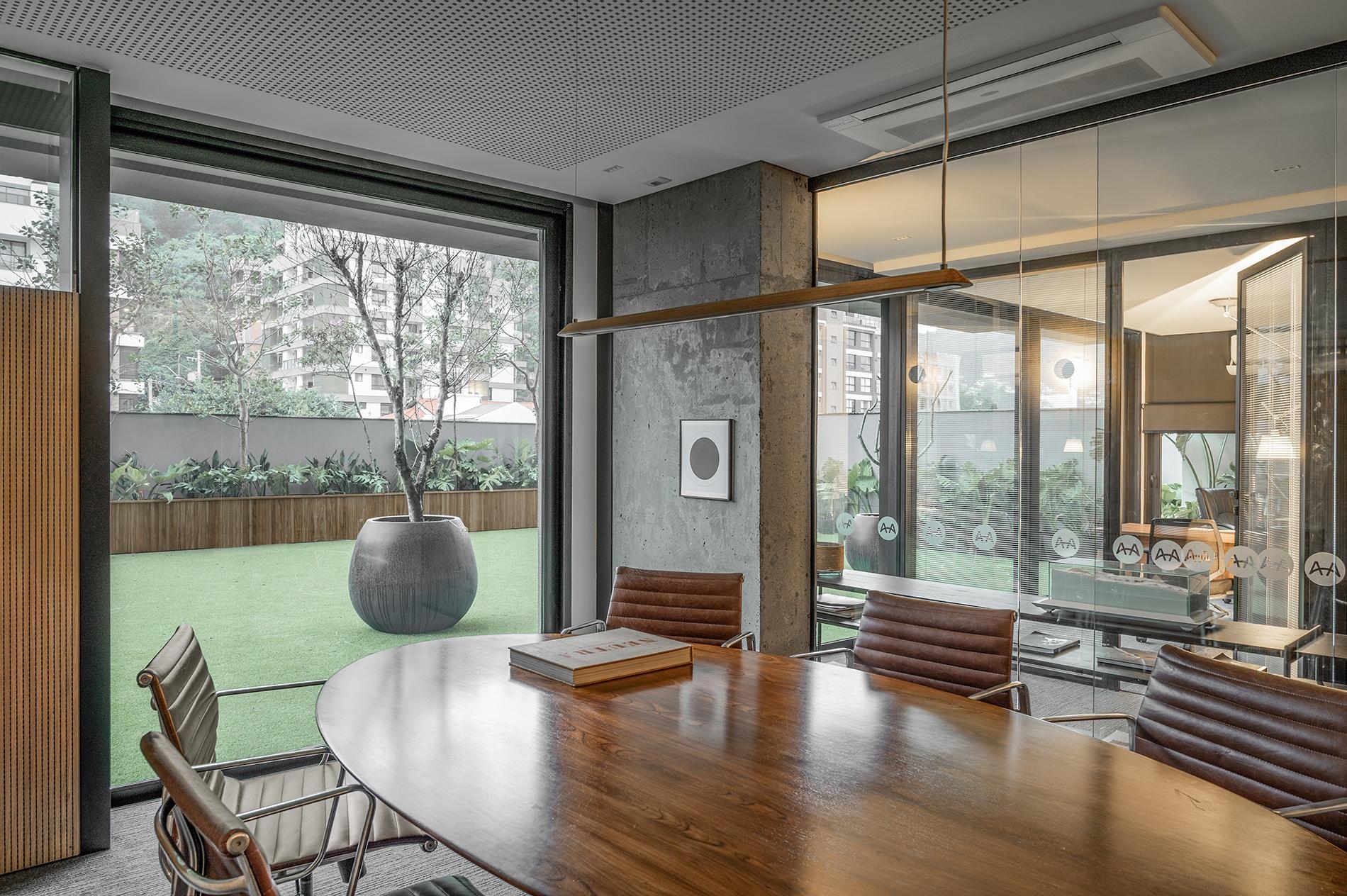 A sala de reuniões privativa usufrui desse mesmo jardim. Tem a sua privacidade garantida por barreiras acústica variadas. Painéis acústicos opacos em marcenaria, vidros acústicos transparentes.