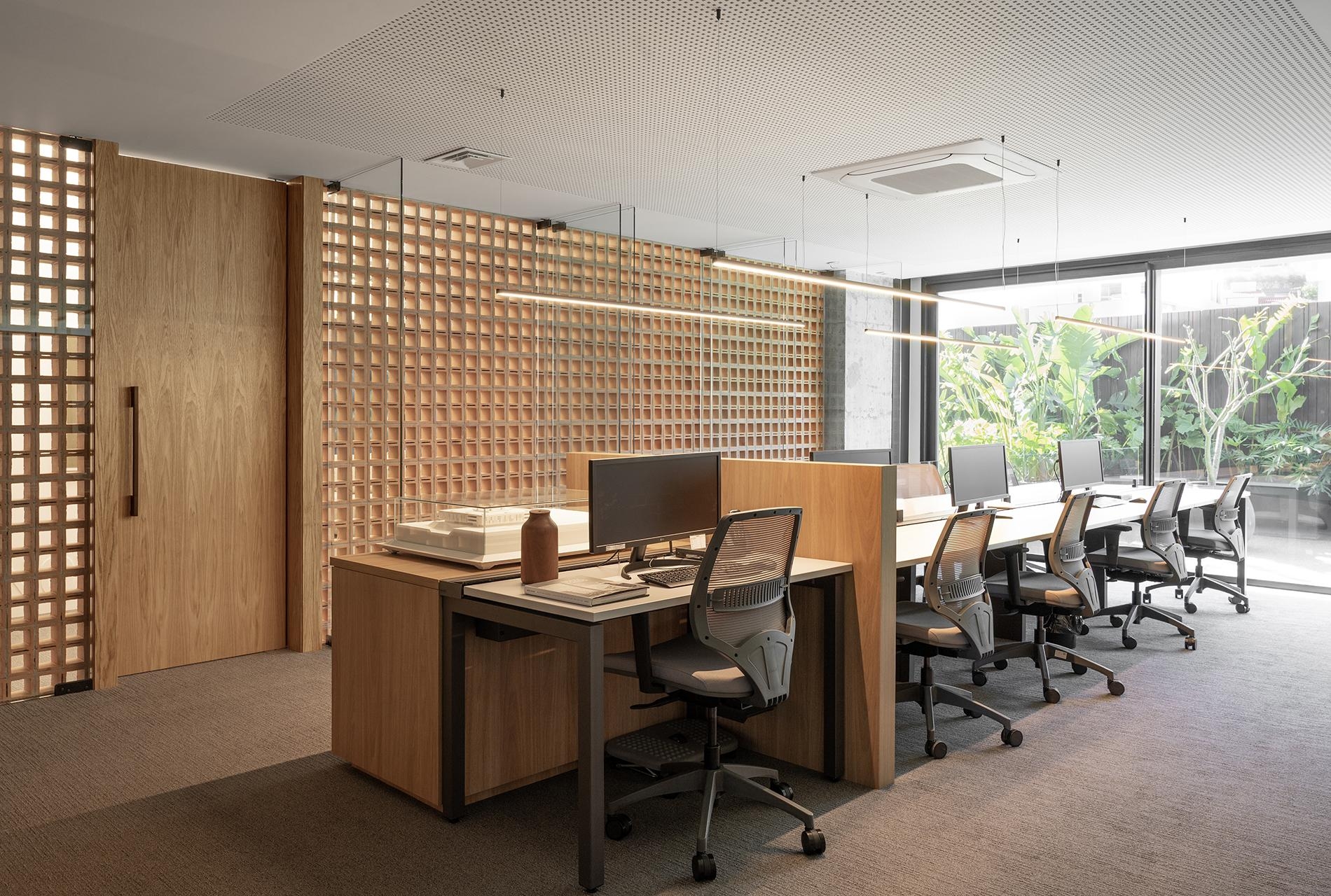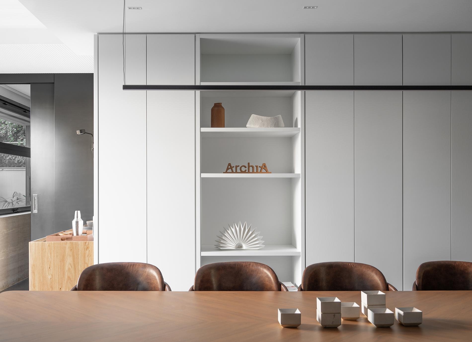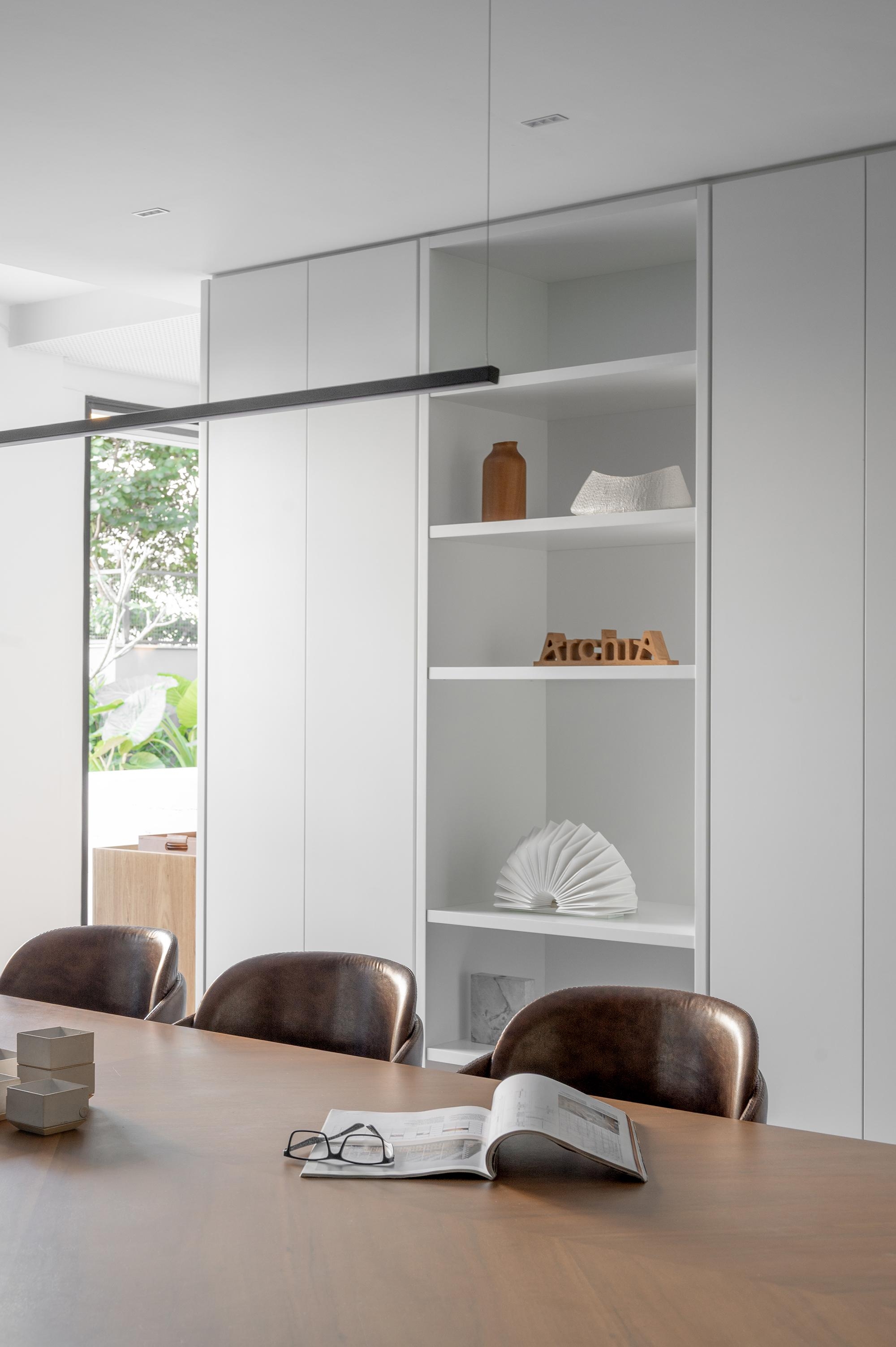 Seguindo zoneamento de ocupação lançado pelo arquiteto Roberto Simon - um dos proprietários da Archia - as salas de reuniões formam um dos eixos do projeto, tenoo acesso livre aos jardins nos dois lados do escritório.