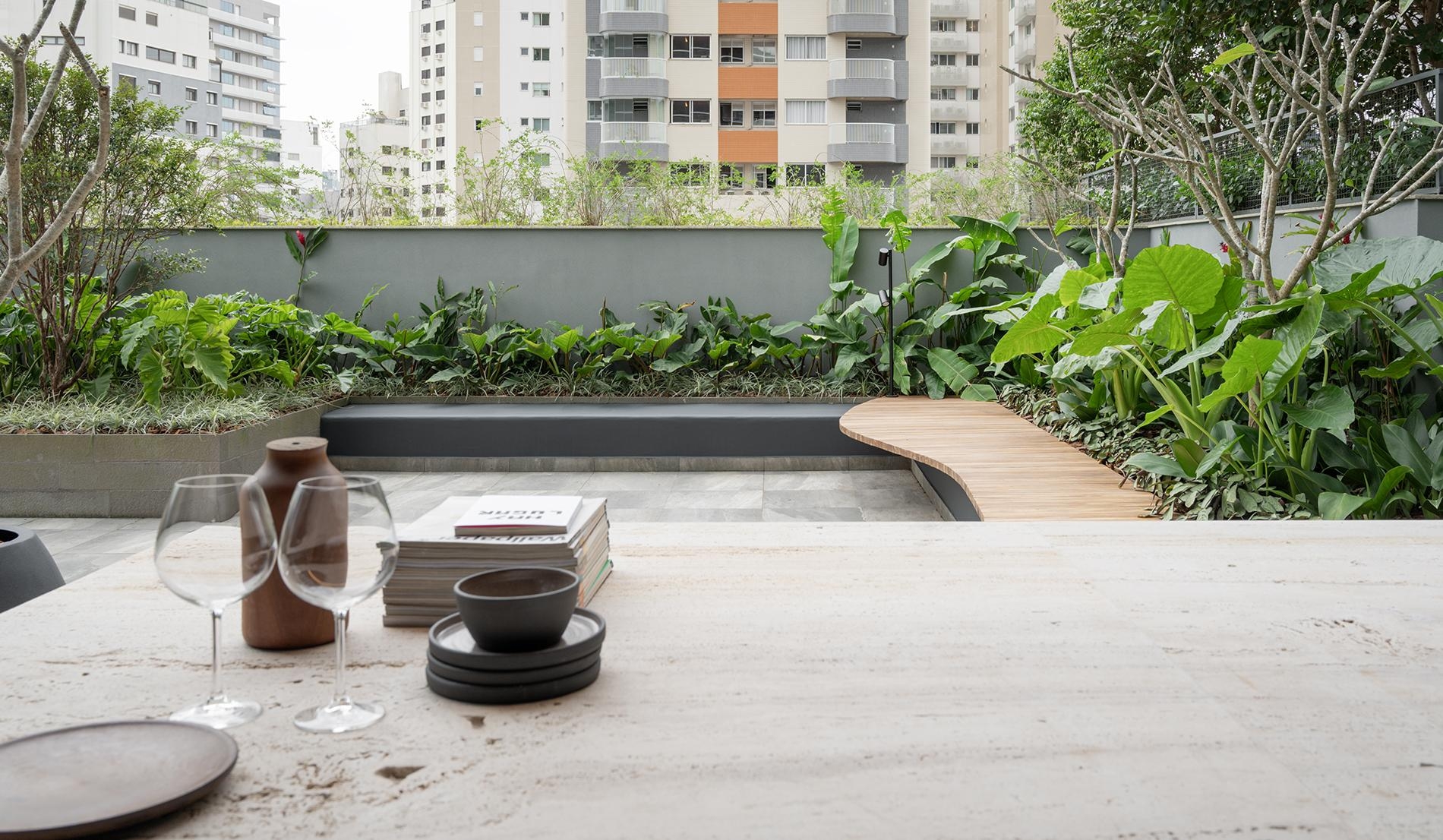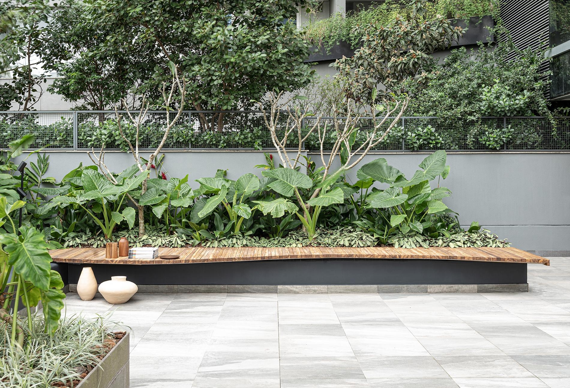 Bancos em réguas de madeira com desenho orgânico intervem no desenho original do terraço composto de volumes retangulares de concreto.
