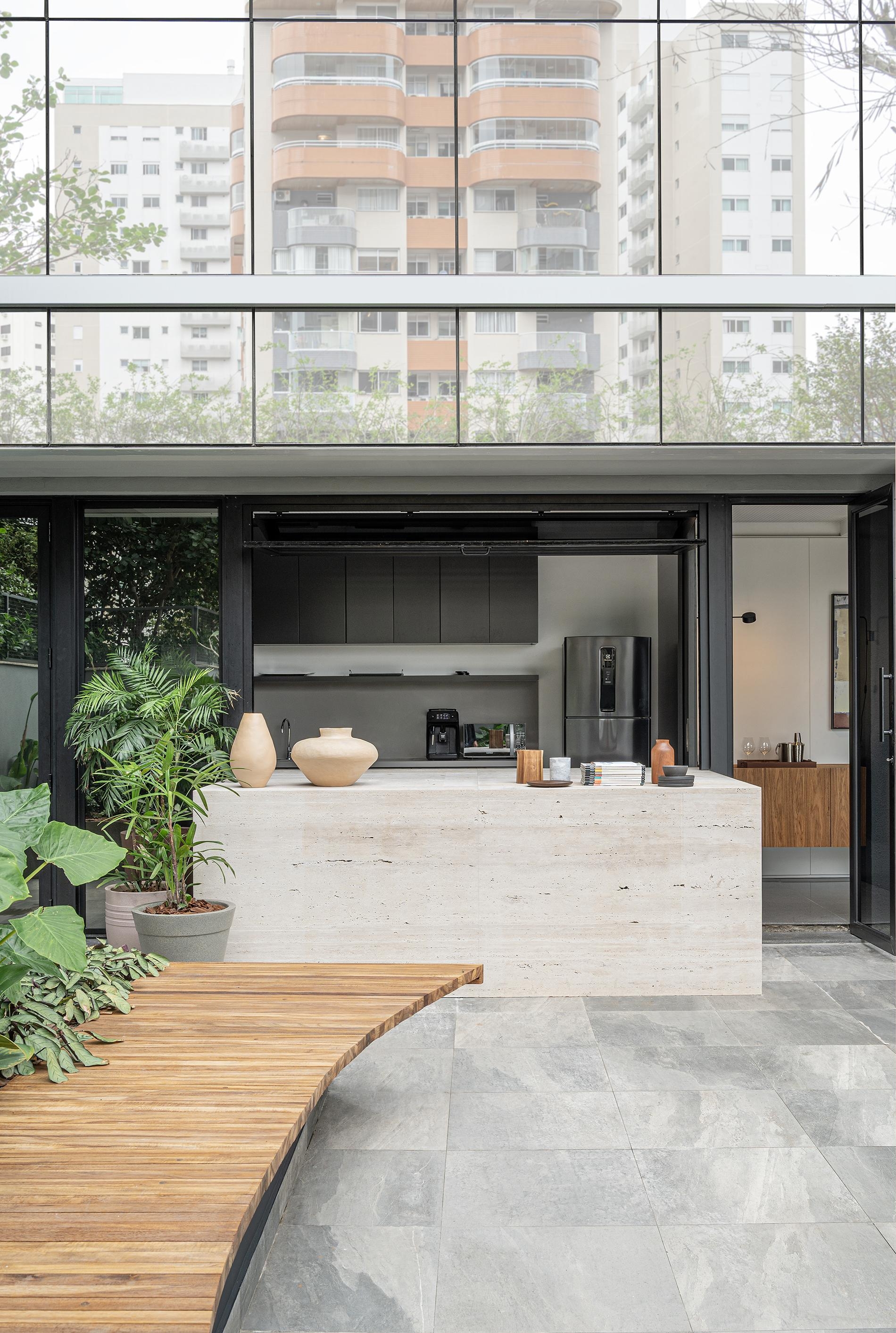 O bar se expande para o terraço integrando os escritórios ao jardim.