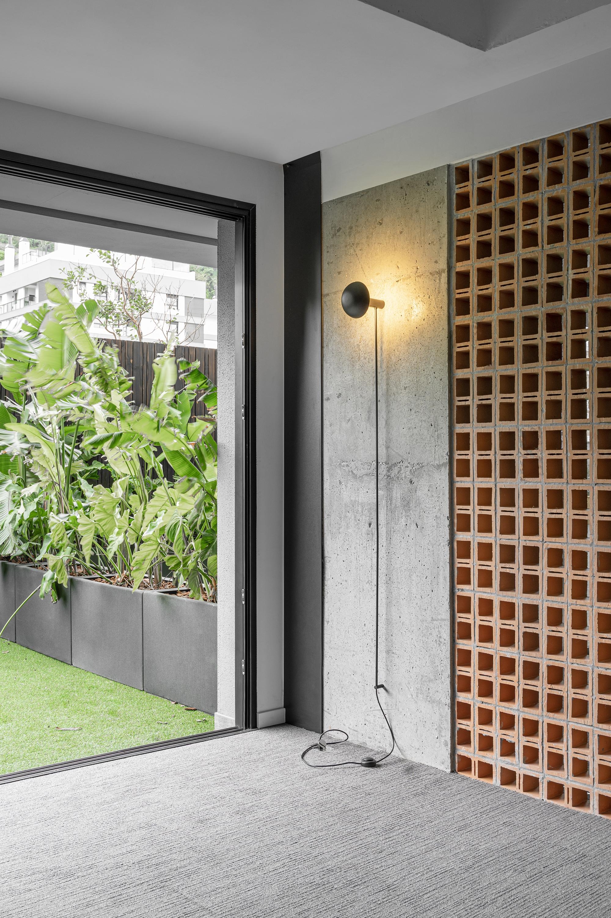 As colunas de concreto da construção original foram expostas com a remoção do seu revestimento. Junto com os cobogós cerâmicos e a porta em Freijó, compõe o painel de materiais que separa o hall de entrada das áreas de trabalhos da incorporadora.