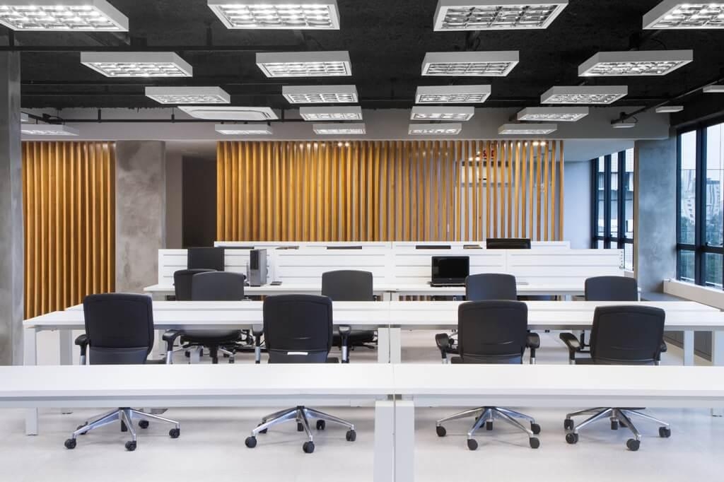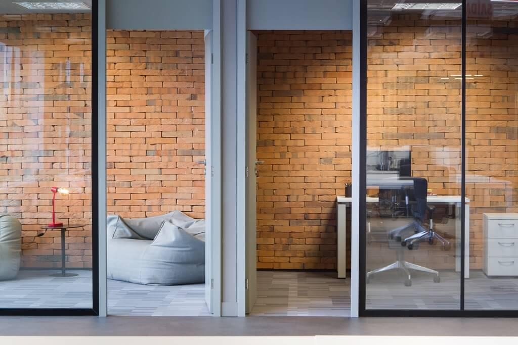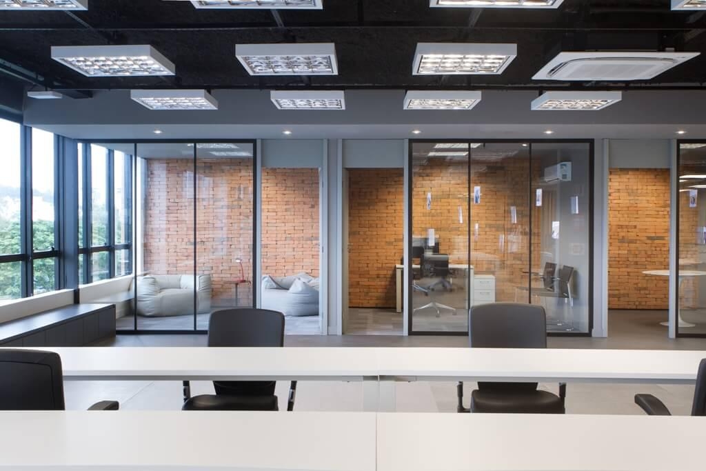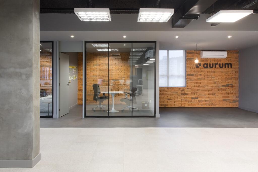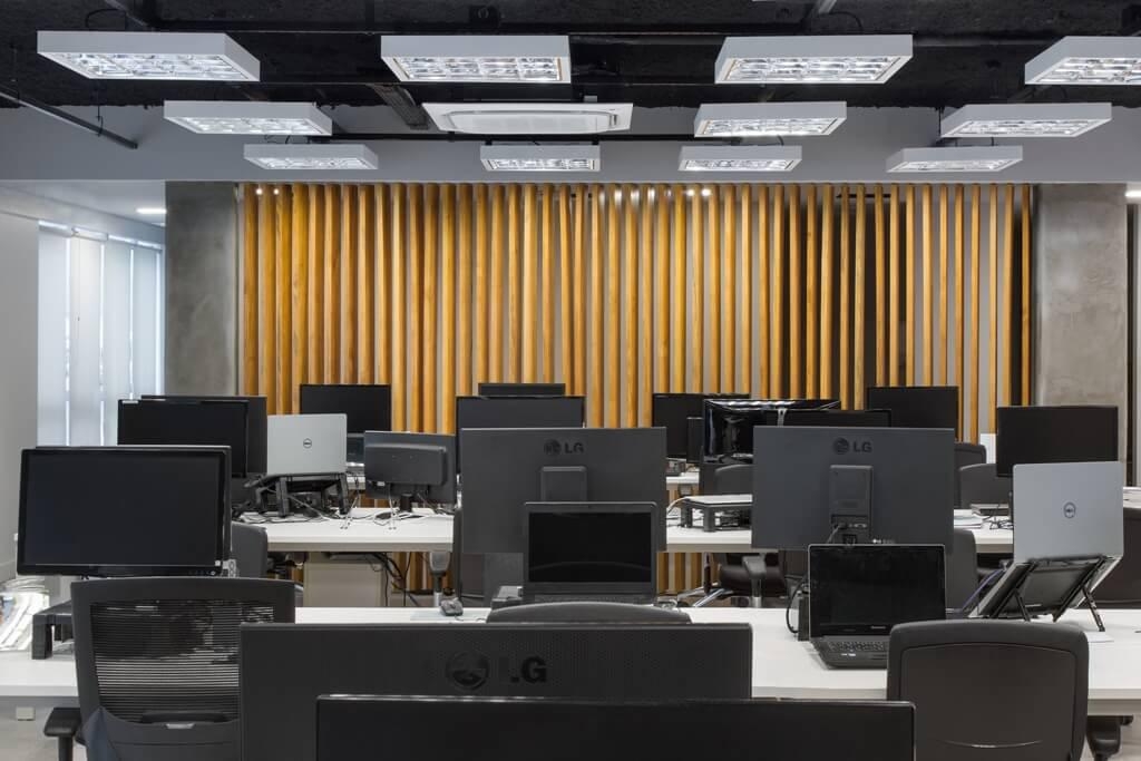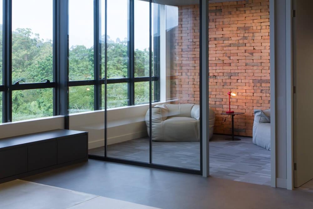 No lado oposto, as salas de reunião e criatividade são todas fechadas com divisórias de vidros duplos. Elas garantem o isolamento sonoro e a transparência para os tijolos de demolição que revestem internamente a parede. Os tijolos, além de aumentar a inércia térmica daquela fachada voltada para o sol da tarde, junto com os brises de madeiras equilibram a composição do ambiente interno, cheio computadores, mesas de trabalho, luminárias e instalações aparentes.
