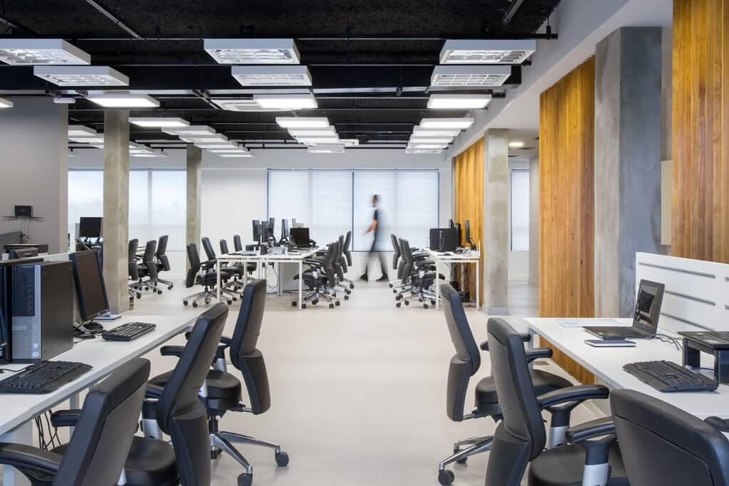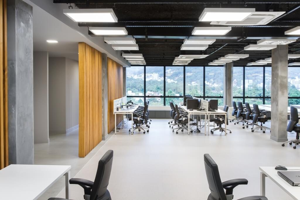 Assim, o coração do escritório é o grande salão de trabalho, onde estão distribuídos os times de acordo com as áreas de atuação. A acústica foi o principal cuidado para viabilizar este salão como espaço de trabalho, resolvida principalmente com o revestimento vinílico flexível sobre o piso e o jateamento acústico do teto diminuindo a produção de ruídos e aumentando a absorção sonora no ambiente.
