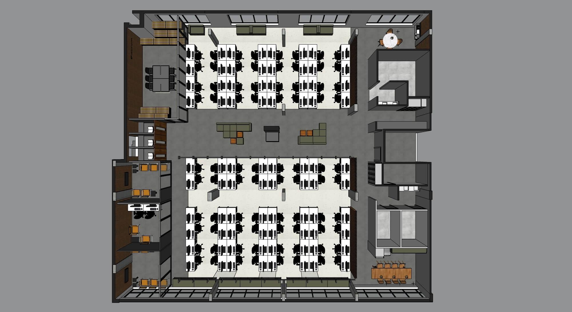 Complementando esses cuidados, foram criadas cabines especiais para ligações telefônicas, salas de criatividade e de reunião em diversos tamanhos, garantindo que as atividades que geram mais ruídos ou requerem maior concentração possam ser desenvolvidas sem conflito com o amplo ambiente coletivo.
