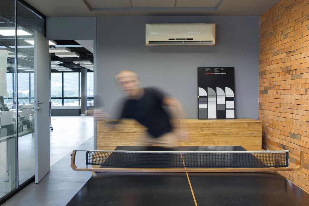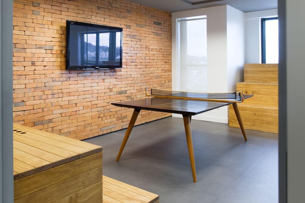 Na sala de reuniões principal a mesa desenhada por Pedro Grisotti é inspirada no jogo de ping pong, e eventualmente se transforma para oferecer momentos de descontração à equipe.