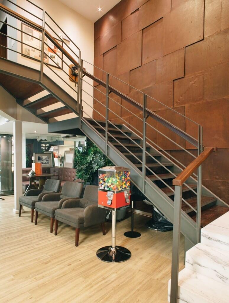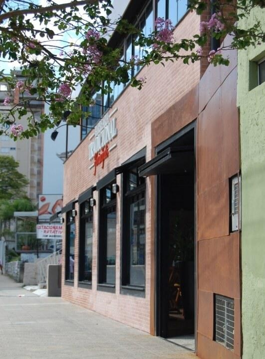 A nova fachada aproveitou os elementos pré existentes integrando-os ao novo desenho que buscou inspiração no estilo de antigas construções inglesas da época da Revolução Industrial, onde predominava o tijolo aparente.