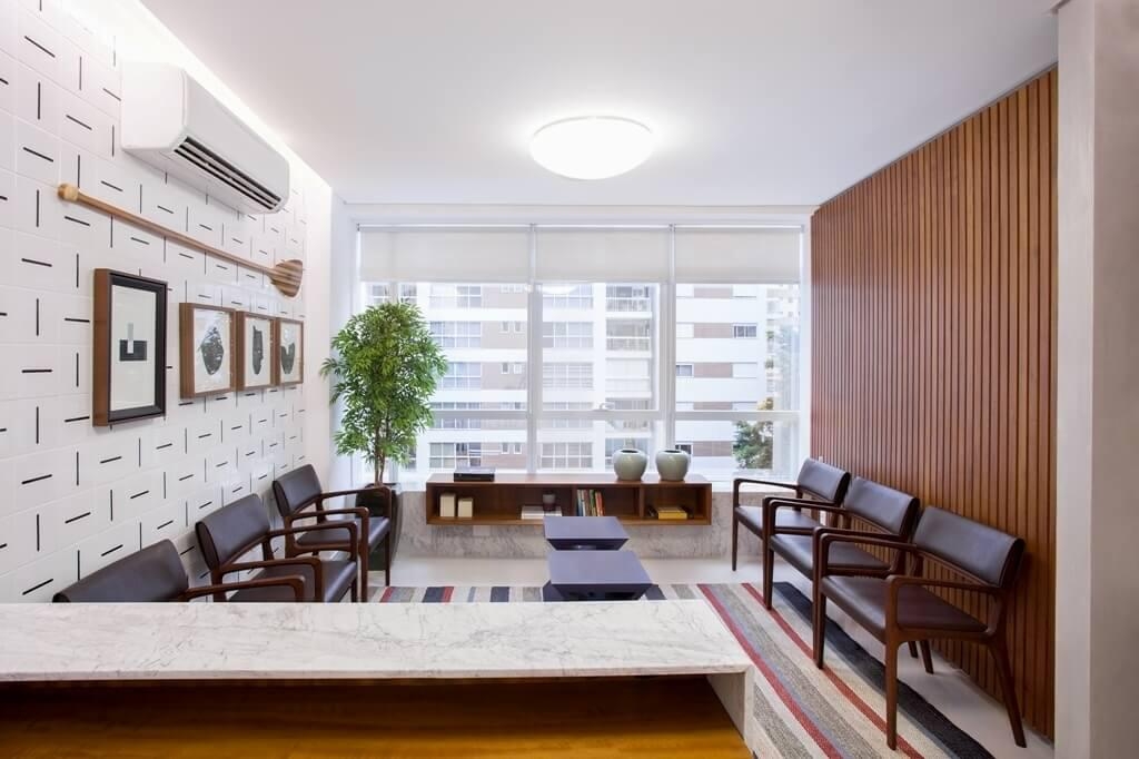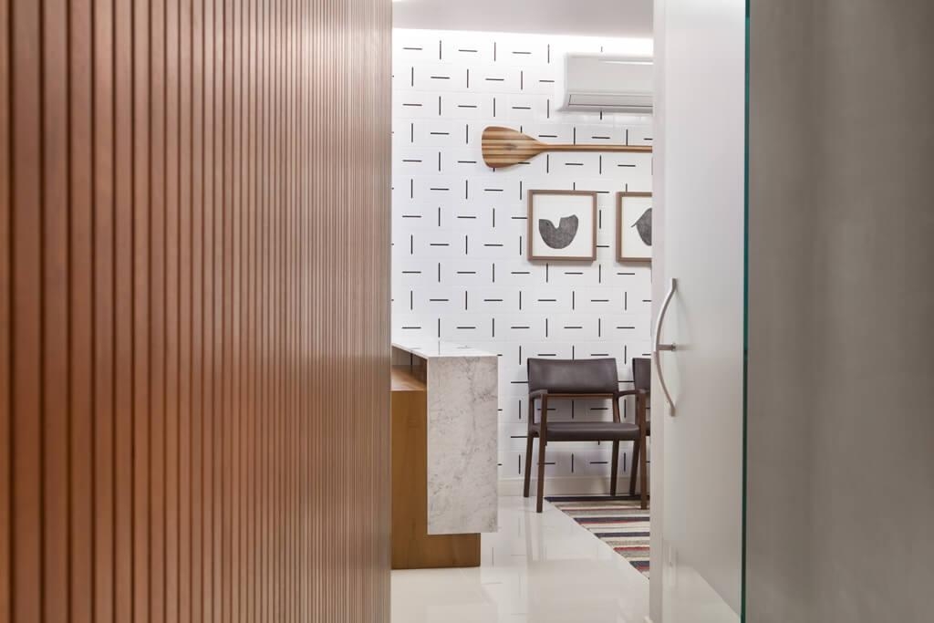 Na recepção utilizamos revestimentos especiais para criar um ambiente aconchegante.