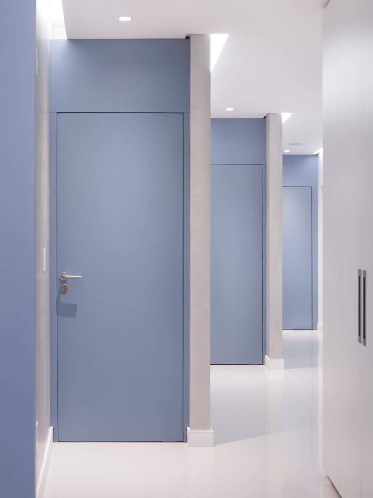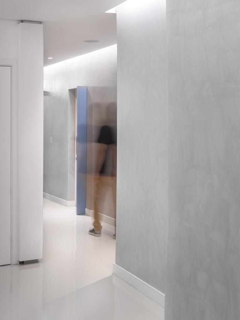 Na circulação, a inclinação dos planos cria as aberturas dos acessos valorizando as portas de entrada de cada consultório. O acabamento cimentício das paredes reforça a diferenciação entre as salas de atendimento e as áreas de trabalho.