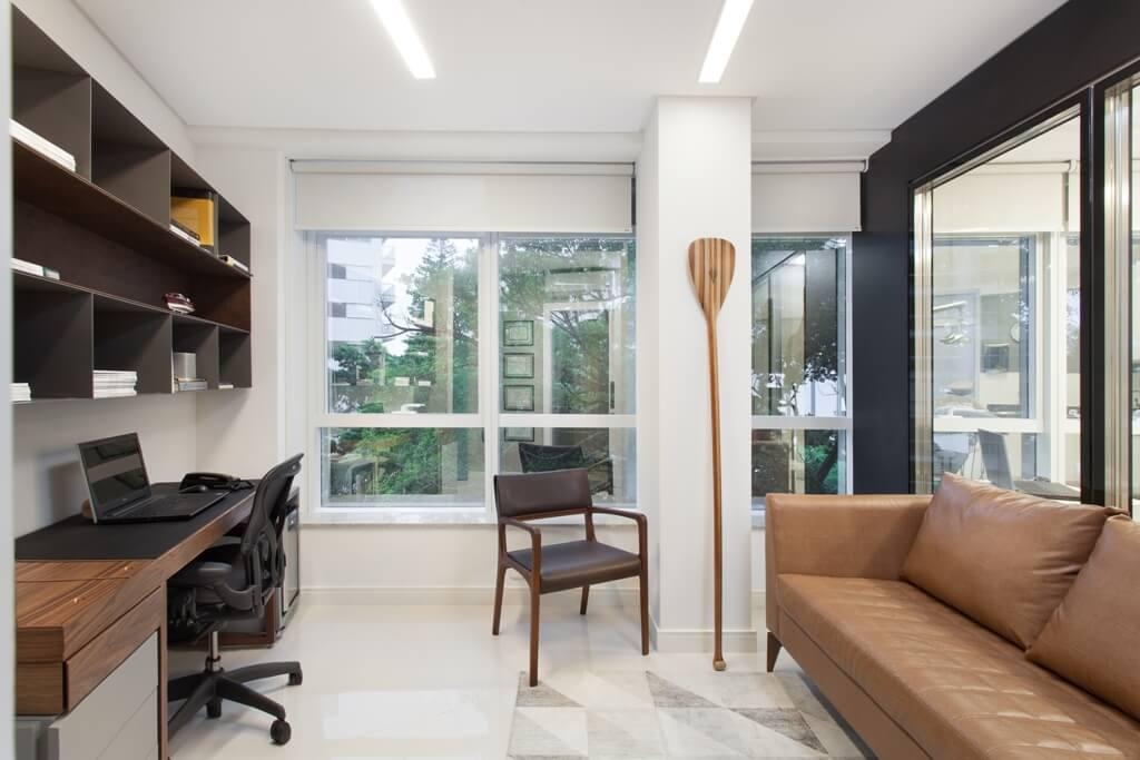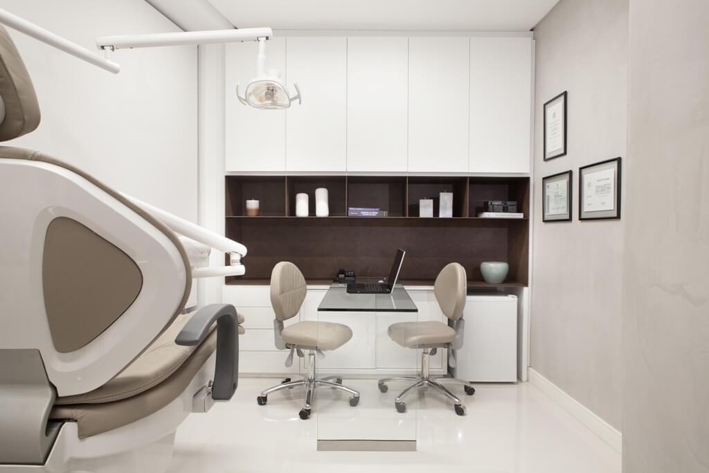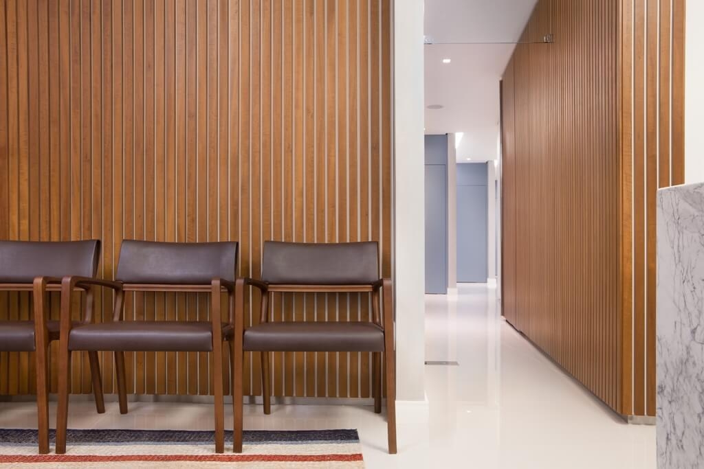 Inserido entre os consultórios um pequeno escritório abre espaço para as atividades de pesquisa desenvolvidas pelos profissionais da clínica e um atendimento diferenciado aos clientes. Estes são recebidos no escritório para o planejamento dos tratamentos.