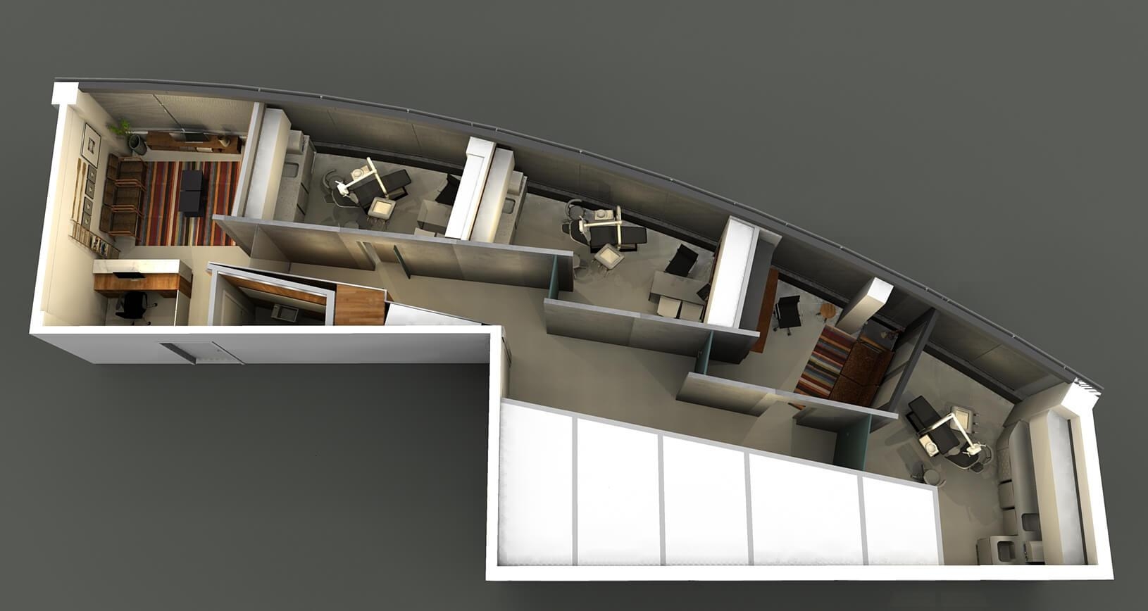 Dividir o espaço nos 11 ambientes e os espaços de circulação necessários para o bom funcionamento desta clínica exigiu muito estudo, muita geometria e acima de tudo, muita criatividade. Render ilustrativo.