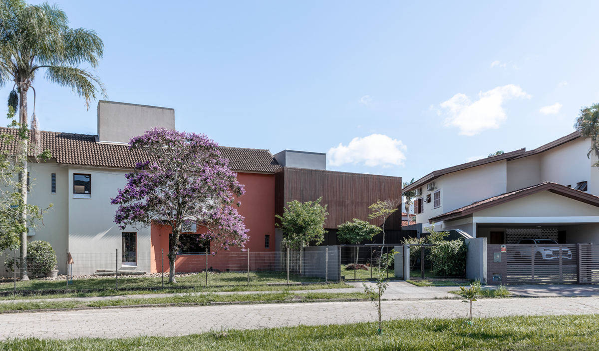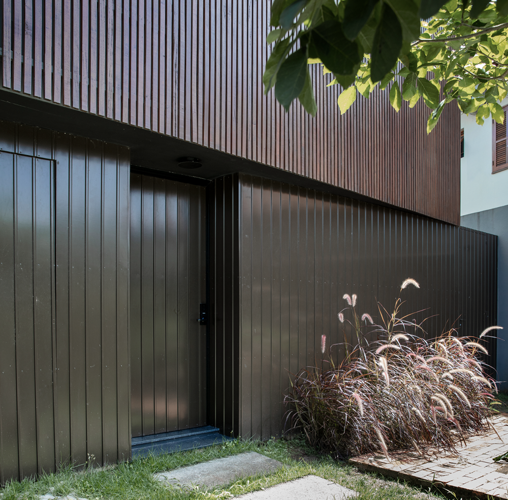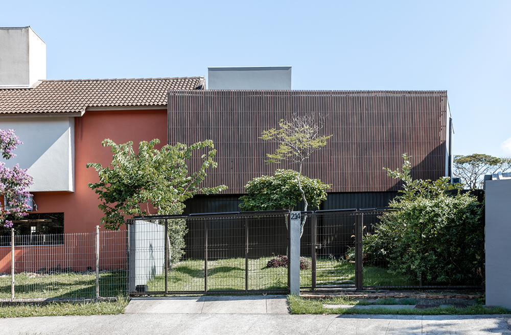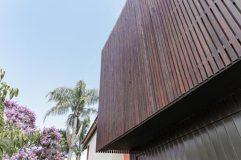 No pavimento superior, destacado com leve angulação, o ripado de Ipê oculta as aberturas, deixando apenas a visão de dentro para fora da casa.