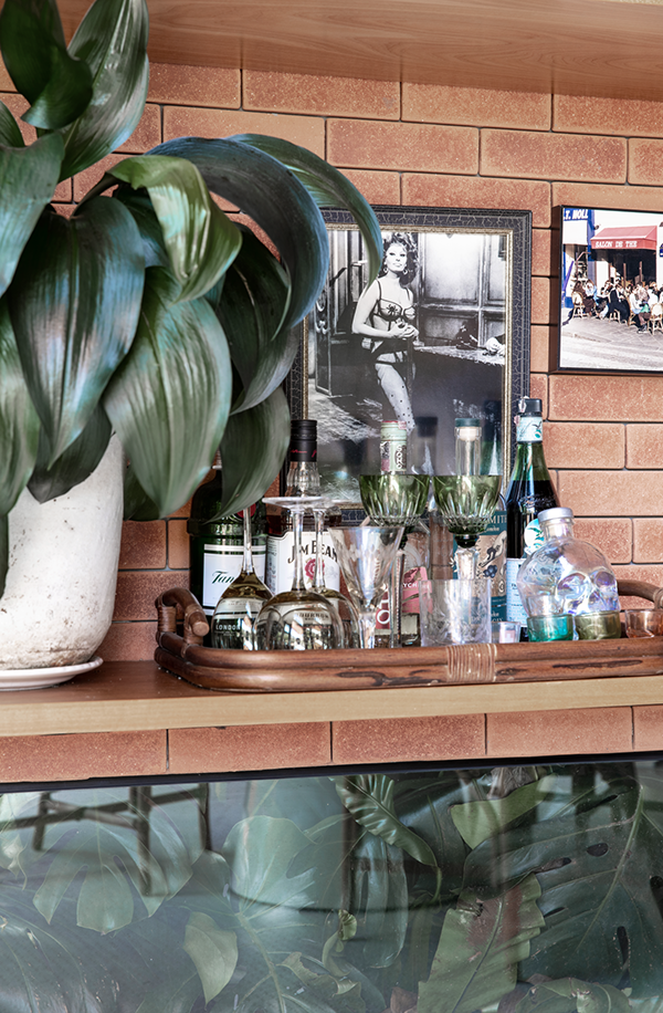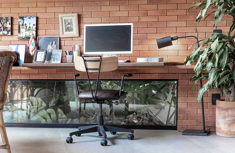 A estante que desce pela parede do pé direito duplo abriga a bancada de home office e o bar.
