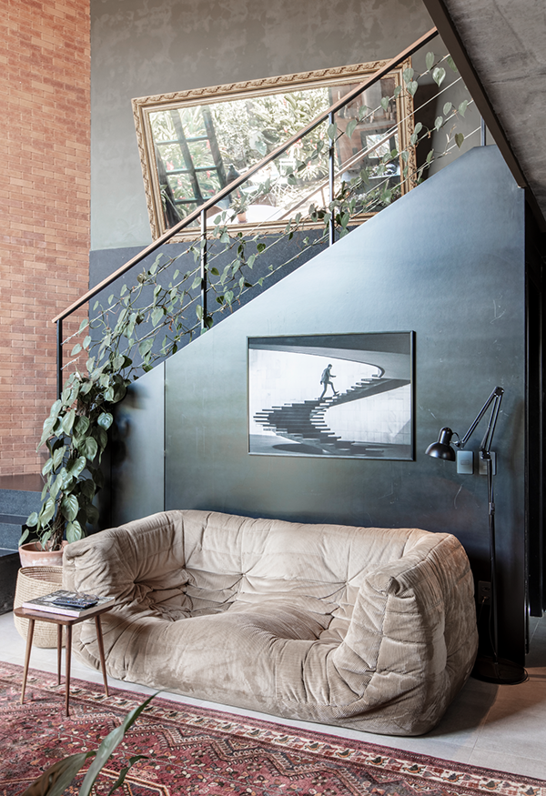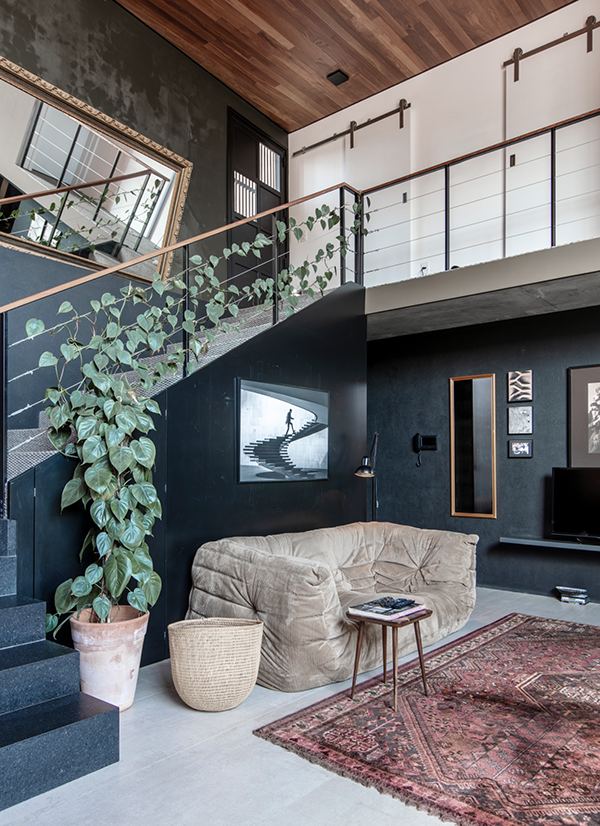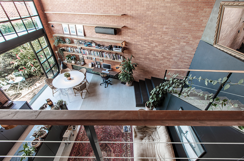 O fluxo da casa gira em torno do estar, através da escada e do passadiço do mezanino.