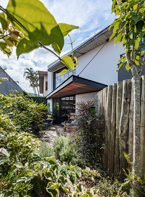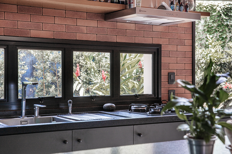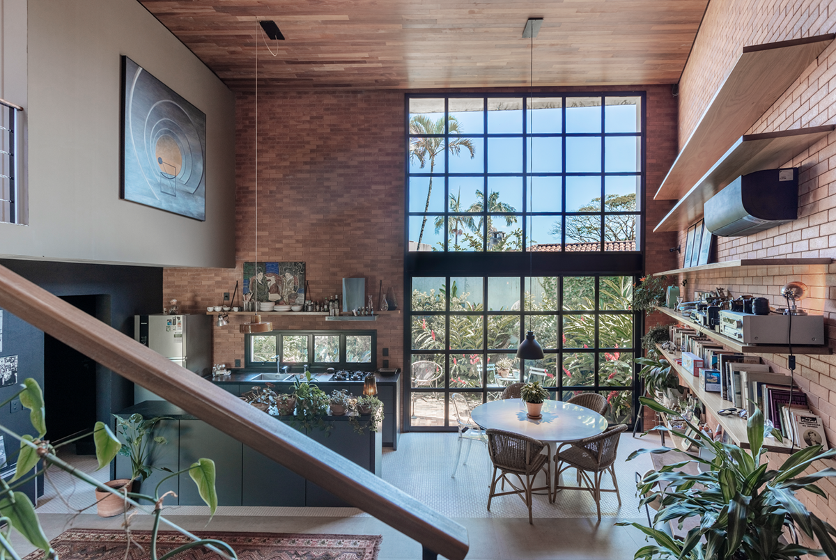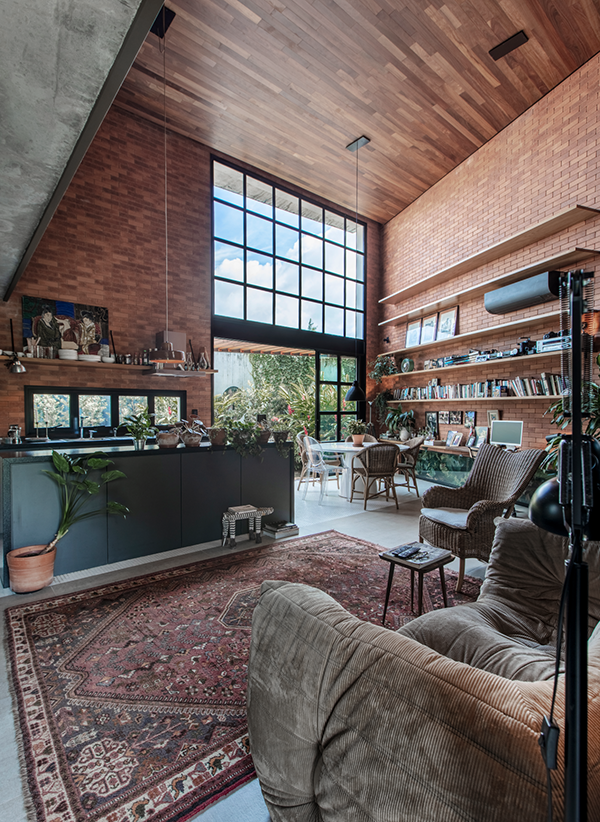 Internamente, a amplitude do espaço de pé direito duplo é acolhedora, com paredes em tijolo e forro de madeira. As aberturas para o jardim remetem a especialidade da casa antiga, onde tudo acontecia ao redor de um pátio central ajardinado.