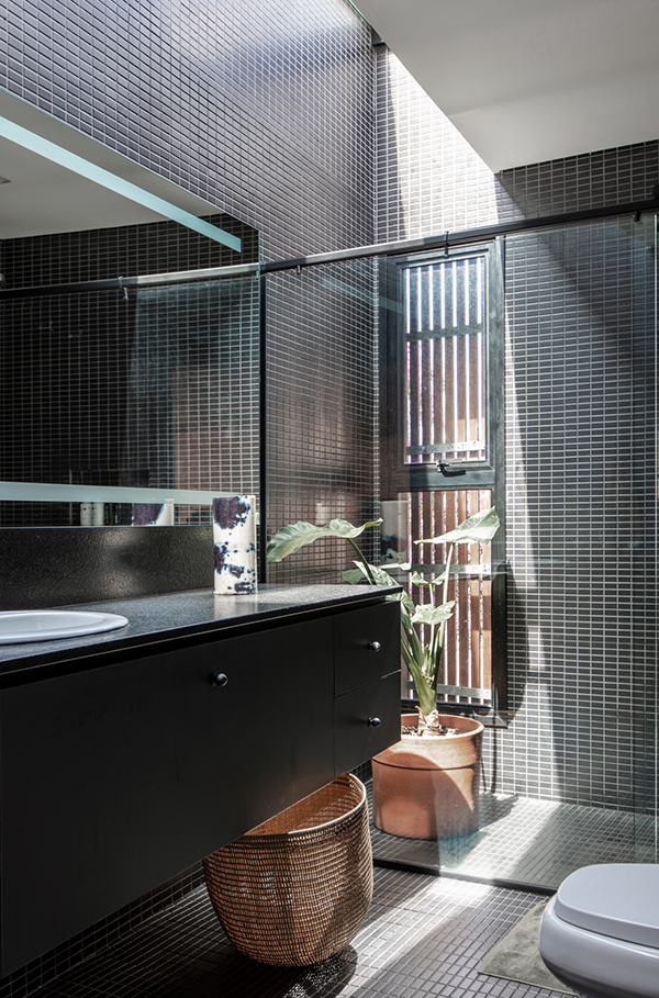 O banheiro da suíte explora a iluminação zenital. A luz do Sol entra e trasnforma o ambiente.
