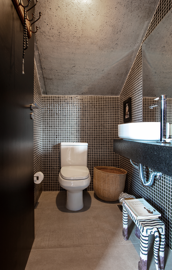 O lavabo foi encaixado embaixo da escada, deixando visível o fundo de concreto aparente.
