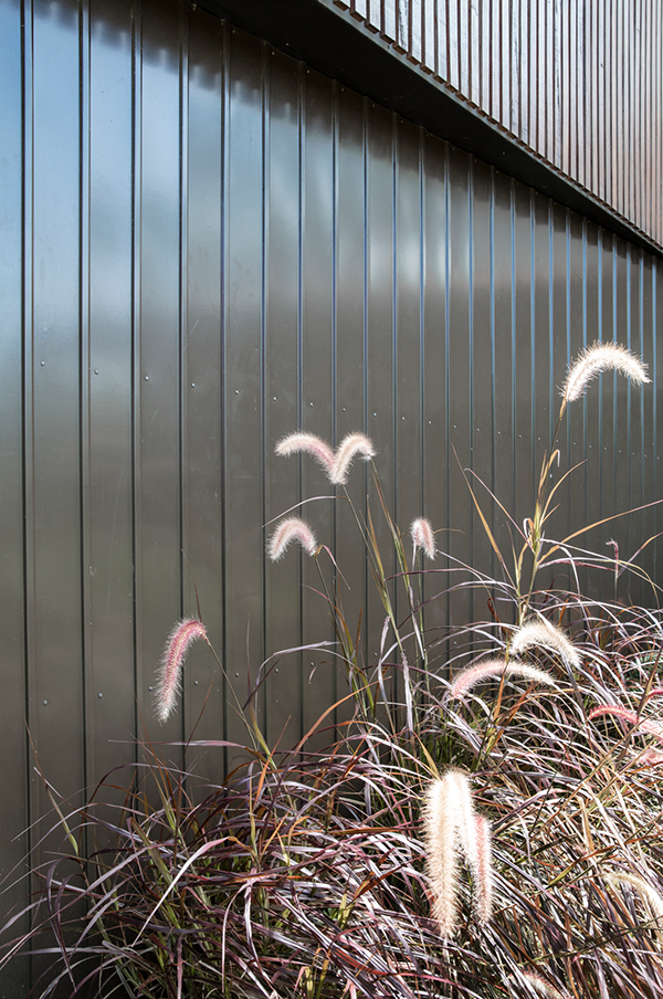 As leves diagonais aproveitam as evidências absorvidas do formato irregular do terreno. No térreo, completamente vedado em chapa metálica, se mimetizam o portão da garagem e o acesso de serviços, destacada apenas a entrada principal num recuo centralizado.