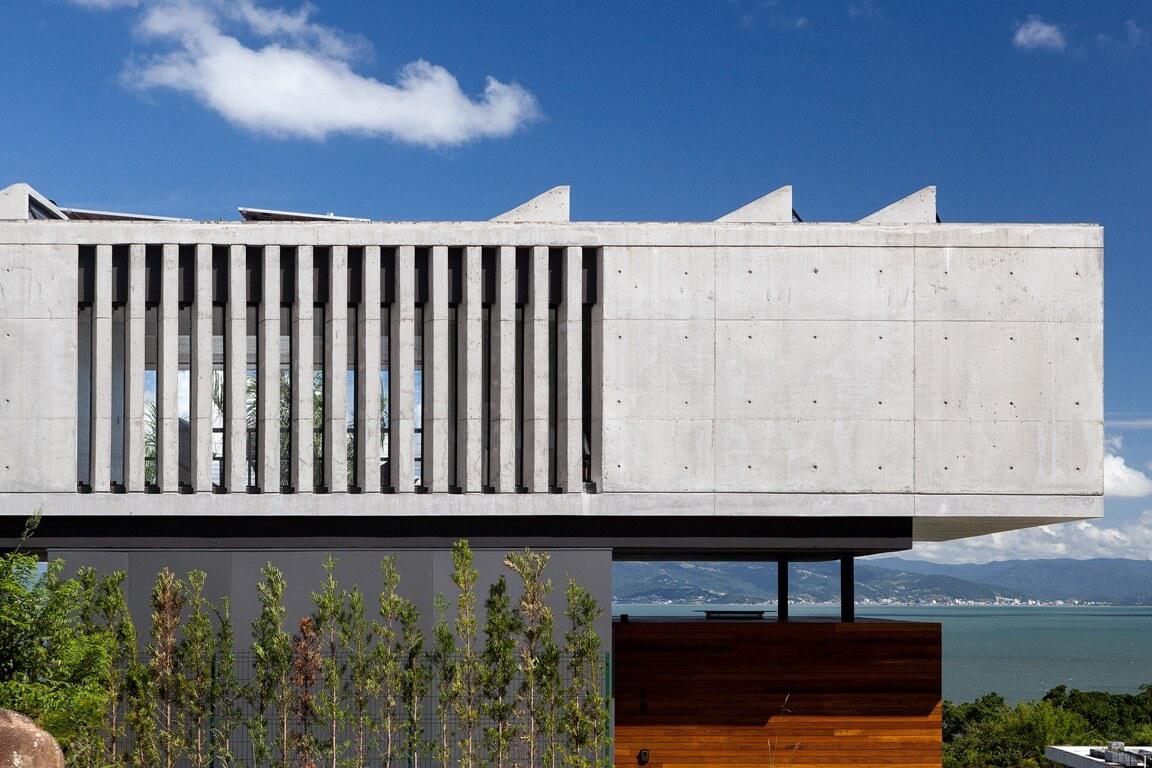 Nessa casa, em Florianópolis, um programa de necessidades muito específico foi a linha mestra para atingir uma arquitetura tão fora do comum. A primeira expectativa dos proprietários na encomenda do projeto era resgatar de alguma forma a vista deslumbrante que os levou a comprar o terreno - a baía norte da Ilha de Santa Catarina, desde as ilhas de Ratones - na saída da baía - até a ponte Hercílio Luz, no centro da cidade. A construção da casa vizinha, com sua fachada praticamente "cega" e seu alto volume de reservatório de água, eliminou qualquer chance de terem alguma vista do andar térreo, e mesmo de um segundo pavimento convencional. O projeto que eles já tinham para o terreno perdeu todo o sentido, e quase venderam o terreno. Para felicidade deles e nossa, nos encontramos antes disso.