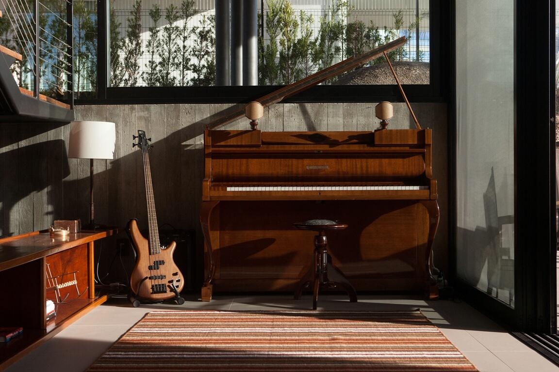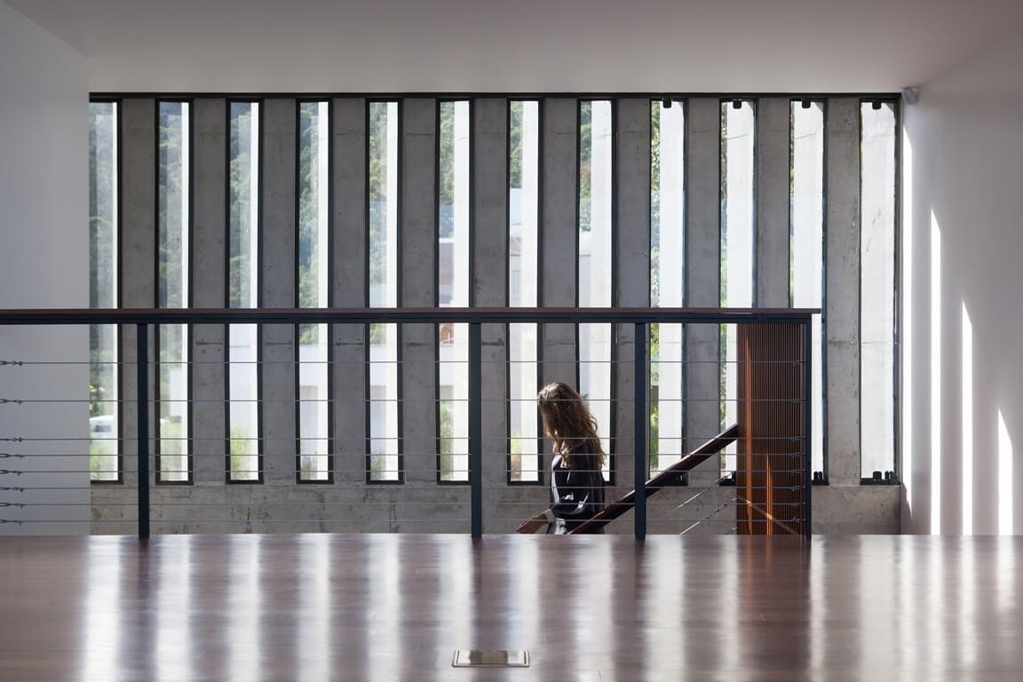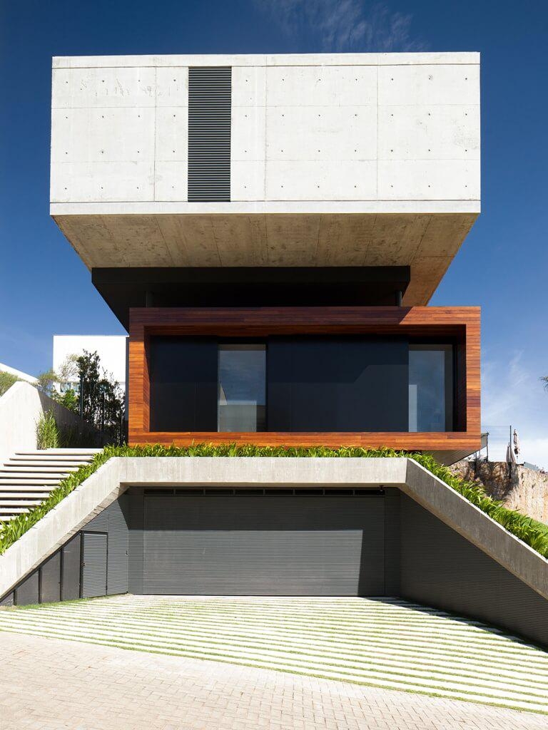 O resultado foi então uma casa "invertida". Áreas de convívio no 2o andar, áreas privadas no térreo. Comprometida ainda com o conceito original do "programa de necessidades", a casa tem todas as áreas de uso diário do casal no volume suspenso, com grande integração de todos os ambientes. Para usar palavras bastante conhecidas, um belo "loft", com quarto, sala, cozinha compartilhando um espaço único e voltado para a vista da baía, por cima da construção vizinha. O volume do térreo, fiel à sua tardia inserção no projeto, se destaca como um objeto à parte, tanto na sua geometria, desalinhada, quanto na sua materialidade, opondo ao concreto aparente do volume suspenso, o revestimento de madeira que o caracteriza e garante seu bom desempenho térmico. A garagem, enterrada no barranco que se ergue a partir da rua, "conversa" em outra lingua. Aqui as linhas se mimetizam com o formato do terreno e o gesto de abrir a entrada para os carros fica bem marcado pelas diagonais em concreto aparente, rústico, que se encarregam da contenção do solo.
