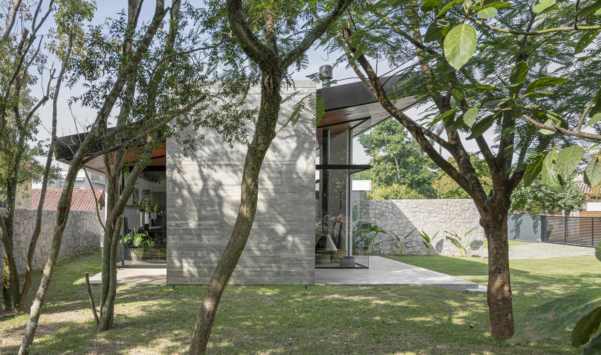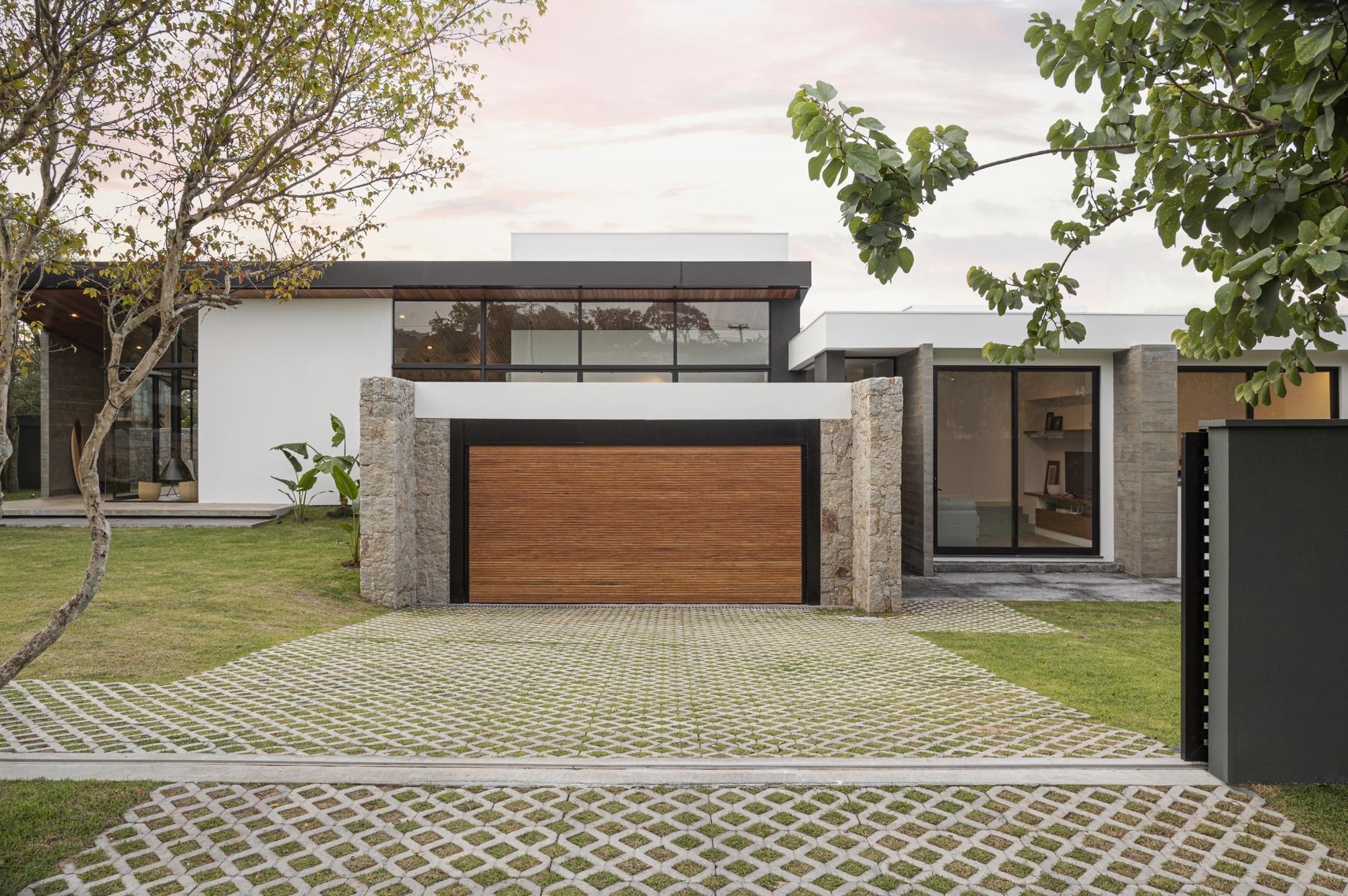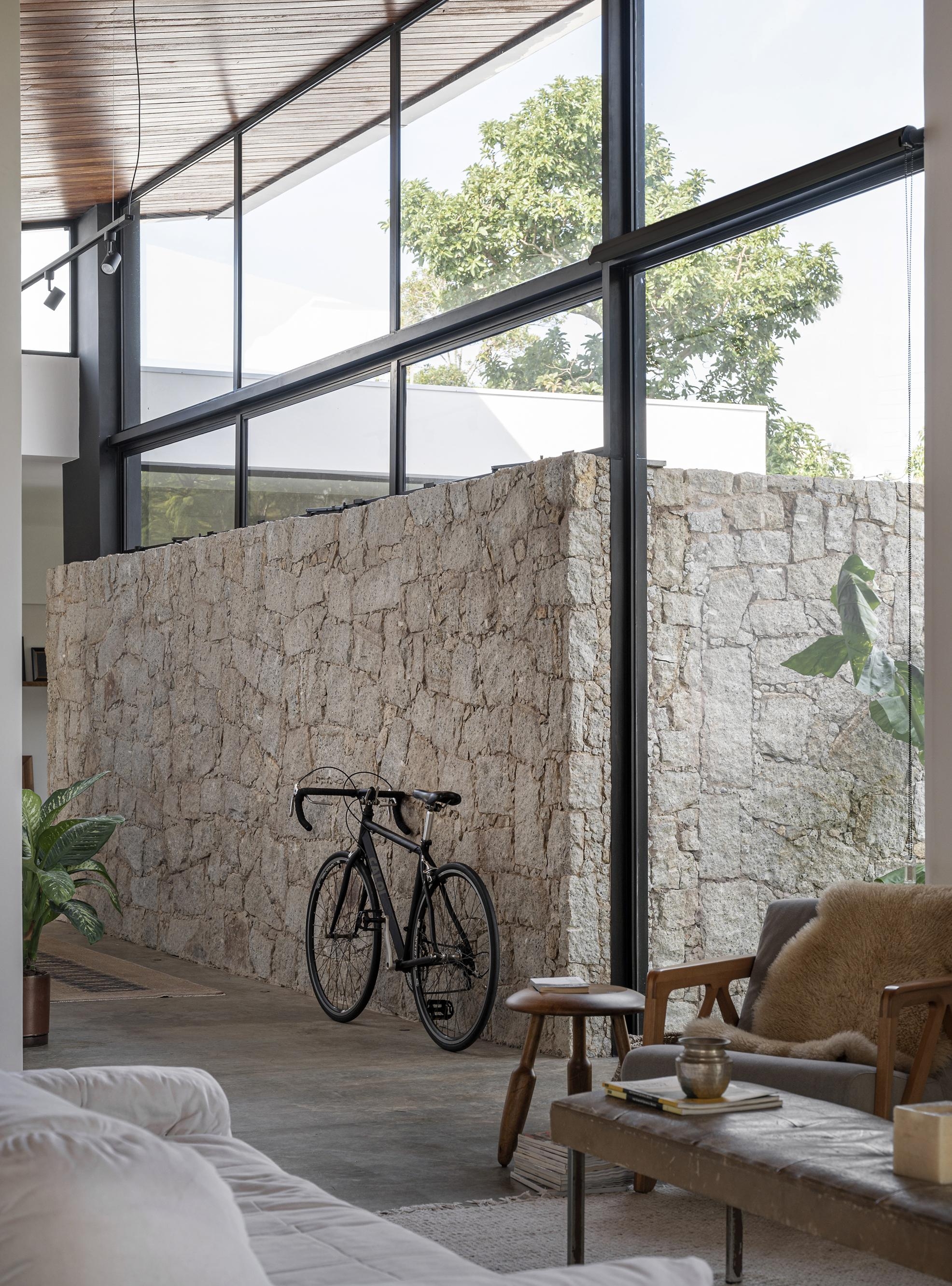 O volume de pedra da garagem, rebaixado em relação a casa, invade o eixo principal sinalizando sutilmente a distinção das áreas privativas. Sua altura garante permanente visual para o entorno arborizado.