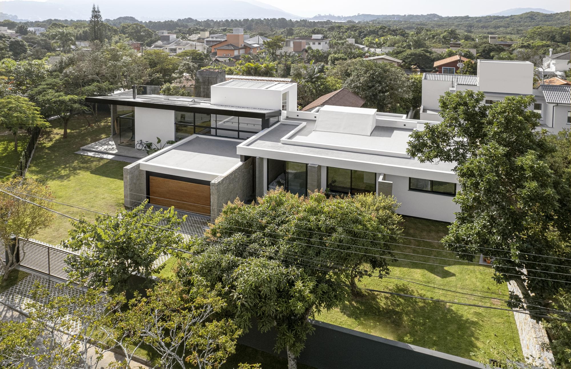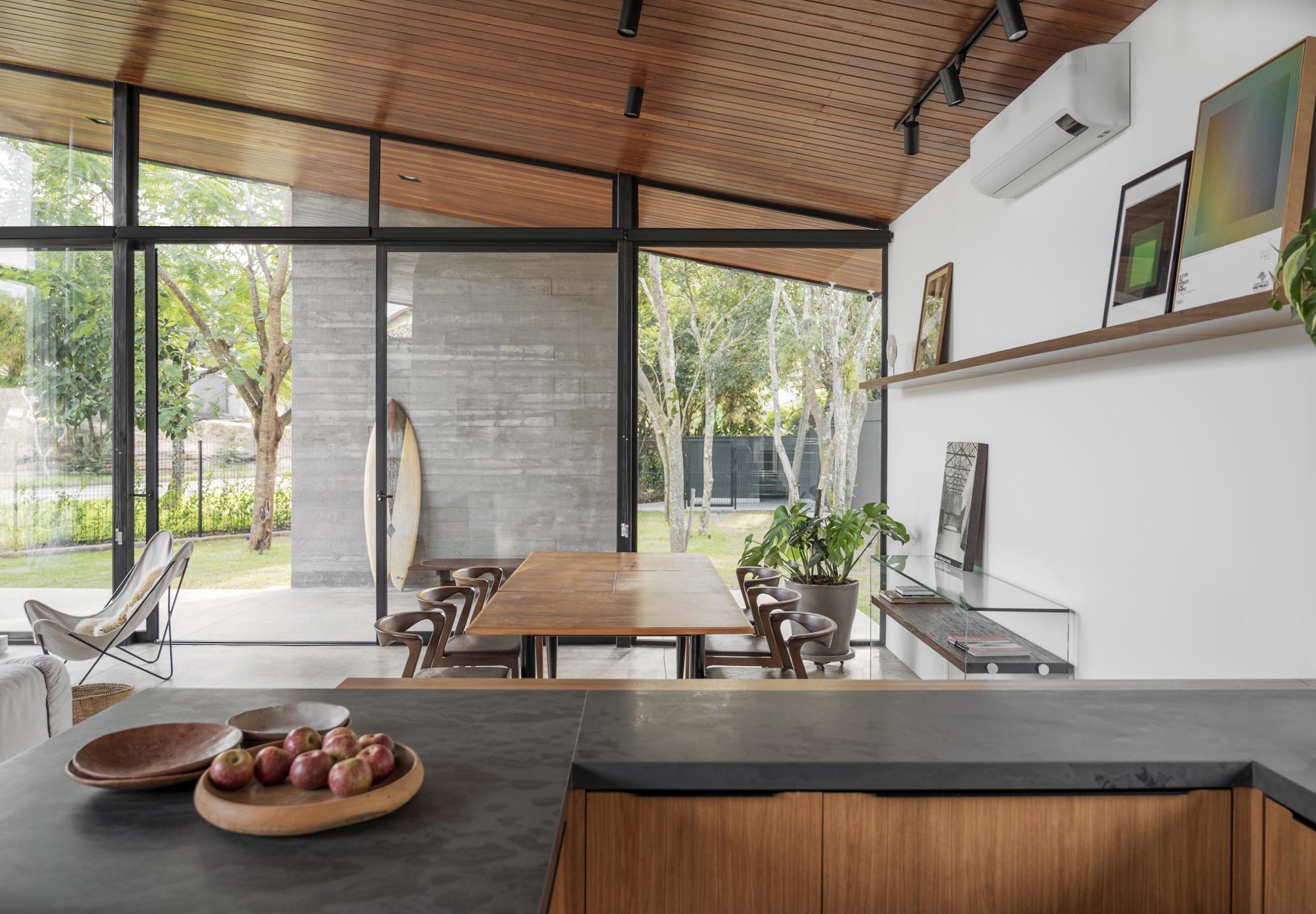 O partido desse projeto foi explorar a integração dos ambientes com o entorno arborizado.