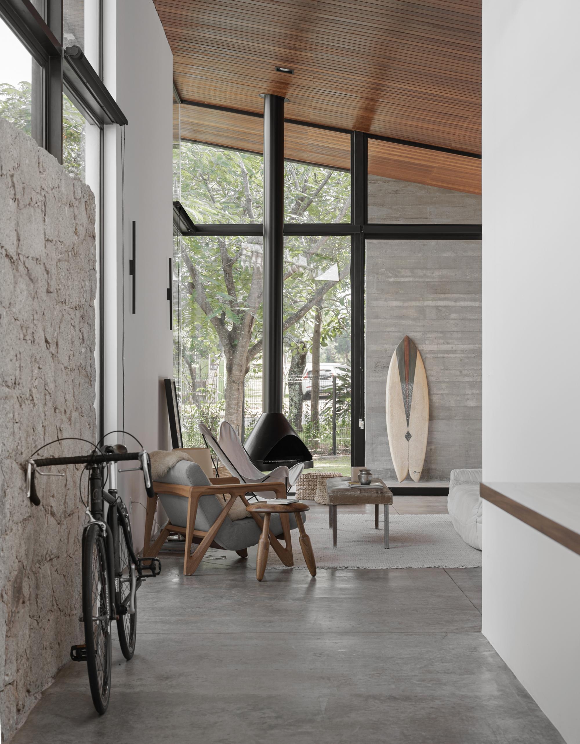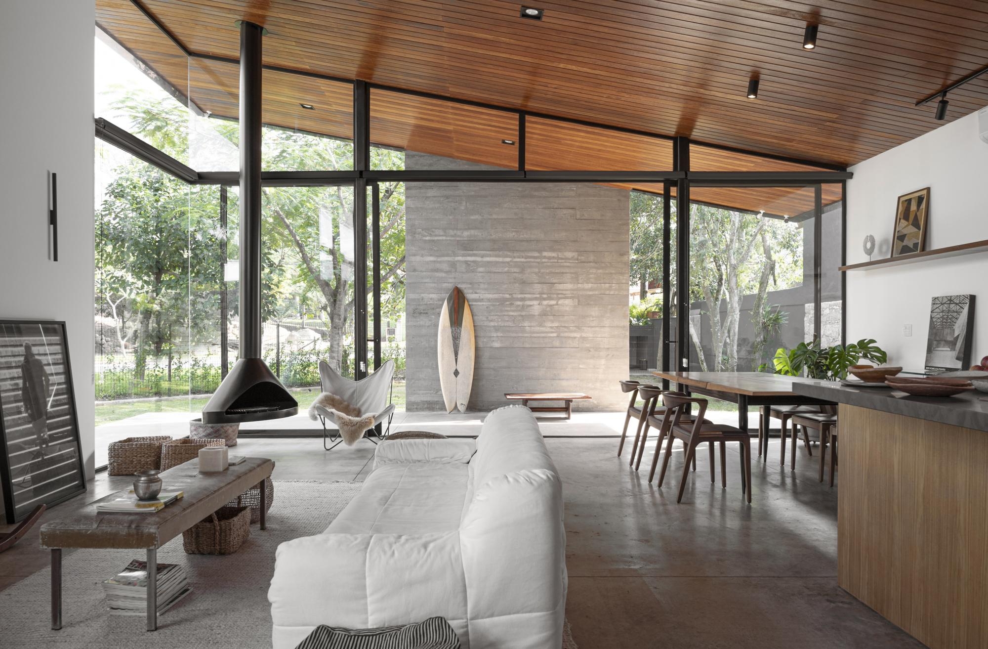Nos belos dias do inverno de Florianópolis, a ampla sala é aquecida pela lareira suspensa e o jardim é sempre o protagonista.