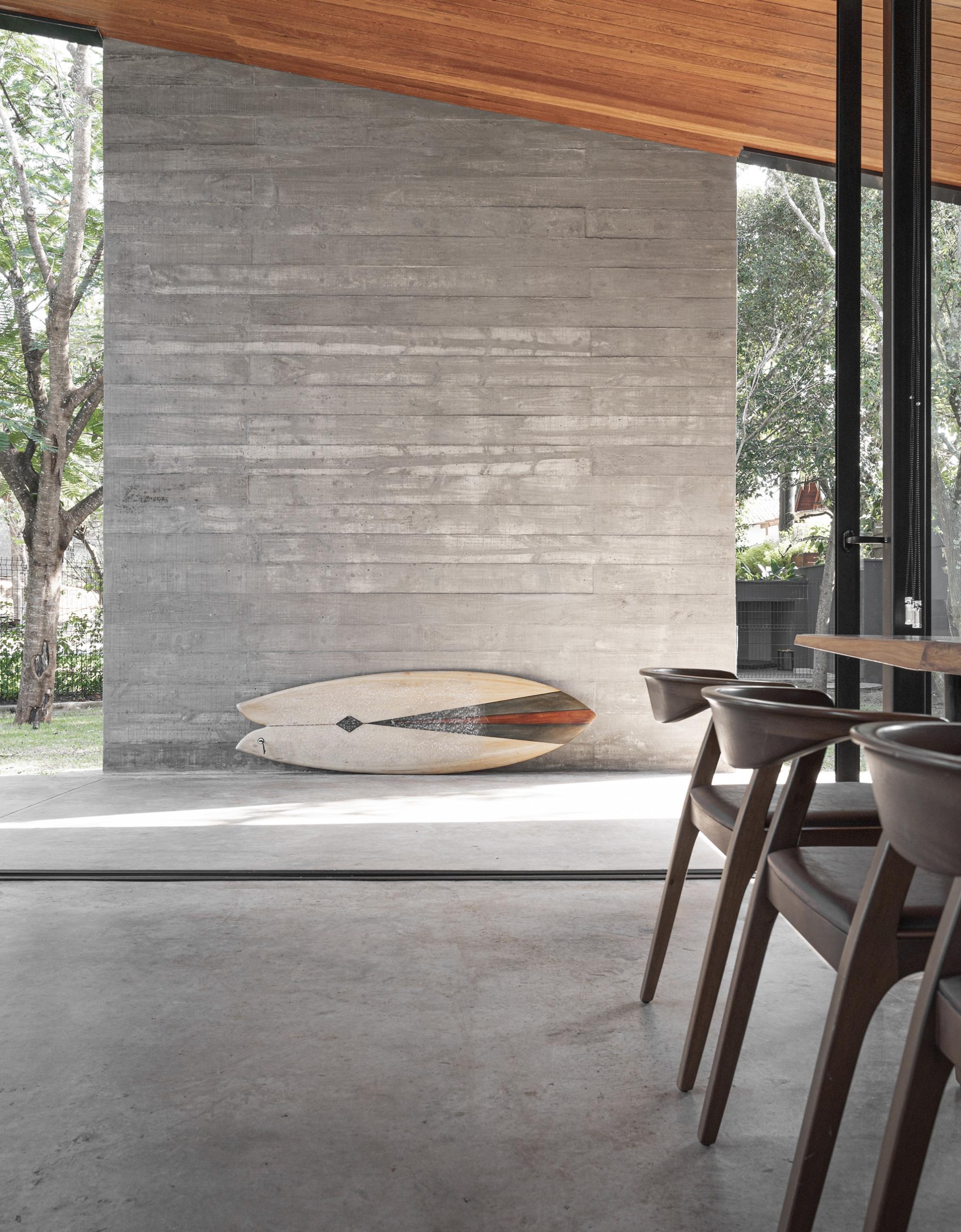 Internamente o painel de concreto delimita a varanda, espaço semi aberto onde se materializa a integração com o jardim.