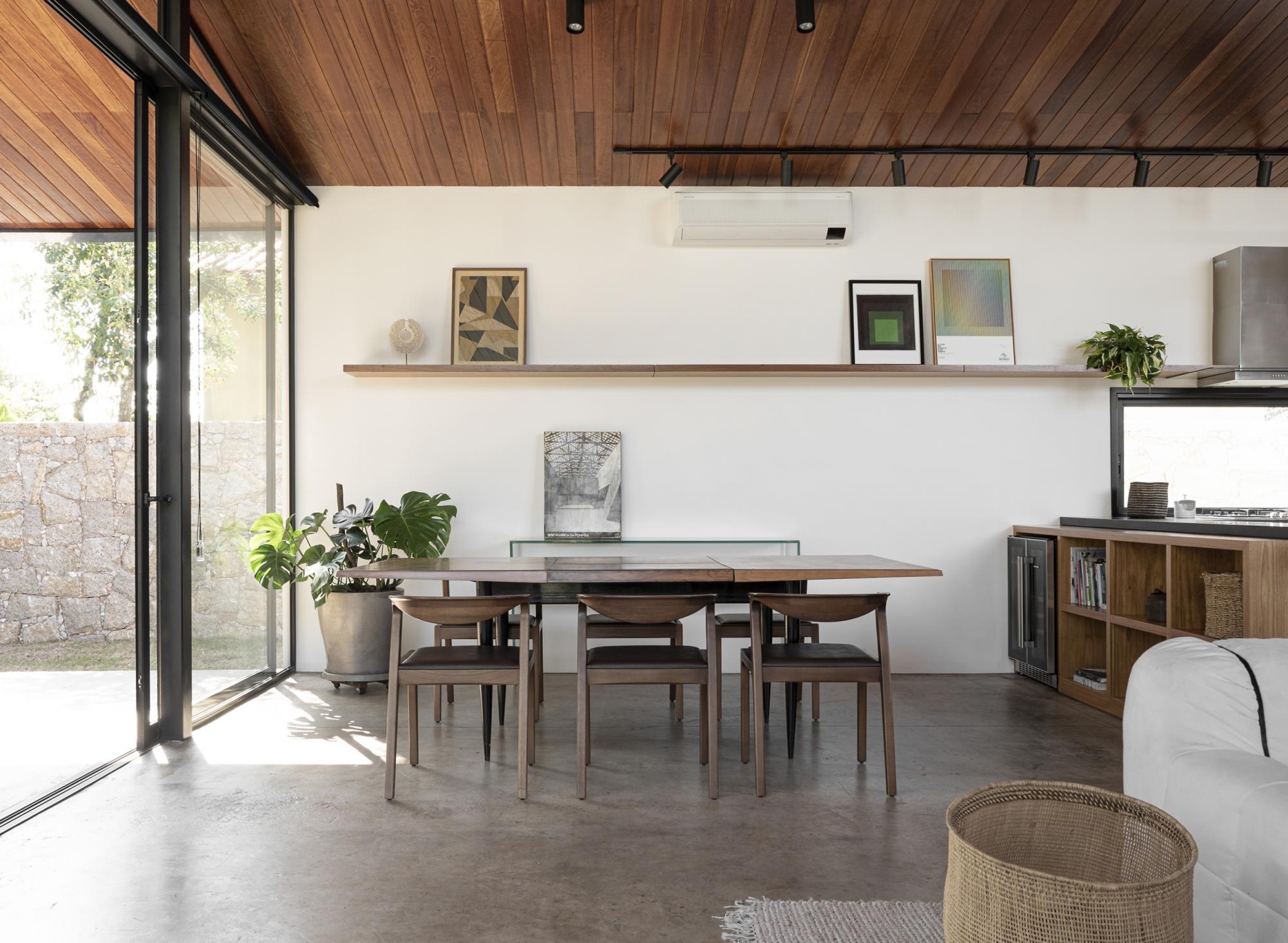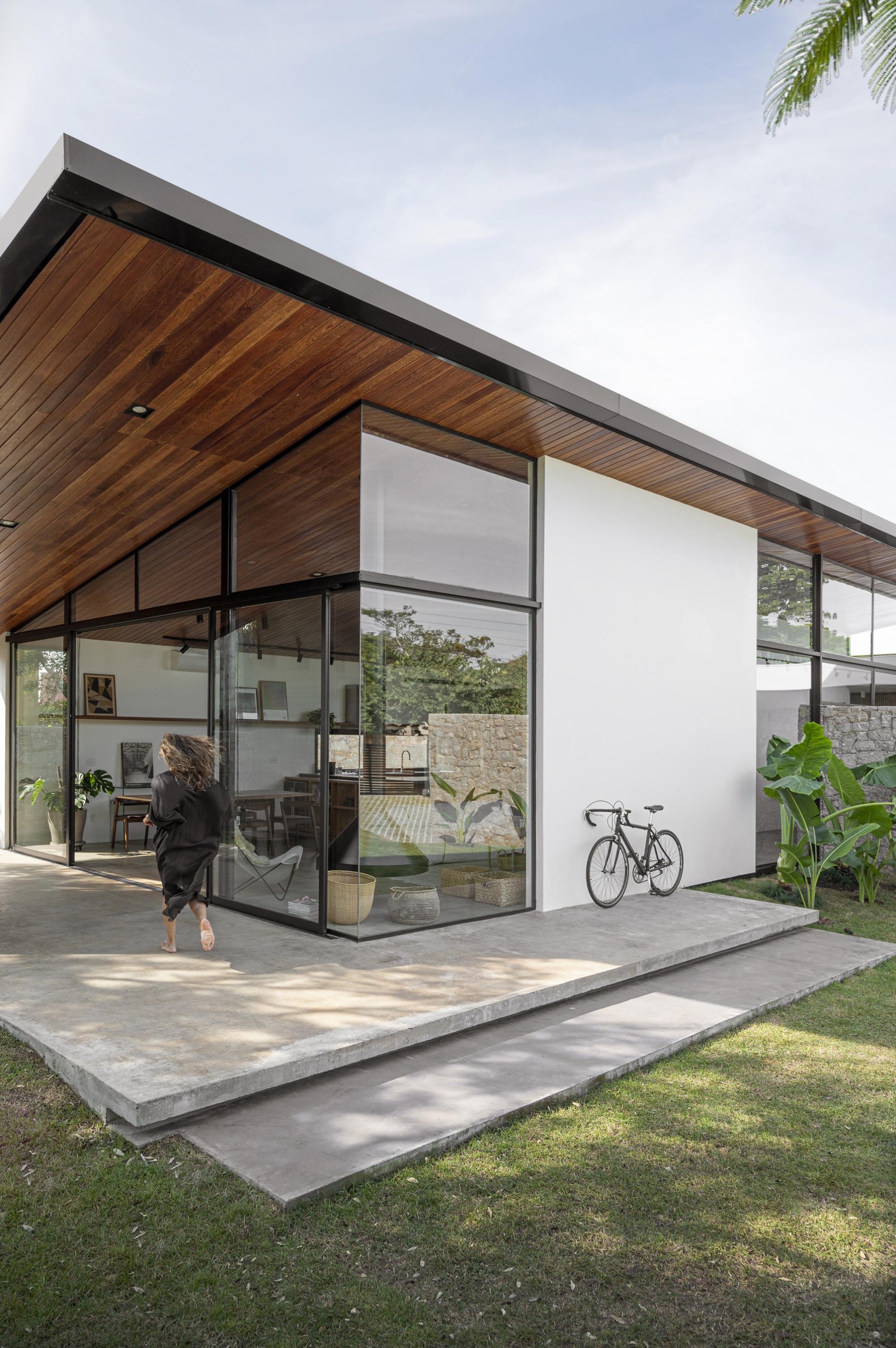 O forro inclinado em madeira e o amplo fechamento em vidro garantem uma integração visual e simbólica.