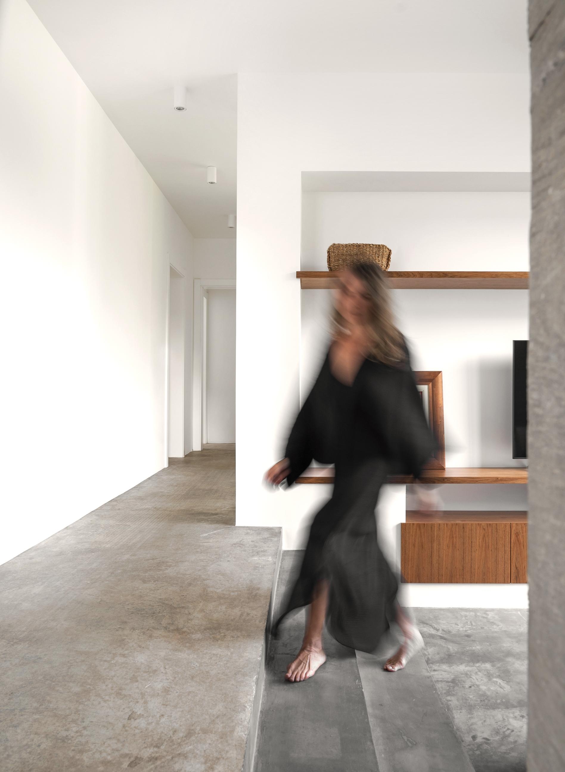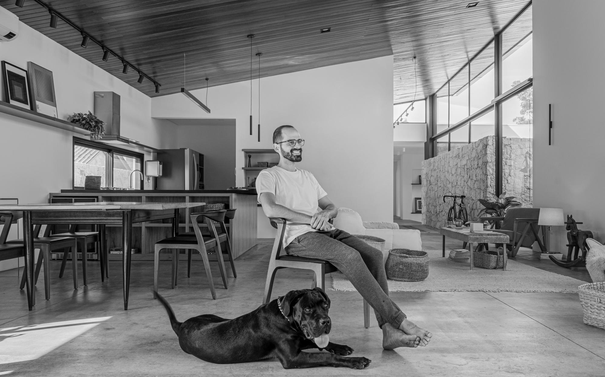 Na área privativa, um desnível atrai para a sala íntima da família.