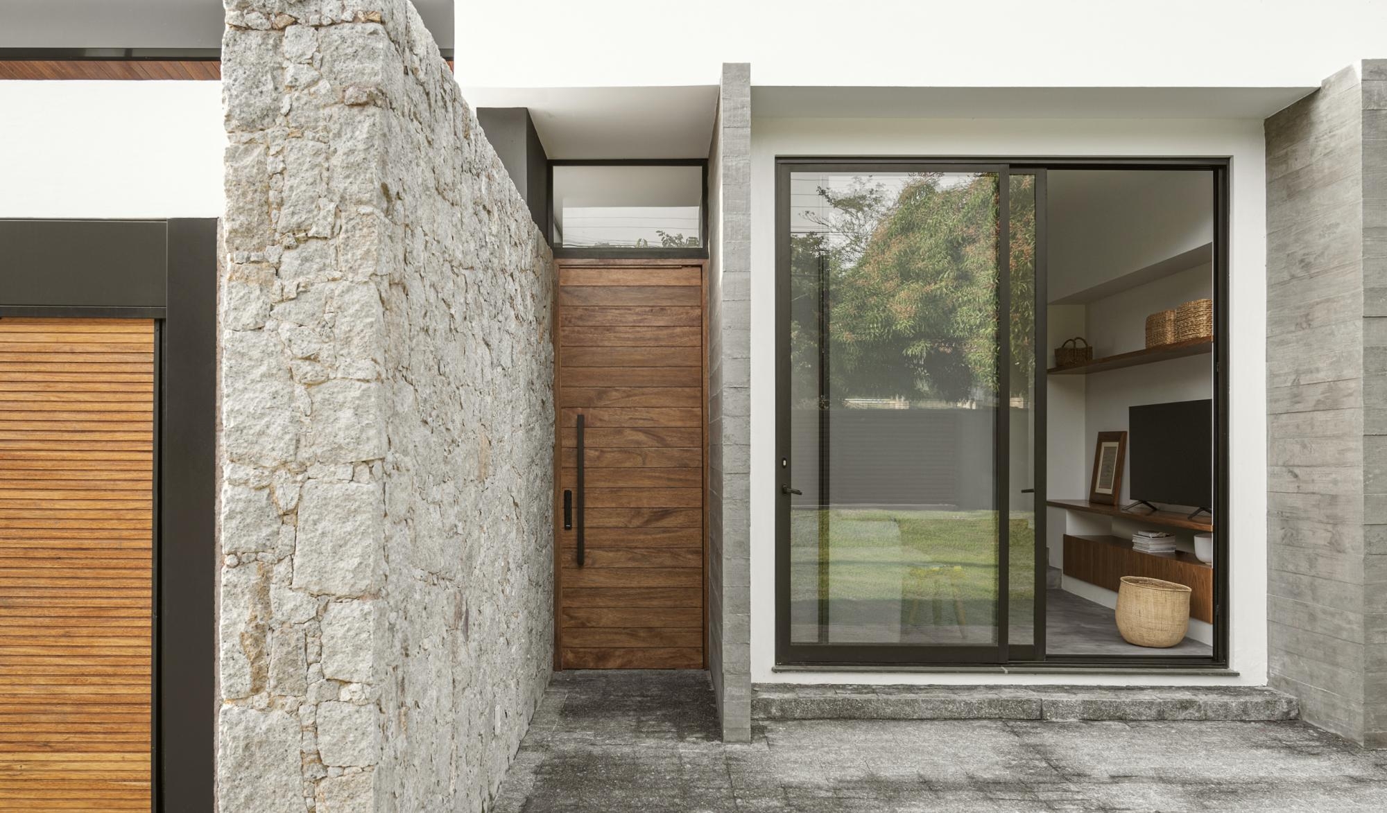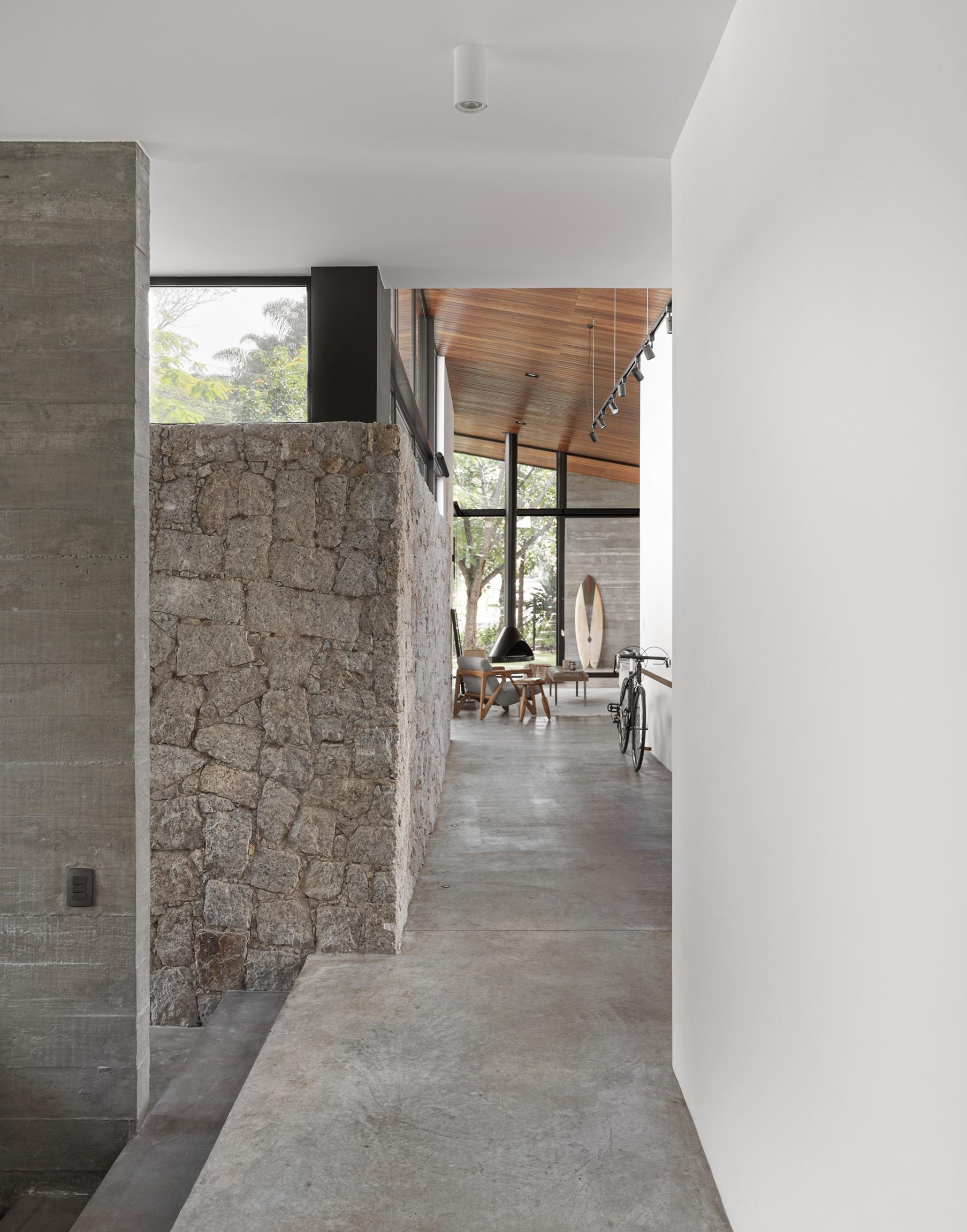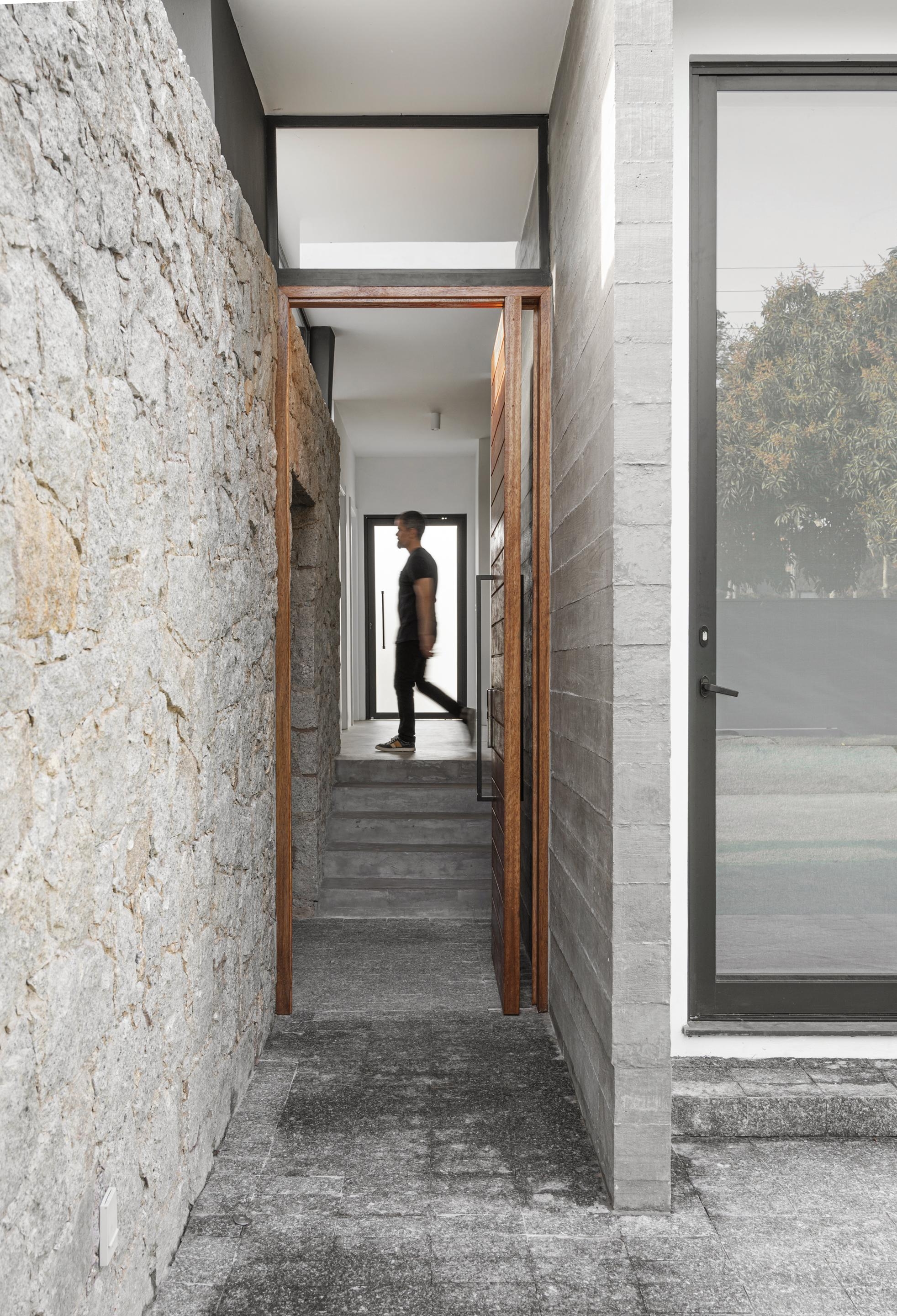 A entrada principal entre painéis de pedra e concreto, acessa diretamente o coração da casa de onde a circulação se distribui para as áreas sociais e privativas.
