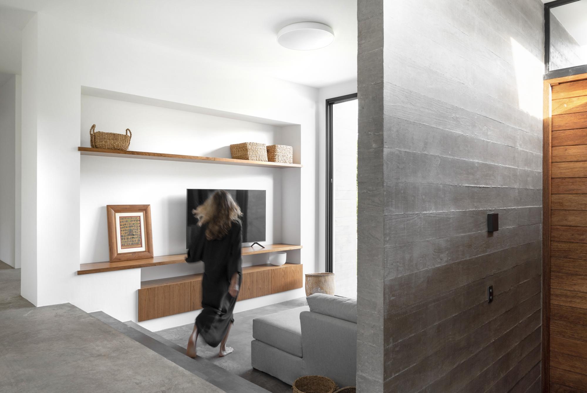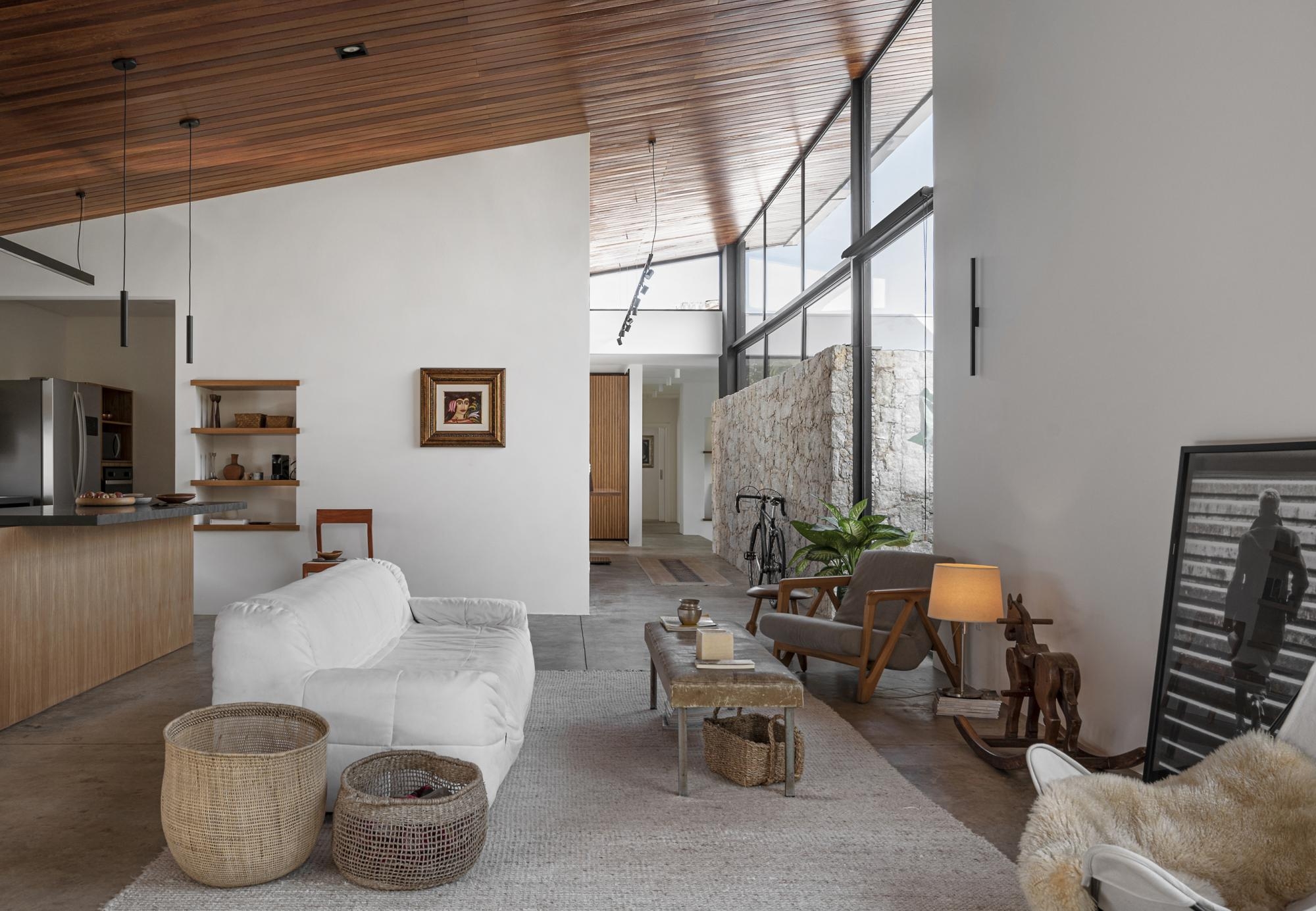 Da sala, os volumes que invadem o eixo principal funcionam como filtro para a área privativa da casa.